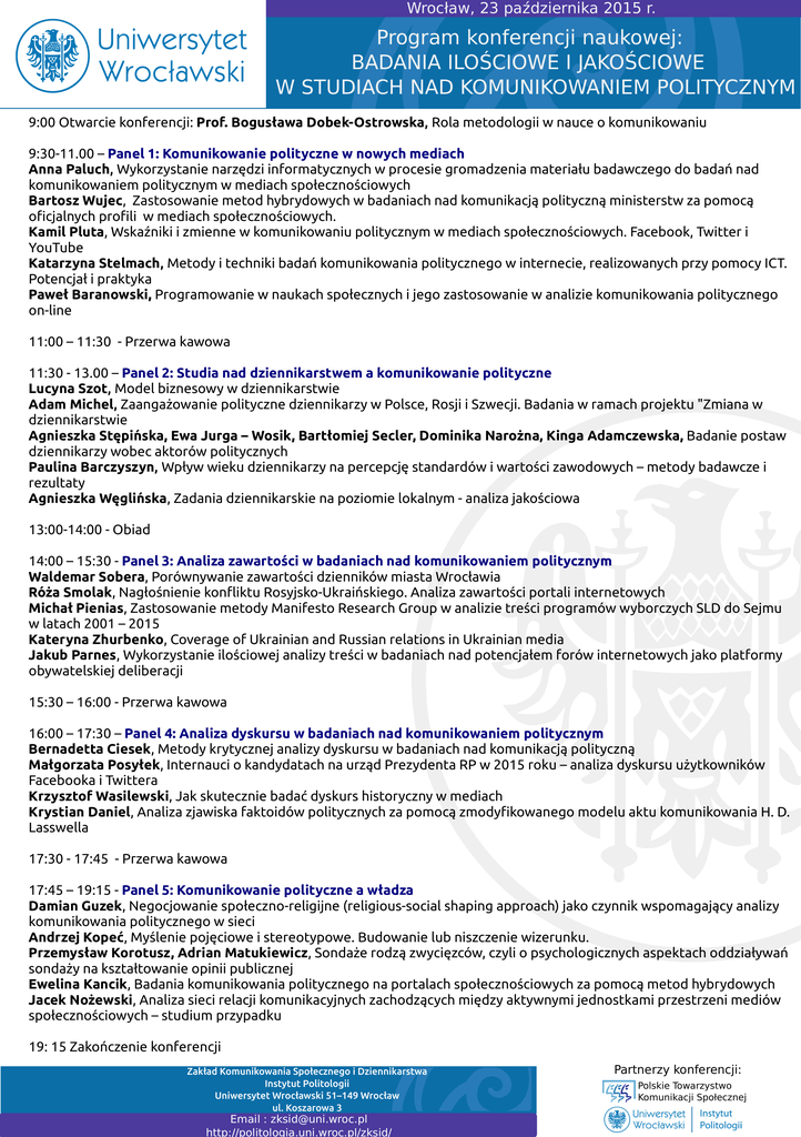 Wrocław, 23 października 2015 r. Program konferencji naukowej: BADANIA ILOŚCIOWE I JAKOŚCIOWE W STUDIACH NAD KOMUNIKOWANIEM POLITYCZNYM 9:00 Otwarcie konferencji: Prof. Bogusława Dobek-Ostrowska, Rola metodologii w nauce o komunikowaniu 9:30-11.00 – Panel 1: Komunikowanie polityczne w nowych mediach Anna Paluch, Wykorzystanie narzędzi informatycznych w procesie gromadzenia materiału badawczego do badań nad komunikowaniem politycznym w mediach społecznościowych Bartosz Wujec, Zastosowanie metod hybrydowych w badaniach nad komunikacją polityczną ministerstw za pomocą oficjalnych profili w mediach społecznościowych. Kamil Pluta, Wskaźniki i zmienne w komunikowaniu politycznym w mediach społecznościowych. Facebook, Twitter i YouTube Katarzyna Stelmach, Metody i techniki badań komunikowania politycznego w internecie, realizowanych przy pomocy ICT. Potencjał i praktyka Paweł Baranowski, Programowanie w naukach społecznych i jego zastosowanie w analizie komunikowania politycznego on-line 11:00 – 11:30 - Przerwa kawowa 11:30 - 13.00 – Panel 2: Studia nad dziennikarstwem a komunikowanie polityczne Lucyna Szot, Model biznesowy w dziennikarstwie Adam Michel, Zaangażowanie polityczne dziennikarzy w Polsce, Rosji i Szwecji. Badania w ramach projektu "Zmiana w dziennikarstwie Agnieszka Stępińska, Ewa Jurga – Wosik, Bartłomiej Secler, Dominika Narożna, Kinga Adamczewska, Badanie postaw dziennikarzy wobec aktorów politycznych Paulina Barczyszyn, Wpływ wieku dziennikarzy na percepcję standardów i wartości zawodowych – metody badawcze i rezultaty Agnieszka Węglińska, Zadania dziennikarskie na poziomie lokalnym - analiza jakościowa 13:00-14:00 - Obiad 14:00 – 15:30 - Panel 3: Analiza zawartości w badaniach nad komunikowaniem politycznym Waldemar Sobera, Porównywanie zawartości dzienników miasta Wrocławia Róża Smolak, Nagłośnienie konfliktu Rosyjsko-Ukraińskiego. Analiza zawartości portali internetowych Michał Pienias, Zastosowanie metody Manifesto Research Group w analizie treści programów wyborczych SLD do Sejmu w latach 2001 – 2015 Kateryna Zhurbenko, Coverage of Ukrainian and Russian relations in Ukrainian media Jakub Parnes, Wykorzystanie ilościowej analizy treści w badaniach nad potencjałem forów internetowych jako platformy obywatelskiej deliberacji 15:30 – 16:00 - Przerwa kawowa 16:00 – 17:30 – Panel 4: Analiza dyskursu w badaniach nad komunikowaniem politycznym Bernadetta Ciesek, Metody krytycznej analizy dyskursu w badaniach nad komunikacją polityczną Małgorzata Posyłek, Internauci o kandydatach na urząd Prezydenta RP w 2015 roku – analiza dyskursu użytkowników Facebooka i Twittera Krzysztof Wasilewski, Jak skutecznie badać dyskurs historyczny w mediach Krystian Daniel, Analiza zjawiska faktoidów politycznych za pomocą zmodyfikowanego modelu aktu komunikowania H. D. Lasswella 17:30 - 17:45 - Przerwa kawowa 17:45 – 19:15 - Panel 5: Komunikowanie polityczne a władza Damian Guzek, Negocjowanie społeczno-religijne (religious-social shaping approach) jako czynnik wspomagający analizy komunikowania politycznego w sieci Andrzej Kopeć, Myślenie pojęciowe i stereotypowe. Budowanie lub niszczenie wizerunku. Przemysław Korotusz, Adrian Matukiewicz, Sondaże rodzą zwycięzców, czyli o psychologicznych aspektach oddziaływań sondaży na kształtowanie opinii publicznej Ewelina Kancik, Badania komunikowania politycznego na portalach społecznościowych za pomocą metod hybrydowych Jacek Nożewski, Analiza sieci relacji komunikacyjnych zachodzących między aktywnymi jednostkami przestrzeni mediów społecznościowych – studium przypadku 19: 15 Zakończenie konferencji Zakład Komunikowania Społecznego i Dziennikarstwa Instytut Politologii Uniwersytet Wrocławski 51–149 Wrocław ul. Koszarowa 3 Email : [email protected] http://politologia.uni.wroc.pl/zksid/ Partnerzy konferencji: Polskie Towarzystwo Komunikacji Społecznej