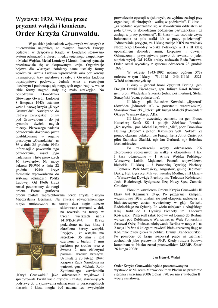 Wystawa: 1939. Wojna przez pryzmat wstążki i kamienia. Order Krzyża Grunwaldu. W polskich jednostkach wojskowych walczących z hitlerowskim najeźdźcą na różnych frontach Europy będących w dyspozycji Rządu w Londynie stosowano system odznaczeń z okresu międzywojennego uzupełniony o Medal Wojska, Medal Lotniczy i Morski. Inaczej sytuacja przedstawiała się w okupowanym kraju. Organizacje bojowe dla własnych żołnierzy same ustalały formy wyróżnień. Armia Ludowa wprowadziła orła bez korony trzymającego trzy metalowe strzały, a Gwardia Ludowa trzystopniowe pochwały. Jednak wraz z rozwojem liczebnym i podnoszącą się rangą tych organizacji w walce takie formy nagród stały się mało atrakcyjne. Na posiedzeniu Dowództwa Głównego Gwardii Ludowej 8 listopada 1943r ustalono wzór i nazwę krzyża „Krzyż Grunwaldu”. Nawiązano do tradycji zwycięskiej bitwy pod Grunwaldem i do jej symbolu dwóch nagich mieczy. Pierwszego nadania odznaczenia dokonano przez opublikowanie w organie prasowym „Gwardzista” nr 36 z dnia 25 grudnia 1943r informacji o powstaniu tego odznaczenia, zasad jego nadawania i listę pierwszych 30 kawalerów. Na mocy dekretu PKWN z dnia 22 grudnia 1944r krzyż formalnie wprowadzono do systemu odznaczeń Polski Ludowej. Od 1960r krzyż został podniesiony do rangi orderu. Forma graficzna orderu została zaprojektowana przez artystę plastyka Mieczysława Bermana. Na awersie równoramiennego krzyża umieszczono na tarczy dwa nagie miecze skierowane ostrzami w dół, na rewersie na tarczy w trzech wierszach napis 1410/KG/1944. Krzyż podzielono na trzy klasy i określono barwy wstążki. Przyjęto , że wstążka ma szerokość 35 mm i jest czerwona z białym 7 mm paskiem po środku oraz z dwoma 2 mm zielonymi paskami wzdłuż brzegów. Uchwałą z 20 lutego 1944r Krajowa Rada Narodowa na wniosek gen. Michała RoliŻymierskiego zatwierdziła „Krzyż Grunwaldu” jako odznaczenie wojskowe i sprecyzowała kwalifikacje czynów i zasług, stanowiących podstawę do przyznawania odznaczenia w poszczególnych klasach. I klasa mogła być nadana „za zwycięskie prowadzenie operacji wojskowych, za wybitne zasługi przy organizacji sił zbrojnych i walkę w podziemiu”. II klasa – „za wybitne wyróżnianie się w dowodzeniu oddziałem na polu bitwy, w dowodzeniu oddziałem partyzanckim i za zasługi w pracy poziemnej”. III klasa – „za osobiste czyny bohaterskie na polu walki lub w pracy podziemnej”. Jednocześnie przyjęto, że I klasę nadaje KRN na wniosek Naczelnego Dowódcy Wojska Polskiego, a II i III klasę upoważnieni dowódcy armii, korpusów i dywizji. Odznaczonym przysługiwało prawo do awansu o jeden stopień wyżej. Od 1952r ordery nadawała Rada Państwa. Order został wycofany z systemu odznaczeń 23 grudnia 1992r. W okresie 1943-1992 nadano ogółem 5738 orderów w tym I klasy – 71, II kl – 346, III kl – 5321. Wśród odznaczonych są: I klasy – generał broni Zygmunt Berling, gen. Dwight Dawid Eisenhower, gen. Juliusz Karol Rómmel, gen. broni Władysław Sikorski (odzn. pośmiertnie), Stefan Starzyński (odzn. pośmiertnie). II klasy – płk Bolesław Kowalski „Ryszard” (dowódca jednostek AL w powstaniu warszawskim), Stanisław Nowicki „Felek”, płk Justyn Małecki (komendant Okręgu Warszawskiego AK). III klasy – uczestnicy zamachu na gen Franza Kutscherę Szefa SS i policji: Zdzisław Poradzki „Kruszynka”, por. Michał Isajewicz „Miś”, ppor. Bronisław Hellwig „Brono” i pchor. Kazimierz Sott „Sokół”. Za pomoc okazaną polakom we Francji Irena Joliot Curie, płk pilot Stanisław Skalski, mjr Jan Gerhard, mjr Bolesław Maślankiewicz. Po zakończeniu wojny odznaczono 207 zbiorowości społecznych za walkę z okupantem. I tak: I kasą odznaczono – 1 Armię Wojska Polskiego, Warszawę, Lublin, Majdanek, Poznań, województwo kieleckie, II klasą – 3 Pomorską Dywizję Piechoty, 1 Pomorski Pułk Możdzieży, Augustów, gminę Babimost, Duklę, Hel, Łęczycę, Mławę, twierdzę Modlin, a III klasą – 1 Warszawską Dywizję Piechoty im. Tadeusza Kościuszki, Jasło, Białobrzegi. Bydgoszcz, Iłżę, Nowy Sącz, Zamość, Ćmielów. Płockim kawalerem Orderu Krzyża Grunwaldu III klasy był Kazimierz Otap. Po przegranej kampanii wrześniowej 1939r znalazł się pod okupacją radziecką i z białostocczyzny został wywieziony w głąb Związku Radzieckiego na Syberię. Po wielu udrękach z Ałtajskiego Kraju trafił do 1 Dywizji Piechoty im. Tadeusza Kościuszki. Przeszedł szlak bojowy od Lenino do Berlina, walczył pod Dęblinem, o Warszawę, na Wale Pomorskim, forsował Odrę. Podczas zdobywania Berlina w nocy z 1 na 2 maja 1945r z 4 kolegami zawiesił biało-czerwoną flagę na Kolumnie Zwycięstwa w pobliżu Bramy Brandenburskiej. Po powrocie do kraju rozpoczął pracę na ziemiach zachodnich jako pracownik PKP. Kiedy ruszyła budowa kombinatu w Płocku został pracownikiem MZRiP. Zmarł 26 lutego 2006r. Jan Henryk Waluś Order Krzyża Grunwaldu będzie prezentowany na wystawie w Muzeum Mazowieckim w Płocku na przełomie sierpnia i września 2009r z okazji 70. rocznicy wybuchu II wojny światowej.