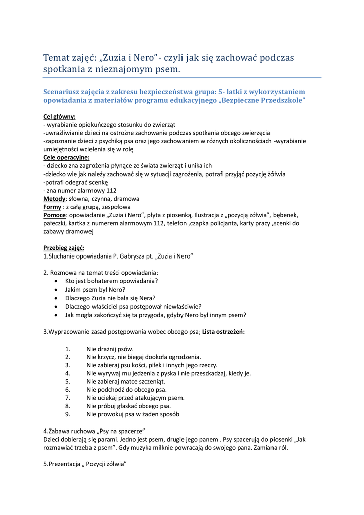 Temat zajęć : „Zuzia i Nero”- ćzyli jak się zaćhować podćzas spotkania z nieznajomym psem. Scenariusz zajęcia z zakresu bezpieczeństwa grupa: 5- latki z wykorzystaniem opowiadania z materiałów programu edukacyjnego „Bezpieczne Przedszkole” Cel główny: - wyrabianie opiekuńczego stosunku do zwierząt -uwrażliwianie dzieci na ostrożne zachowanie podczas spotkania obcego zwierzęcia -zapoznanie dzieci z psychiką psa oraz jego zachowaniem w różnych okolicznościach -wyrabianie umiejętności wcielenia się w rolę Cele operacyjne: - dziecko zna zagrożenia płynące ze świata zwierząt i unika ich -dziecko wie jak należy zachować się w sytuacji zagrożenia, potrafi przyjąć pozycję żółwia -potrafi odegrać scenkę - zna numer alarmowy 112 Metody: słowna, czynna, dramowa Formy : z całą grupą, zespołowa Pomoce: opowiadanie „Zuzia i Nero”, płyta z piosenką, Ilustracja z „pozycją żółwia”, bębenek, pałeczki, kartka z numerem alarmowym 112, telefon ,czapka policjanta, karty pracy ,scenki do zabawy dramowej Przebieg zajęć: 1.Słuchanie opowiadania P. Gabrysza pt. „Zuzia i Nero” 2. Rozmowa na temat treści opowiadania: Kto jest bohaterem opowiadania? Jakim psem był Nero? Dlaczego Zuzia nie bała się Nera? Dlaczego właściciel psa postępował niewłaściwie? Jak mogła zakończyć się ta przygoda, gdyby Nero był innym psem? 3.Wypracowanie zasad postępowania wobec obcego psa; Lista ostrzeżeń: 1. 2. 3. 4. 5. 6. 7. 8. 9. Nie drażnij psów. Nie krzycz, nie biegaj dookoła ogrodzenia. Nie zabieraj psu kości, piłek i innych jego rzeczy. Nie wyrywaj mu jedzenia z pyska i nie przeszkadzaj, kiedy je. Nie zabieraj matce szczeniąt. Nie podchodź do obcego psa. Nie uciekaj przed atakującym psem. Nie próbuj głaskać obcego psa. Nie prowokuj psa w żaden sposób 4.Zabawa ruchowa „Psy na spacerze” Dzieci dobierają się parami. Jedno jest psem, drugie jego panem . Psy spacerują do piosenki „Jak rozmawiać trzeba z psem”. Gdy muzyka milknie powracają do swojego pana. Zamiana ról. 5.Prezentacja „ Pozycji żółwia” 6.Zabawa ruchowa „Groźny pies” Dzieci spacerują po sali. Na odgłos bębenka (zaangażowanie dziecka objętego planem działań spierających- ćwiczenie ruchów naprzemiennych) sygnalizującego zbliżanie się groźnego psa dzieci przyjmują pozycję żółwia. Zabawę powtarzamy trzykrotnie. 7.Przypomnienie numeru alarmowego 112 – scenki dramowe „Umiem wezwać pomoc” Dzieci w trzech zespołach losują scenki sytuacyjne związane z zagrożeniem atakiem przez psa i przedstawiają je pozostałym dzieciom. 8. Karta pracy –rysowanie po śladzie i wyklejanie plasteliną numeru alarmowego Opracowała: Sylwia Ostrowska Miejskie Przedszkole Integracyjne nr 5 w Legionowie
