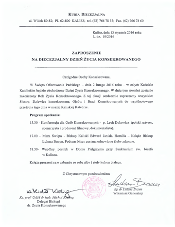 K uria D iecezjalna ul. Widok 80-82; PL 62-800 KALISZ; tel. (62) 766 78 55; Fax. (62) 766 78 60 Kalisz, dnia 13 stycznia 2016 roku L. dz. 10/2016 ZAPROSZENIE NA DIECEZJALNY DZIEŃ ŻYCIA KONSEKROWANEGO Czcigodne Osoby Konsekrowane, W Święto Ofiarowania Pańskiego - dnia 2 lutego 2016 roku - w całym Kościele Katolickim będzie obchodzony Dzień Życia Konsekrowanego. W dniu tym również zostanie zakończony Rok Życia Konsekrowanego. Z tej okazji serdecznie zapraszamy wszystkie: Siostry, Dziewice konsekrowane, Ojców i Braci Konsekrowanych do wspólnotowego przeżycia tego dnia w naszej Kaliskiej Katedrze. Program spotkania: 15.30 - Konferencja dla Osób Konsekrowanych - p. Lech Dokowicz (polski reżyser, scenarzysta i producent filmowy, dokumentalista). 17.00 - Msza Święta - Biskup Kaliski Edward Janiak. Homilia - Ksiądz Biskup Łukasz Buzun. Podczas Mszy zostaną odnowione śluby zakonne. 18.30- Wspólny posiłek w Domu Pielgrzyma przy Sanktuarium św. Józefa w Kaliszu. Księża proszeni są o zabranie ze sobą alby i stuły koloru białego. ds. Życia Konsekrowanego
