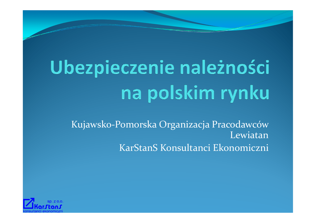 Kujawsko-Pomorska Organizacja Pracodawców Lewiatan KarStanS Konsultanci Ekonomiczni Największe podmioty na rynku TU Euler Hermes SA (62%) Coface Austria Kreditversicherung AG O/Polska (10%) Korporacja Ubezpieczenia Kredytów Eksportowych SA (11%) Atradius Credit Insurance N.V. SA Oddział w Polsce (9%) Powszechny Zakład Ubezpieczeń SA (3%) Jak przebiega ubezpieczenie Określenie przedmiotu i warunków ubezpieczenia Dokonanie podziału klientów Wyłączonych spod ochrony – największych, pewnych. Nazwanych – dokonanie ratingu przez ubezpieczyciela i wyznaczenie limitu kredytowego Nienazwanych – z limitem automatycznym Korzystanie z bazy danych o kontrahentach – ubezpieczyciela - ratingi i limity wyliczone przez system Ew. wypłata ubezpieczenia w przypadku niewypłacalnosci dłużnika Platforma internetowa - baza danych o kontrahentach Dane formalno-prawne Lista limitów kredytowych dla poszczególnych kontrahentów - z datą przyznania, Historia limitu kredytowego Rating kontrahenta Historia windykacji Raporty o kontrahentach – sumy zadłużenia - ogólne i wobec branży Przedmiot ubezpieczenia Należności bezsporne, powstałe w okresie ubezpieczenia z tytułu sprzedaży oraz dostaw, które ubezpieczający wykonał dla firm, które mają zostać objęte ubezpieczeniem Dokumentacja potwierdzająca bezsporność Obrót z wyspecyfikowanymi kontrahentami – np. Wszyscy hurtownicy Sektor przemysłowy z obrotami w poprzednim roku poniżej XXX tys. zł Należność główna, koszty windykacji, odsetki Wypłata kwoty ubezpieczenia Niewypłacalność potwierdzona prawnie Likwidacja Wniosek o układ Nieskuteczna egzekucja Niewypłacalność domniemana lub faktyczna Od 90 dni do 150 dni Udział własny Dla Klientów dla których limity kredytowe są ustalane przez Ubezpieczyciela Dla Klientów dla których limity kredytowe są ustalane przez Ubezpieczającego Okres odzyskania należności Termin płatności dla kontrahenta - np. 120 dni 2. Okres prolongaty - np. 60 dni 3. Maksymalny okres kredytu i prolongaty np. 120 dni 1. Zgłoszenie do ubezpieczyciela od daty wymagalności faktury - np. 60 dni 2. Maksymalny okres do stwierdzenia faktycznej niewypłacalności - np. 90 dni 1. Okres oczekiwania - od 120 dni (przy 30 dniowym terminie płatności) do 300 dni (przy 120 dniowym terminie płatności) Opłaty Składka % od obrotu – zazwyczaj przyjmowana jest też minimalna składka roczna w wart. bezwzględnych Opłata za rating kontrahenta Opłaty za interwencję (np. koszty windykacji ubezpieczonej i nieubezpieczonej części) Opłata za użytkowanie serwisu internetowego Inne warunki Maksymalna wypłata ubezpieczenia liczona od zapłaconej składki (np. 30 krotność składki) Okres płatności Klienta Próg należności przeterminowanych nie powodujących obowiązku zgłoszenia do windykacji Sposób określania limitu kredytowego (automatycznego) dla klientów nienazwanych Warunki udzielenia limitu automatycznego (np. 3 opłacone transakcje i brak szkód w ciągu 12 m-cy) Należności niezgłaszane do windykacji Wyłączenia odpowiedzialności Premie z niską szkodowość/zwrot składki KarStanS Sp. z o.o. konsultanci ekonomiczni ul. Św. Katarzyny 4a/2 87-100 Toruń tel.: 0-56 652-13-63 (64) fax: 0-56 652-13-64 e-mail: [email protected] www.karstans.pl