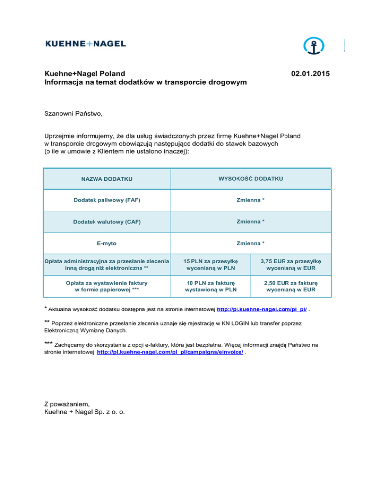 Kuehne+Nagel Poland Informacja na temat dodatków w transporcie drogowym 02.01.2015 Szanowni Państwo, Uprzejmie informujemy, że dla usług świadczonych przez firmę Kuehne+Nagel Poland w transporcie drogowym obowiązują następujące dodatki do stawek bazowych (o ile w umowie z Klientem nie ustalono inaczej): NAZWA DODATKU WYSOKOŚĆ DODATKU Dodatek paliwowy (FAF) Zmienna * Dodatek walutowy (CAF) Zmienna * E-myto Zmienna * Opłata administracyjna za przesłanie zlecenia inną drogą niż elektroniczna ** 15 PLN za przesyłkę wycenianą w PLN 3,75 EUR za przesyłkę wycenianą w EUR Opłata za wystawienie faktury w formie papierowej *** 10 PLN za fakturę wystawioną w PLN 2,50 EUR za fakturę wycenianą w EUR * Aktualna wysokość dodatku dostępna jest na stronie internetowej http://pl.kuehne-nagel.com/pl_pl/ . ** Poprzez elektroniczne przesłanie zlecenia uznaje się rejestrację w KN LOGIN lub transfer poprzez Elektroniczną Wymianę Danych. *** Zachęcamy do skorzystania z opcji e-faktury, która jest bezpłatna. Więcej informacji znajdą Państwo na stronie internetowej: http://pl.kuehne-nagel.com/pl_pl/campaigns/einvoice/ . Z poważaniem, Kuehne + Nagel Sp. z o. o. Kuehne+Nagel Poland Information about surcharges in Overland transport 02.01.2015 Dear Sir or Madame, Please kindly be informed that the following surcharges are applicable for Overland services provided by Kuehne+Nagel Sp z o.o. (unless there are no other agreements with Customer included in the contract): SURCHARGE AMOUNT Fuel Adjustment Factor (FAF) Variable * Currency Adjustment Factor (CAF) Variable * Toll Variable * Administration fee for orders sent not ellectronically ** Paper invoice fee *** 15 PLN per shipment quoted in PLN 3,75 EUR per shipment quoted in EUR 10 PLN per invoice issued in 2,50 EUR per invoice issued PLN in EUR * The current rates are published on the website http://pl.kuehne-nagel.com/pl_pl/ . ** For Orders sent via KN Login or using Electronic Data Interchange, administration fee will be not applied. *** We invite you to try our e-invoicing option which is free of charge. For more information please check the website: http://pl.kuehne-nagel.com/pl_pl/campaigns/einvoice/ . Yours Sincerely, Kuehne + Nagel Sp. z o. o.