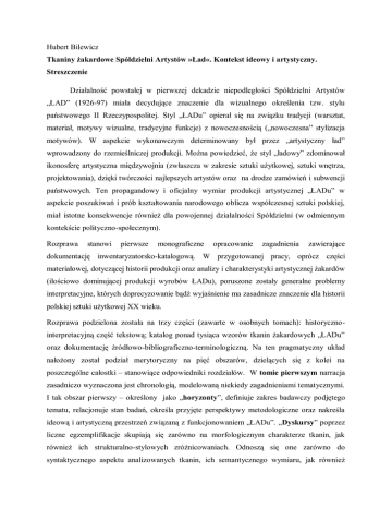 Hubert Bilewicz Tkaniny żakardowe Spółdzielni Artystów »Ład«. Kontekst ideowy i artystyczny. Streszczenie Działalność powstałej w pierwszej dekadzie niepodległości Spółdzielni Artystów „ŁAD” (1926-97) miała decydujące znaczenie dla wizualnego określenia tzw. stylu państwowego II Rzeczypospolitej. Styl „ŁADu” opierał się na związku tradycji (warsztat, materiał, motywy wizualne, tradycyjne funkcje) z nowoczesnością („nowoczesna” stylizacja motywów). W aspekcie wykonawczym determinowany był przez „artystyczny ład” wprowadzony do rzemieślniczej produkcji. Można powiedzieć, że styl „ładowy” zdominował ikonosferę artystyczna międzywojnia (zwłaszcza w zakresie sztuki użytkowej, sztuki wnętrza, projektowania), dzięki twórczości najlepszych artystów oraz na drodze zamówień i subwencji państwowych. Ten propagandowy i oficjalny wymiar produkcji artystycznej „ŁADu” w aspekcie poszukiwań i prób kształtowania narodowego oblicza współczesnej sztuki polskiej, miał istotne konsekwencje również dla powojennej działalności Spółdzielni (w odmiennym kontekście polityczno-społecznym). Rozprawa stanowi pierwsze monograficzne opracowanie zagadnienia zawierające dokumentację inwentaryzatorsko-katalogową. W przygotowanej pracy, oprócz części materiałowej, dotyczącej historii produkcji oraz analizy i charakterystyki artystycznej żakardów (ilościowo dominującej produkcji wyrobów ŁADu), poruszone zostały generalne problemy interpretacyjne, których doprecyzowanie bądź wyjaśnienie ma zasadnicze znaczenie dla historii polskiej sztuki użytkowej XX wieku. Rozprawa podzielona została na trzy części (zawarte w osobnych tomach): historycznointerpretacyjną część tekstową; katalog ponad tysiąca wzorów tkanin żakardowych „ŁADu” oraz dokumentację źródłowo-bibliograficzno-terminologiczną. Na ten pragmatyczny układ nałożony został podział merytoryczny na pięć obszarów, dzielących się z kolei na poszczególne całostki – stanowiące odpowiedniki rozdziałów. W tomie pierwszym narracja zasadniczo wyznaczona jest chronologią, modelowaną niekiedy zagadnieniami tematycznymi. I tak obszar pierwszy – określony jako „horyzonty”, definiuje zakres badawczy podjętego tematu, relacjonuje stan badań, określa przyjęte perspektywy metodologiczne oraz nakreśla ideową i artystyczną przestrzeń związaną z funkcjonowaniem „ŁADu”. „Dyskursy” poprzez liczne egzemplifikacje skupiają się zarówno na morfologicznym charakterze tkanin, jak również ich strukturalno-stylowych zróżnicowaniach. Odnoszą się one zarówno do syntaktycznego aspektu analizowanych tkanin, ich semantycznego wymiaru, jak również obszaru ich pragmatyki – percepcji, recepcji oraz funkcjonalnych zastosowań. Obszar ten zasadniczo pokrywa się z przedwojennymi dziejami spółdzielni. Historii „ŁADu” po 1945 roku poświęcono obszar zatytułowany „uwikłania”, wskazujący zarówno na problematyczne kwestie wpisywania się idei i realiów funkcjonowania spółdzielni artystycznej w nowych okolicznościach społeczno-politycznych, jak i ofert oraz kompromisów bądź konfliktów generowanych przez rzeczywistość PRLu. Ostatnim obszarem, zamykającym tom tekstowy są „retrospekcje”, zawierające kronikarską narrację poświęconą pracowni tkanin żakardowych „ŁADu”, twórcom, produkcji, istotnym zamówieniom i realizacjom oraz kwestiom upubliczniania dorobku m.in. poprzez wystawy. Kolejny obszar, stanowiący drugi tom opracowania, pt. „powiększenia” zawiera inwentarz o ambicjach katalogowych 1037 zidentyfikowanych wzorów tkanin żakardowych; skupia się z nierówną skrupulatnością na poszczególnych wzorach, gromadzi dokumentacje o istniejących projektach i zachowanych egzemplarzach tkanin. Katalog obejmuje wzory tkanin żakardowych i nicielnicowych, wykonanych w „Ładzie” w latach 1926-88 (do 1939 r. w spółdzielni powstało blisko 400 wzorów tkanin żakardowych; dorobek lat powojennych to prawie 500 projektów żakardów oraz około 700 wzorów tkanin nicielnicowych). W katalogu ujęto w porządku chronologicznym znane tkaniny wykonane według kolejnych wzorów, zarówno zachowane, jak i te, rozpoznane na podstawie zgromadzonych materiałów wizualnych (publikowanych ilustracji, archiwalnych fotografii, projektów, rysunków technicznych) bądź udokumentowane w przekazach źródłowych czy bibliografii. Uzupełnieniem tego obszaru jest zawarty w tomie trzecim spis wykorzystanych źródeł archiwalnych, wykaz wykorzystanej w badaniach bibliografii.