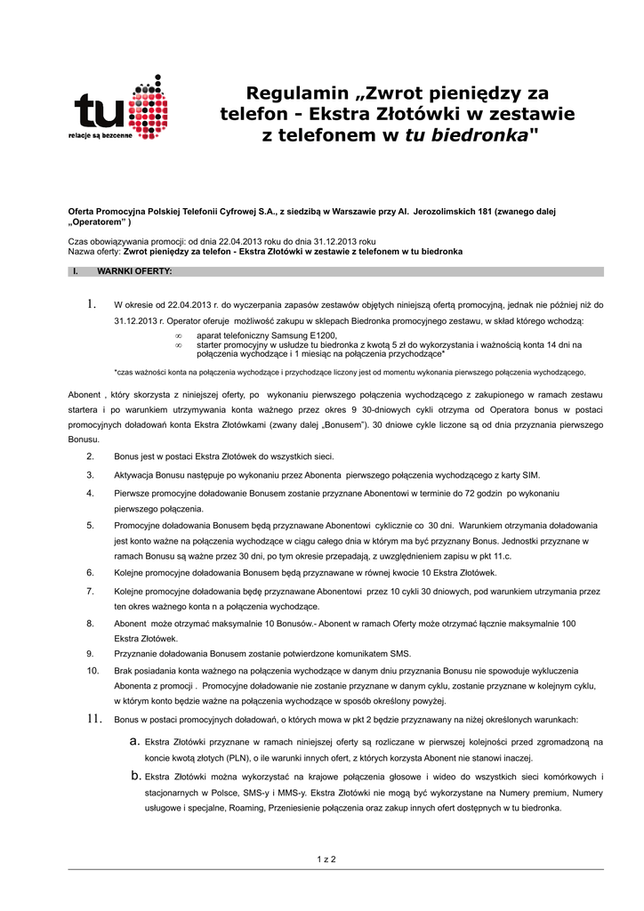 Regulamin „Zwrot pieniędzy za telefon - Ekstra Złotówki w zestawie z telefonem w tu biedronka" Oferta Promocyjna Polskiej Telefonii Cyfrowej S.A., z siedzibą w Warszawie przy Al. Jerozolimskich 181 (zwanego dalej „Operatorem” ) Czas obowiązywania promocji: od dnia 22.04.2013 roku do dnia 31.12.2013 roku Nazwa oferty: Zwrot pieniędzy za telefon - Ekstra Złotówki w zestawie z telefonem w tu biedronka I. WARNKI OFERTY: 1. W okresie od 22.04.2013 r. do wyczerpania zapasów zestawów objętych niniejszą ofertą promocyjną, jednak nie później niż do 31.12.2013 r. Operator oferuje możliwość zakupu w sklepach Biedronka promocyjnego zestawu, w skład którego wchodzą: • • aparat telefoniczny Samsung E1200, starter promocyjny w usłudze tu biedronka z kwotą 5 zł do wykorzystania i ważnością konta 14 dni na połączenia wychodzące i 1 miesiąc na połączenia przychodzące* *czas ważności konta na połączenia wychodzące i przychodzące liczony jest od momentu wykonania pierwszego połączenia wychodzącego, Abonent , który skorzysta z niniejszej oferty, po wykonaniu pierwszego połączenia wychodzącego z zakupionego w ramach zestawu startera i po warunkiem utrzymywania konta ważnego przez okres 9 30-dniowych cykli otrzyma od Operatora bonus w postaci promocyjnych doładowań konta Ekstra Złotówkami (zwany dalej „Bonusem”). 30 dniowe cykle liczone są od dnia przyznania pierwszego Bonusu. 2. Bonus jest w postaci Ekstra Złotówek do wszystkich sieci. 3. Aktywacja Bonusu następuje po wykonaniu przez Abonenta pierwszego połączenia wychodzącego z karty SIM. 4. Pierwsze promocyjne doładowanie Bonusem zostanie przyznane Abonentowi w terminie do 72 godzin po wykonaniu pierwszego połączenia. 5. Promocyjne doładowania Bonusem będą przyznawane Abonentowi cyklicznie co 30 dni. Warunkiem otrzymania doładowania jest konto ważne na połączenia wychodzące w ciągu całego dnia w którym ma być przyznany Bonus. Jednostki przyznane w ramach Bonusu są ważne przez 30 dni, po tym okresie przepadają, z uwzględnieniem zapisu w pkt 11.c. 6. Kolejne promocyjne doładowania Bonusem będą przyznawane w równej kwocie 10 Ekstra Złotówek. 7. Kolejne promocyjne doładowania będę przyznawane Abonentowi przez 10 cykli 30 dniowych, pod warunkiem utrzymania przez ten okres ważnego konta n a połączenia wychodzące. 8. Abonent może otrzymać maksymalnie 10 Bonusów.- Abonent w ramach Oferty może otrzymać łącznie maksymalnie 100 Ekstra Złotówek. 9. Przyznanie doładowania Bonusem zostanie potwierdzone komunikatem SMS. 10. Brak posiadania konta ważnego na połączenia wychodzące w danym dniu przyznania Bonusu nie spowoduje wykluczenia Abonenta z promocji . Promocyjne doładowanie nie zostanie przyznane w danym cyklu, zostanie przyznane w kolejnym cyklu, w którym konto będzie ważne na połączenia wychodzące w sposób określony powyżej. 11. Bonus w postaci promocyjnych doładowań, o których mowa w pkt 2 będzie przyznawany na niżej określonych warunkach: a. Ekstra Złotówki przyznane w ramach niniejszej oferty są rozliczane w pierwszej kolejności przed zgromadzoną na koncie kwotą złotych (PLN), o ile warunki innych ofert, z których korzysta Abonent nie stanowi inaczej. b. Ekstra Złotówki można wykorzystać na krajowe połączenia głosowe i wideo do wszystkich sieci komórkowych i stacjonarnych w Polsce, SMS-y i MMS-y. Ekstra Złotówki nie mogą być wykorzystane na Numery premium, Numery usługowe i specjalne, Roaming, Przeniesienie połączenia oraz zakup innych ofert dostępnych w tu biedronka. 1z2 c. W przypadku posiadania przez Abonenta Ekstra Złotówek przyznanych w ramach innych ofert, środki te sumują się z Ekstra Złotówkami przyznanymi w ramach niniejszej oferty, a termin ważności takiej sumy: • pozostaje bez zmian, jeśli ważność nowo nabytych Ekstra Złotówek jest krótsza niż tych, które były już zgromadzone na koncie; • jest naliczana od nowa, zgodnie z datą ważności nowo nabytych Ekstra Złotówek, jeśli data ważności nowo nabytych Ekstra Złotówek jest późniejsza niż tych, które już były zgromadzone na koncie. 12. Nie ma możliwości rezygnacji z przyznanego Bonusu. Kwotę pozostałych do wykorzystania Ekstra Złotówek można sprawdzić poprzez wysłanie ekspresowego kodu *101# (po wybraniu opcji 1) II. REKLAMACJE: 1. Reklamacje dotyczące oferty Ekstra Złotówki należy zgłaszać pisemnie na adres: Polska Telefonia Cyfrowa S.A. Biuro Obsługi Użytkownika tu biedronka, Al. Jerozolimskie 181, 02-222 Warszawa. 2. Abonenta, który skorzystał z niniejszej oferty może zgłosić reklamację w terminie 12 miesięcy od daty zdarzenia będącego przedmiotem reklamacji. 3. Reklamacja winna zawierać imię i nazwisko Klienta, numer telefonu oraz kod PUK karty SIM, przedmiot reklamacji, reklamowany okres oraz okoliczności uzasadniające reklamację oraz podpis Abonenta. 4. Jeśli podane w reklamacji dane lub informacje wymagają uzupełnienia, przed rozpatrzeniem reklamacji, Operator zwraca się do Klienta składającego reklamację o jej uzupełnienie. Nieuzupełnienie reklamacji w terminie wskazanym w wezwaniu powoduje pozostawienie reklamacji bez rozpoznania. 5. Operator rozpatruje reklamację w terminie do 1 miesiąca od dnia jej otrzymania od Klienta z zastrzeżeniem, że reklamacja jest kompletna i nie jest wymagane jej uzupełnienie. 6. Reklamacje będące następstwem niestosowania się Klienta do treści niniejszego Regulaminu nie zostaną rozpatrzone pozytywnie przez Operatora. III. POZOSTAŁE WARUNKI: 1. Klient potwierdza, że jest mu wiadome, iż nie ma prawa: • Za pomocą Karty SIM wydanej przez Operatora (dalej „Karta SIM”) kierować ruchu z sieci innych Operatorów do sieci TMobile/Heyah lub innych sieci telekomunikacyjnych • Wykorzystywać Karty SIM w urządzeniu realizującym funkcje zakończenia sieci stałej lub działającym na podobnej zasadzie (Fixe Cellular Term