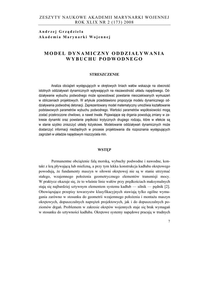 ZESZYTY NAUKOWE AKADEMII MARYNARKI WOJENNEJ ROK XLIX NR 2 (173) 2008 Andrzej Grządziela Akademia Marynarki Wojennej MODEL DYNAMICZNY ODDZIAŁYWANIA WYBUCHU PODWODNEGO STRESZCZENIE Analiza obciążeń występujących w okrętowych liniach wałów wskazuje na obecność istotnych oddziaływań dynamicznych wpływających na niezawodność układu napędowego. Oddziaływanie wybuchu podwodnego może spowodować powstanie nieoczekiwanych wymuszeń w obliczeniach projektowych. W artykule przedstawiono propozycje modelu dynamicznego oddziaływania podwodnej detonacji. Zaprezentowany model matematyczny umożliwia kształtowanie podstawowych parametrów wybuchu podwodnego. Wartości parametrów współosiowości mogą zostać przekroczone chwilowo, a nawet trwale. Pojawiające się drgania powodują zmiany w zakresie dynamiki oraz powstanie prędkości krytycznych drugiego rodzaju, które w efekcie są w stanie szybko zniszczyć układy łożyskowe. Modelowanie oddziaływań dynamicznych może dostarczyć informacji niezbędnych w procesie projektowania dla rozpoznania występujących zagrożeń w układzie napędowym niszczyciela min. WSTĘP Permanentne obciążenie falą morską, wybuchy podwodne i nawodne, kontakt z krą pływającą lub mielizną, a przy tym lekka konstrukcja kadłuba okrętowego powodują, że fundamenty maszyn w siłowni okrętowej nie są w stanie utrzymać stałego, wzajemnego położenia geometrycznego elementów transmisji mocy. W praktyce okazuje się, że to właśnie linie wałów przy prędkościach maksymalnych stają się najbardziej sztywnym elementem systemu kadłub — silnik — pędnik [2]. Obowiązujące przepisy towarzystw klasyfikacyjnych stawiają tylko ogólne wymagania zarówno w stosunku do geometrii wzajemnego położenia i montażu maszyn okrętowych, dopuszczalnych naprężeń projektowych, jak i do dopuszczalnych poziomów drgań. Problemem w zakresie okrętów wojennych staje się brak wymagań w stosunku do sztywności kadłuba. Okrętowe systemy napędowe pracują w trudnych 7 Andrzej Grządziela warunkach spowodowanych obciążeniami dynamicznymi i statycznymi. Odkształcenia sprężyste będące źródłem drgań elementów systemu napędowego mogą spowodować trwałe odkształcenia powierzchni kadłuba oraz fundamentów maszyn napędu głównego. Strukturę przyczyn potencjalnych odkształceń kadłuba oddziałujących na okrętowy system napędowy przedstawia rysunek 1. Odkształcenia statyczne można z dość dużą dokładnością zamodelować, nawet przed wdrożeniem okrętu do eksploatacji. Znajomość budowy kadłuba, rozkładu mas, dopuszczalne przegłębienia w zakresie eksploatacyjnych wyporności pozwalają obliczyć rzeczywiste pole powierzchni zwilżonej kadłuba oraz rozkład naprężeń we wszystkich jego punktach węzłowych, w tym na fundamentach łożysk nośnych i oporowych. Podstawowym problemem eksploatacyjnym są wymuszenia dynamiczne oddziałujące na okręt. Głównymi przyczynami odkształceń sprężystych kadłuba są: ⎯ ⎯ ⎯ oddziaływanie dynamiczne kadłuba z falą morską; bezpośredni kontakt z krą pływającą lub innymi obiektami pływającymi; oddziaływanie fali uderzeniowej nawodnych i podwodnych wybuchów w zakresie sprężystym oraz plastycznym, często na granicy histerezy materiału poszycia. PRZYCZYNY ODKSZTAŁCEŃ SPRĘŻYSYCH UKŁADU NAPĘDOWEGO ODKSZTAŁCENIA KADŁUBA OD OBCIĄŻEŃ DYNAMICZNYCH ODKSZTAŁCENIA KADŁUBA OD OBCIĄŻEŃ STATYCZNYCH EFEKTY FALOWANIA ZMIANY WYPORNOŚCI LUB PRZEGŁĘBIENIE EKSPLOZJE PODWODNE I NAWODNE ZMIANY STRUKTURY OBCIĄŻEŃ KADŁUBA ZMIENNE SIŁY NAPORU PĘDNIKA OBCIĄŻENIA TERMICZNE ZMIENNE MOMENTY SKRĘCAJĄCE PĘDNIKA WEJŚCIA KADŁUBA NA MIELIZNĘ CYRKULACJE KADŁUBA KONTAKTY KADŁUBA Z KRĄ PŁYWAJĄCĄ Rys. 1. Klasyfikacja przyczyn odkształceń sprężystych kadłuba 8 Zeszyty Naukowe AMW Model dynamiczny oddziaływania wybuchu podwodnego ODDZIAŁYWANIE WYBUCHU PODWODNEGO Systematyka i opis zjawisk towarzyszących dynamicznym oddziaływaniom na linie wałów w warunkach rzeczywistych jest sprawą skomplikowaną i kosztowną. Pomiary wykonywane w trybie off-line wnoszą wiele informacji, jednakże wykonywane są iteracyjnie przy zakłóceniach środowiska morskiego [3]. Analizy wykonane jedynie na podstawie danych z pomiarów off-line prowadzonych w warunkach normalnej eksploatacji okrętów są mało celowe z wielu względów. Przede wszystkim w warunkach rzeczywistych nie jest możliwe utrzymywanie stałych parametrów, które następnie zostaną odniesione jako zmienne. Zbieranie danych realizowane poprzez prowadzenie badań eksperymentalnych w morzu jest trudne, kosztowne, czasochłonne oraz często niejednoznaczne. Jest to jednak jedyna droga do otrzymania wiarygodnych wyników przy weryfikacji przyjętych założeń wstępnych badanego obiektu. Istotnym źródłem odkształceń dynamicznych kadłuba okrętu zwalczania min są wybuchy podwodne. Tego typu oddziaływanie jest w stanie spowodować kruche pękanie łożysk nośnych i oporowych linii wałów. Przy ocenie stopnia ryzyka dla systemów łożyskowych od wybuchu podwodnego wykorzystuje się dość często uproszczony wzór na współczynnik zagrożenia (liczbę udarową): z= G R . (1) Liczba udarowa jest proporcjonalna do energii plastycznego odkształcenia płyt poszycia kadłuba o grubości gp ≤ 15 mm przy prostopadłym działaniu fali uderzeniowej. Grubość poszycia jest tutaj nieprzypadkowa i przyjęta została jako standardowa grubość blach przeznaczonych na zwilżoną część kadłuba jednostek pływających. Zagrożenie wybuchem kontaktowym lub prawie kontaktowym ma miejsce, gdy fale uderzeniowe energii akustycznej wraz z gazami powybuchowymi docierają bezpośrednio do burty kadłuba. Konstrukcja kadłuba jest wtedy narażona na wybicie otworu burtowego na granicy ośrodków wody i powietrza, odkształcenia plastyczne samego poszycia, a nawet plastyczną deformację owręże