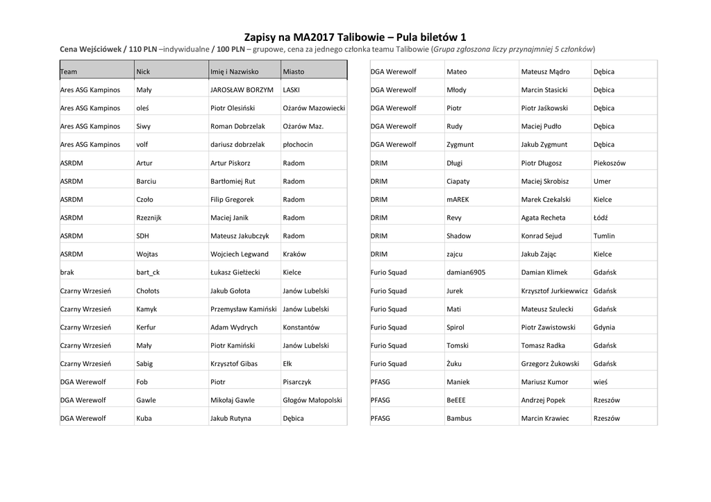 Zapisy na MA2017 Talibowie – Pula biletów 1 Cena Wejściówek / 110 PLN –indywidualne / 100 PLN – grupowe, cena za jednego członka teamu Talibowie (Grupa zgłoszona liczy przynajmniej 5 członków) Team Nick Imię i Nazwisko Miasto DGA Werewolf Mateo Mateusz Mądro Dębica Ares ASG Kampinos Mały JAROSŁAW BORZYM LASKI DGA Werewolf Młody Marcin Stasicki Dębica Ares ASG Kampinos oleś Piotr Olesiński Ożarów Mazowiecki DGA Werewolf Piotr Piotr Jaśkowski Dębica Ares ASG Kampinos Siwy Roman Dobrzelak Ożarów Maz. DGA Werewolf Rudy Maciej Pudło Dębica Ares ASG Kampinos volf dariusz dobrzelak płochocin DGA Werewolf Zygmunt Jakub Zygmunt Dębica ASRDM Artur Artur Piskorz Radom DRIM Długi Piotr Długosz Piekoszów ASRDM Barciu Bartłomiej Rut Radom DRIM Ciapaty Maciej Skrobisz Umer ASRDM Czoło Filip Gregorek Radom DRIM mAREK Marek Czekalski Kielce ASRDM Rzeznijk Maciej Janik Radom DRIM Revy Agata Recheta Łódź ASRDM SDH Mateusz Jakubczyk Radom DRIM Shadow Konrad Sejud Tumlin ASRDM Wojtas Wojciech Legwand Kraków DRIM zajcu Jakub Zając Kielce brak bart_ck Łukasz Giełżecki Kielce Furio Squad damian6905 Damian Klimek Gdańsk Czarny Wrzesień Chołots Jakub Gołota Janów Lubelski Furio Squad Jurek Krzysztof Jurkiewwicz Gdańsk Czarny Wrzesień Kamyk Przemysław Kamiński Janów Lubelski Furio Squad Mati Mateusz Szulecki Gdańsk Czarny Wrzesień Kerfur Adam Wydrych Konstantów Furio Squad Spirol Piotr Zawistowski Gdynia Czarny Wrzesień Mały Piotr Kamiński Janów Lubelski Furio Squad Tomski Tomasz Radka Gdańsk Czarny Wrzesień Sabig Krzysztof Gibas Ełk Furio Squad Żuku Grzegorz Żukowski Gdańsk DGA Werewolf Fob Piotr Pisarczyk PFASG Maniek Mariusz Kumor wieś DGA Werewolf Gawle Mikołaj Gawle Głogów Małopolski PFASG BeEEE Andrzej Popek Rzeszów DGA Werewolf Kuba Jakub Rutyna Dębica PFASG Bambus Marcin Krawiec Rzeszów Zapisy na MA2017 Talibowie – Pula biletów 1 Cena Wejściówek / 110 PLN –indywidualne / 100 PLN – grupowe, cena za jednego członka teamu Talibowie (Grupa zgłoszona liczy przynajmniej 5 członków) PFASG Biskup Mateusz Pelczar Krosno PFASG TreQ krzysztof pomykała Przewrotne PFASG Bl4ck Jacek Górak Rzeszów PFASG Tysha Monika Kaczmarczyk Jasło PFASG Dandi Tomasz Baran Straszydle PFASG Uber_Soldat Krzysztof Szajna Wola Rafałowska PFASG danpan Daniel Panaś Wojaszowka PFASG Viking MIchał Pik Rzeszów PFASG Bartolomeo Bartosz Lonc Rzeszów PFASG VIRUS Damian Bałda Rzeszów PFASG Ivanow Ignacy Kalinowski Łańcut PFASG Wojtix Wojciech Kunowski Rzeszów PFASG Kaczka Piotr Kaczor Rzeszów PFASG Zawak Arkadiusz Zawadzki Przeworsk PFASG Krzychu9978 Krzysztof Szkocny Przeworsk POE Mat Mateusz Możejko PFASG Mati Mateusz Piecuch Rzeszów POE Stanley Stanisław Możejko Kraków PFASG Randall Adrian Rokoszak Rzeszów Redberet Baran Tomasz Baranowski Warszawa PFASG Mendi Daniel Szegda Jarosław RedBeret Beata Beata Piętka Warszawa PFASG mironwt Mirosław Mikulec Rzeszów RedBeret Burzu Damian Kobierski Warszawa PFASG Nedza Wojciech Nędza Trzebownisko Redberet Dziadek Wojciech Durmaj Warszawa PFASG Niegodziwy Jan Krasnowski Jarosław Redberet Gonzo Piotr Masionek Warszawa PFASG Pomian Maciej Pomianek Rzeszow RedBeret Grisha0 Grzegorz Piotrowski Warszawa PFASG Sam Kamil Strama Przeworsk Redberet hern grzegorz królik warszawa PFASG samuraj Tomasz Sałamaj Manasterz Redberet Hex Krzysztof Komorowski Warszawa PFASG Smirnoff Marcin Piotrów Rzeszów RedBeret Jankes Wojciech WARSZAWA PFASG Mołgol Szymon Zieliński Rzeszów Redberet koszak paweł koszewski warszawa PFASG Tecq Damian Kaczmarczyk Jasło Redberet Łukasz Łukasz Borkiewicz Warszawa Zapisy na MA2017 Talibowie – Pula biletów 1 Cena Wejściówek / 110 PLN –indywidualne / 100 PLN – grupowe, cena za jednego członka teamu Talibowie (Grupa zgłoszona liczy przynajmniej 5 członków) Redberet Mika Martyna Opowicz Warszawa S.W.O.G Ponurak Kacper Drozdowski Leńcze Redberet Tommy Tomasz Królik Warszawa S.W.O.G Tom Tomasz Proszowski Kraków Redberet YARO JAROSŁAW RYCKO WARSZAWA S.W.O.G VoyTas Wojciech Węgiel Kraków Redberet ZmutowanaRyba Jacek Jakubowski Pruszków S.W.O.G Zuko Szymon Kulawiak Leńcze Ryjowki TNT filcu Piotr Figiel Starachowice SR Alien Paweł Potępa Kraków Ryjówki TNT ChrzaneK Łukasz Chrzanowski Szydłowiec SRU Sid Artur Mołek Poznań Ryjówki TNT Drożdżu Michał Dróżdż Tychów Nowy SRU Alien Paweł Potępa Kraków Ryjówki TNT Figlu Mateusz Figiel Tychów Nowy SRU Aron Aron Szlachciak Witaszyce Ryjówki TNT Sevi Bartłomiej Seweryn Tychów Nowy SRU Burdel Mateusz Burdajewicz Poznań Ryjówki TNT Kosel Patryk Kosel Iłża SRU ChuaBan Kacper Elmiś Ostroróg Ryjówki TNT Spadło Mateusz Spadło Tychów nowy SRU Dawid Dawid Marcinkowski Poznań S.W.O.G Arkadiusz Arkadiusz Grochal Leńcze SRU Dezi Paweł Dezor Poznań S.W.O.G bonuss Jacek Majeran Skawina SRU Dziubu Piotr Potępa Kraków S.W.O.G Szymon Szymon Legieć Kraków SRU Edka Edyta Potępa Kraków S.W.O.G Karol Karol Szczyrbak Radziszów SRU fifcia Filip Haøas Poznañ S.W.O.G Alek Aleksy Wnęk Skawina SRU Frenchie Victor Raule Paris S.W.O.G Roland Roland Rogowski Kraków SRU Satan Michał Korcz Wadowice S.W.O.G Maciek Maciej Życzkowski Kraków SRU HANS Hubert Goliński Poznań S.W.O.G MŁODY Jakub Kościelny Skawina SRU Jarząbek Mateusz Jarzębowski Oborniki S.W.O.G Piechu Karol Piech Wieliczka SRU Julka Julia Szudera Poznań Zapisy na MA2017 Talibowie – Pula biletów 1 Cena Wejściówek / 110 PLN –indywidualne / 100 PLN – grupowe, cena za jednego członka teamu Talibowie (Grupa zgłoszona liczy przynajmniej 5 członków) SRU Krzywy Kacper Wesołowski Szamotuły SRU Surdykk Filip Surdyk Wieś SRU Kuliś Hubert Kuliński Poznań SRU Wally Robert Elmiś Ostroróg SRU Linek Tomasz Linke Oborniki SRU Banan Damian Banaszak Oborniki SRU hassan al mamba damian wieczorek oborniki stalkers małpetti Daniel Gawroński Milanówek SRU Maras Marek Michałkowski Poznań stalkers snajper Michał Sokolnicki Pruszk