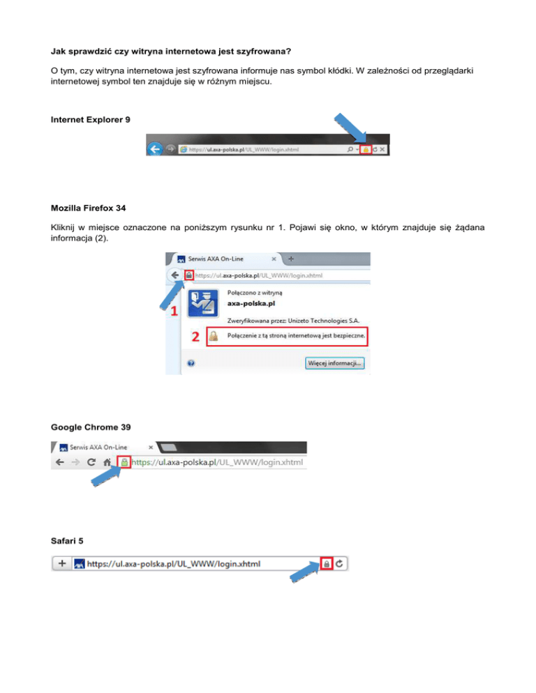 Jak sprawdzić czy witryna internetowa jest szyfrowana? O tym, czy witryna internetowa jest szyfrowana informuje nas symbol kłódki. W zależności od przeglądarki internetowej symbol ten znajduje się w różnym miejscu. Internet Explorer 9 Mozilla Firefox 34 Kliknij w miejsce oznaczone na poniższym rysunku nr 1. Pojawi się okno, w którym znajduje się żądana informacja (2). Google Chrome 39 Safari 5