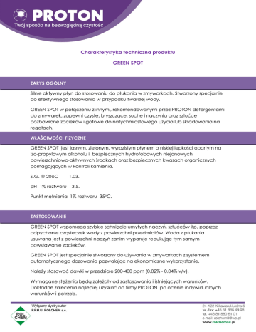 Charakterystyka techniczna produktu GREEN SPOT ZARYS OGÓLNY Silnie aktywny płyn do stosowaniu do płukania w zmywarkach. Stworzony specjalnie do efektywnego stosowania w przypadku twardej wody. GREEN SPOT w połączeniu z innymi, rekomendowanymi przez PROTON detergentami do zmywarek, zapewni czyste, błyszczące, suche i naczynia oraz sztućce pozbawione zacieków i gotowe do natychmiastowego użycia lub składowania na regałach. WŁAŚCIWOŚCI FIZYCZNE GREEN SPOT jest jasnym, zielonym, wyrazistym płynem o niskiej lepkości opartym na izo-propylowym alkoholu i bezpiecznych hydrofobowych niejonowych powierzchniowo-aktywnych środkach oraz bezpiecznych kwasach organicznych pomagających w kontroli kamienia. S.G. @ 20oC pH 1% roztworu 1.03. 3.5. Punkt mętnienia 1% roztworu 35C. ZASTOSOWANIE GREEN SPOT wspomaga szybkie schnięcie umytych naczyń, sztućców itp. poprzez odpychanie cząsteczek wody z powierzchni przedmiotów. Woda z płukania usuwana jest z powierzchni naczyń zanim wyparuje redukując tym samym powstawanie zacieków. GREEN SPOT jest specjalnie stworzony do używania w zmywarkach z systemem automatycznego dozowania pozwalając na ekonomiczne wykorzystanie. Należy stosować dawki w przedziale 200-400 ppm (0.02% - 0.04% v/v). Wymagane stężenia będą zależały od zastosowania i istniejących warunków. Dokładne zalecenia najlepiej uzyskać od firmy PROTON po ocenie indywidualnych warunków i potrzeb. OPAKOWANIE 2 x 5 l plastikowe pojemniki 4 x 5l plastikowe pojemniki 20 l plastikowe beczki Dokument opracowany przez: The Proton Group Limited, Normanton Industrial Estate, Normanton, West Yorkshire, WF6 1QT. Tel: +44(0) 1924 892834 Data: 01.06.97 Odnośnik: grenspot.neu Edycja: 97/3