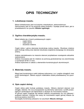 OPIS TECHNICZNY 1. Lokalizacja masztu. Maszt zlokalizowany jest na budynku mieszkalnym, jednorodzinnym. Zamocowany jest on na poziomie pietra budynku i wystaje ponad dach, jak to przedstawiono na rysunku Widoku ogólnego. 2. Ogólna charakterystyka masztu. Maszt składa się z trzech podstawowych części : - część dolna. - część górna. - obudowa rotatora. Część dolna i górna stanowią konstrukcję nośną masztu. Obudowa rotatora pełni funkcję nośną oraz stanowi obudowę urządzenia służącego do obracania anteny. Antena zainstalowana na maszcie stanowi przykładowe rozwiązanie aktualnie zastosowane. Antena mocowana jest do rotatora za pomocą grubościennej rury aluminiowej o wymiarach Ø 60 x 5 mm. Antena wykonana w całości z elementów konstrukcyjnych aluminiowych. 3. Materiały masztu. Maszt jest konstrukcją w pełni stalową wykonaną z rur i prętów okrągłych oraz profili zamkniętych. Zakres użytych materiałów został przedstawiony na rysunkach. 4. Opis części dolnej. Część dolna pełni funkcje podstawy masztu. Główny element stanowi rura okrągła, stalowa. Do rury przyspawane są elementy wykonane z profili prostokątnych zamkniętych lub kątowników a służące do mocowania masztu. W górnej części znajduje się kołnierz stalowy przyspawany do rury głównej i podparty żebrami. Kołnierz ten służy do mocowania części górnej masztu za pomocą sześciu śrub M12. Szczegóły konstrukcji pokazano na rysunkach Masztu dolnego. Projekt techniczny – maszt antenowy 5. Opis części górnej Część górna wykonana jest w formie konstrukcji kratowej o przekroju kwadratowym. Elementy nośne kratownicy wykonane z profilu kwadratowego zamkniętego natomiast elementy wiążące wykonane są z pręta okrągłego lub z blachy. Dolna część kratownicy do wysokości około 67 cm stanowi pełny przekrój kratownicy kwadratowej. Pozostała część kratownicy posiada przekrój kwadratowy jednak bez standardowych elementów łączących na jednym boku. Na tym boku elementy łączące słupy nośne kratownicy wykonane są z blachy. Stanowią one elementy przykręcany za pomocą dwóch śrub M10 każdy. W środku kratownicy zamocowana jest w sposób obrotowy grubościenna rura aluminiowa. Rura ta pełni wyłącznie funkcje nośną w sytuacjach montażu anteny lub jej konserwacji. Po usunięciu łączników kratownicy pełniących również funkcje zabezpieczenia wewnętrznej rury aluminiowej istnieje możliwość jej położenia wraz z anteną na płaską powierzchnię dachu za pomocą układu liny i kołowrotka. Taka konstrukcja pozwala na montaż i konserwację anteny w maksymalnie bezpieczny sposób tj. bez konieczności wchodzenia na maszt. W dolnej części znajduje się kołnierz analogiczny jak w maszcie dolnym służący do łączenia obu części za pomocą sześciu śrub M12. W górnej części masztu znajduje się płyta stalowa pełniąca podobną funkcje jak kołnierz na dole i służąca do mocowania za pomocą pięciu śrub M10 obudowy rotora. Szczegóły konstrukcji pokazano na rysunkach Masztu górnego. 6. Opis obudowy rotatora. Obudowa rotatora wykonana jest podobnie jak maszt górny w postaci kratownicy i z tych samych materiałów. Jeden bok obudowy również jest otwarty i pełni tę samą funkcje jak w kratownicy masztu górnego. W części dolnej i górnej obudowy znajdują się płyty stalowe pełniące funkcje mocowania obudowy rotatora do masztu górnego lub oprawy łożyska obrotowego mocowania anteny. Mocowania te wykonane są za pomocą śrub M 10. 7. Zabezpieczenie antykorozyjne. Elementy stalowe konstrukcji masztu zabezpieczone są pokryciem malarskim, głównie farbą chloro-kauczukową. Elementy złączne tj. śruby, podkładki sprężyste lub zwykłe oraz nakrętki są cynkowane. Strona 2 / 3 Projekt techniczny – maszt antenowy 8. Mocowanie masztu. Maszt, jako całość mocowany jest wielopunktowo w pięciu płaszczyznach: dolna część masztu dolnego na wysokości około 100 mm jest zabetonowana w stropie parteru. na wysokości około 27 cm ponad posadzką tarasu maszt dolny mocowany jest w czterech punktach za pomocą śrub Ø 16 zakotwionych w ścianach konstrukcyjnych budynku. na wysokości około 1 m ponad posadzka tarasu maszt dolny mocowany jest w czterech punktach za pomocą śrub Ø 16 zakotwionych w ścianach konstrukcyjnych budynku maszt dolny mocowany jest również za pomocą dwóch śrub Ø 14 do krokwi dachu. ponadto maszt górny wyposażony jest w trzy odciągi wykonane z linki stalowej Ø 4 o regulowanym naciągu za pomocą śrub rzymskich. Odciągi stanowią wyłącznie funkcję dodatkowego zabezpieczenia tłumiącego drgania masztu. Opracowane przez SP6IEQ Strona 3 / 3