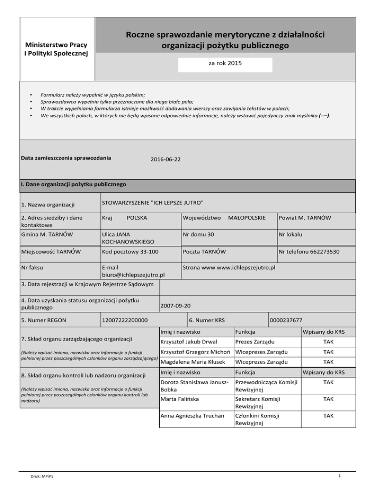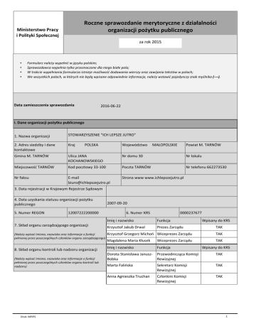 ZŽĐnjŶĞƐƉƌĂǁŽnjĚĂŶŝĞŵĞƌLJƚŽƌLJĐnjŶĞnjĚnjŝĂųĂůŶŽƑĐŝ ŽƌŐĂŶŝnjĂĐũŝƉŽǏLJƚŬƵƉƵďůŝĐnjŶĞŐŽ Ministerstwo Pracy ŝWŽůŝƚLJŬŝ^ƉŽųĞĐnjŶĞũ za rok 2015 • • • • &ŽƌŵƵůĂƌnjŶĂůĞǏLJǁLJƉĞųŶŝđǁũħnjLJŬƵƉŽůƐŬŝŵ͖ ^ƉƌĂǁŽnjĚĂǁĐĂǁLJƉĞųŶŝĂƚLJůŬŽƉƌnjĞnjŶĂĐnjŽŶĞĚůĂŶŝĞŐŽďŝĂųĞƉŽůĂ͖ tƚƌĂŬĐŝĞǁLJƉĞųŶŝĂŶŝĂĨŽƌŵƵůĂƌnjĂŝƐƚŶŝĞũĞŵŽǏůŝǁŽƑđĚŽĚĂǁĂŶŝĂǁŝĞƌƐnjLJŽƌĂnjnjĂǁŝũĂŶŝĂƚĞŬƐƚſǁǁƉŽůĂĐŚ͖ tĞǁƐnjLJƐƚŬŝĐŚƉŽůĂĐŚ͕ǁŬƚſƌLJĐŚŶŝĞďħĚČǁƉŝƐĂŶĞŽĚƉŽǁŝĞĚŶŝĞŝŶĨŽƌŵĂĐũĞ͕ŶĂůĞǏLJǁƐƚĂǁŝđƉŽũĞĚLJŶĐnjLJnjŶĂŬŵLJƑůŶŝŬĂ (--–). Data zamieszczenia sprawozdania 2016-06-22 /͘ĂŶĞŽƌŐĂŶŝnjĂĐũŝƉŽǏLJƚŬƵƉƵďůŝĐnjŶĞŐŽ 1. Nazwa organizacji STOWARZYSZENIE "ICH LEPSZE JUTRO" 2. Adres siedziby i dane kontaktowe Kraj Gmina M. TARNÓW POLSKA tŽũĞǁſĚnjƚǁŽDBKWK>^</ Powiat M. TARNÓW Ulica JANA KOCHANOWSKIEGO Nr domu 30 Nr lokalu DŝĞũƐĐŽǁŽƑđdZEMt Kod pocztowy 33-100 Poczta TARNÓW Nr telefonu 662273530 Nr faksu E-mail [email protected] Strona www www.ichlepszejutro.pl ϯ͘ĂƚĂƌĞũĞƐƚƌĂĐũŝǁ<ƌĂũŽǁLJŵZĞũĞƐƚƌnjĞ^ČĚŽǁLJŵ ϰ͘ĂƚĂƵnjLJƐŬĂŶŝĂƐƚĂƚƵƐƵŽƌŐĂŶŝnjĂĐũŝƉŽǏLJƚŬƵ publicznego 5. Numer REGON 12007222200000 ϳ͘^ŬųĂĚŽƌŐĂŶƵnjĂƌnjČĚnjĂũČĐĞŐŽŽƌŐĂŶŝnjĂĐũŝ ;EĂůĞǏLJǁƉŝƐĂđŝŵŝŽŶĂ͕ŶĂnjǁŝƐŬĂŽƌĂnjŝŶĨŽƌŵĂĐũĞŽĨƵŶŬĐũŝ ƉĞųŶŝŽŶĞũƉƌnjĞnjƉŽƐnjĐnjĞŐſůŶLJĐŚĐnjųŽŶŬſǁŽƌŐĂŶƵnjĂƌnjČĚnjĂũČĐĞŐŽͿ ϴ͘^ŬųĂĚŽƌŐĂŶƵŬŽŶƚƌŽůŝůƵďŶĂĚnjŽƌƵŽƌŐĂŶŝnjĂĐũŝ ;EĂůĞǏLJǁƉŝƐĂđŝŵŝŽŶĂ͕ŶĂnjǁŝƐŬĂŽƌĂnjŝŶĨŽƌŵĂĐũĞŽĨƵŶŬĐũŝ ƉĞųŶŝŽŶĞũƉƌnjĞnjƉŽƐnjĐnjĞŐſůŶLJĐŚĐnjųŽŶŬſǁŽƌŐĂŶƵŬŽŶƚƌŽůŝůƵď nadzoru) Druk: MPiPS 2007-09-20 6. Numer KRS 0000237677 /ŵŝħŝŶĂnjǁŝƐŬŽ Funkcja Krzysztof Jakub Drwal WƌĞnjĞƐĂƌnjČĚƵ Wpisany do KRS TAK <ƌnjLJƐnjƚŽĨ'ƌnjĞŐŽƌnjDŝĐŚŽŷ tŝĐĞƉƌĞnjĞƐĂƌnjČĚƵ TAK DĂŐĚĂůĞŶĂDĂƌŝĂ<ųƵƐĞŬ tŝĐĞƉƌĞnjĞƐĂƌnjČĚƵ TAK /ŵŝħŝŶĂnjǁŝƐŬŽ Funkcja ŽƌŽƚĂ^ƚĂŶŝƐųĂǁĂ:ĂŶƵƐnjͲ Bobka WƌnjĞǁŽĚŶŝĐnjČĐĂ<ŽŵŝƐũŝ Rewizyjnej TAK DĂƌƚĂ&ĂůŝŷƐŬĂ Sekretarz Komisji Rewizyjnej TAK Anna Agnieszka Truchan njųŽŶŬŝŶŝ<ŽŵŝƐũŝ Rewizyjnej TAK Wpisany do KRS 1 9. Cele statutowe organizacji ;EĂůĞǏLJŽƉŝƐĂđĐĞůĞŶĂƉŽĚƐƚĂǁŝĞƐƚĂƚƵƚƵŽƌŐĂŶŝnjĂĐũŝͿ ĞůĞŵĚnjŝĂųĂůŶŽƑĐŝ^ƚŽǁĂƌnjLJƐnjĞŶŝĂũĞƐƚƌĞĂůŝnjŽǁĂŶŝĞnjĂĚĂŷŶĂƌnjĞĐnjŽƐſď͕ o których mowa w art. 4ƵƐƚĂǁLJŽĚnjŝĂųĂůŶŽƑĐŝƉŽǏLJƚŬƵƉƵďůŝĐnjŶĞŐŽŝ ǁŽůŽŶƚĂƌŝĂĐŝĞ͕ĂǁƐnjĐnjĞŐſůŶŽƑĐŝ͗ 1. Tworzenie warunków dla wszechstronnego rozwoju podopiecznych ŽƌĂnjĂŬƚLJǁŶĞŐŽƐƉħĚnjĂŶŝĂŝĐŚǁŽůŶĞŐŽĐnjĂƐƵ͘ 2͘hĚnjŝĞůĂŶŝĞƉŽŵŽĐLJƉŽĚŽƉŝĞĐnjŶLJŵƉŽƉƌnjĞnjƌĞŚĂďŝůŝƚĂĐũħŝnjĂũħĐŝĂ ŬƵůƚƵƌĂůŶŽŽƑǁŝĂƚŽǁĞ͘ 3. Specjalistyczna pomoc podopiecznym. 4. Udzielanie porad oraz prowadzenie konsultacji w zakresie ƌŽnjǁŝČnjLJǁĂŶŝĂƉƌŽďůĞŵſǁǁŶŝŬĂũČĐLJĐŚnjĨĂŬƚƵƉŽƐŝĂĚĂŶŝĂǁƑƌſĚ ŶĂũďůŝǏƐnjLJĐŚŽƐŽďLJŶŝĞƉĞųŶŽƐƉƌĂǁŶĞũůƵďĐŚŽƌĞũ͘ ĞůĞŽŬƌĞƑůŽŶĞǁĂƌƚ͘4 Stowarzyszenie realizuje przez: /ŶŝĐũŽǁĂŶŝĞŝǁLJƐƚħƉŽǁĂŶŝĞnjǁŶŝŽƐŬĂŵŝŽƵƌĞŐƵůŽǁĂŶŝĂƉƌĂǁŶĞ 10. Sposób realizacji celów statutowych organizacji ŐǁĂƌĂŶƚƵũČĐĞƉƌnjĞƐƚƌnjĞŐĂŶŝĞƉƌĂǁĐnjųŽǁŝĞŬĂŝŽďLJǁĂƚĞůĂǁŽďĞĐŽƐſď͕ĚůĂ ŬƚſƌLJĐŚĚnjŝĂųĂ^ƚŽǁĂƌnjLJƐnjĞŶŝĞŝnjĂƐƉŽŬĂũĂŶŝĞŝĐŚƉŽƚƌnjĞďǁnjĂŬƌĞƐŝĞ ;EĂůĞǏLJŽƉŝƐĂđƐƉŽƐſďƌĞĂůŝnjĂĐũŝĐĞůſǁƐƚĂƚƵƚŽǁLJĐŚŽƌŐĂŶŝnjĂĐũŝŶĂ leczenia, w tym rehabilitacji, edukacji, szkolenia zawodowego, pracy, ŵŝĞƐnjŬĂůŶŝĐƚǁĂĐŚƌŽŶŝŽŶĞŐŽ͕ŽƉŝĞŬŝ͕ƵĚnjŝĂųƵǁŬƵůƚƵƌnjĞŝƌĞŬƌĞĂĐũŝ͕ǁ podstawie statutu organizacji) ŝŶƚĞŐƌĂĐũŝnjŽƚǁĂƌƚLJŵƑƌŽĚŽǁŝƐŬŝĞŵ͕ĂƚĂŬǏĞǁƐƉŝĞƌĂŶŝĂǁƐĂŵŽĚnjŝĞůŶLJŵ͕ ŶŝĞnjĂůĞǏŶLJŵǏLJĐŝƵŽƌĂnjnjĂďĞnjƉŝĞĐnjĞŶŝĂƐŽĐũĂůŶĞŐŽ͕ŽĐŚƌŽŶLJŝƉŽŵŽĐLJ prawnej. dǁŽƌnjĞŶŝĞŽƐŽďŽŵŶŝĞƉĞųŶŽƐƉƌĂǁŶLJŵǁĂƌƵŶŬſǁĚĞĐLJĚŽǁĂŶŝĂǁƐǁŽŝĐŚ sprawach zarówno w rodzinach, jak i w placówkach oraz w formach ǁƐƉĂƌĐŝĂ͕njŬƚſƌLJĐŚŬŽƌnjLJƐƚĂũČ͘hĚnjŝĞůĂŶŝĞŝŵǁƐƉĂƌĐŝĂ͕ĂďLJŽŶŝƐĂŵŝŵŽŐůŝ ǁLJƐƚħƉŽǁĂđǁƐǁŽŝŵŝŵŝĞŶŝƵ͕ŵŝħĚnjLJŝŶŶLJŵŝƉŽƉƌnjĞnjĚŽƌĂĚnjƚǁŽ͕ ƐnjŬŽůĞŶŝĞ͕ĂƐLJƐƚŽǁĂŶŝĞŝŽƉŝĞŬħƉƌĂǁŶČ͕ĂƚĂŬǏĞǁLJƐƚħƉŽǁĂŶŝĞǁŝŶƚĞƌĞƐŝĞ ŝŶĚLJǁŝĚƵĂůŶLJĐŚŽƐſď͘dǁŽƌnjĞŶŝĞǁĂƌƵŶŬſǁǁųČĐnjĂŶŝĂĚnjŝĞĐŝ͕ŵųŽĚnjŝĞǏLJŝ ĚŽƌŽƐųLJĐŚ͕ũĂŬŽŝŶĚLJǁŝĚƵĂůŶLJĐŚŽƐſďŝũĂŬŽŐƌƵƉ͕ǁƚŽŬŶŽƌŵĂůŶĞŐŽǏLJĐŝĂ͕ ŬŽƌnjLJƐƚĂŶŝĂƉƌnjĞnjŶŝĐŚnjŽŐſůŶŽĚŽƐƚħƉŶĞũŝŶĨƌĂƐƚƌƵŬƚƵƌLJƐƉŽųĞĐnjŶĞũŝĨŽƌŵ ǏLJĐŝĂƐƉŽųĞĐnjŶĞŐŽ͘ WƌŽǁĂĚnjĞŶŝĞŶĂnjůĞĐĞŶŝĞŽƌĂnjnjĞƑƌŽĚŬſǁǁųĂƐŶLJĐŚƌſǏŶŽƌŽĚŶLJĐŚƵƐųƵŐ͕ ŵ͘ŝŶ͘ǁĨŽƌŵŝĞƉůĂĐſǁĞŬŝnjĞƐƉŽųſǁŬŽŵƉůĞŬƐŽǁĞũ͕ǁŝĞůŽƐƉĞĐũĂůŝƐƚLJĐnjŶĞũ ƉŽŵŽĐLJ͕ǁƐnjĐnjĞŐſůŶŽƑĐŝǁnjĂŬƌĞƐŝĞǁĐnjĞƐŶĞũŝ