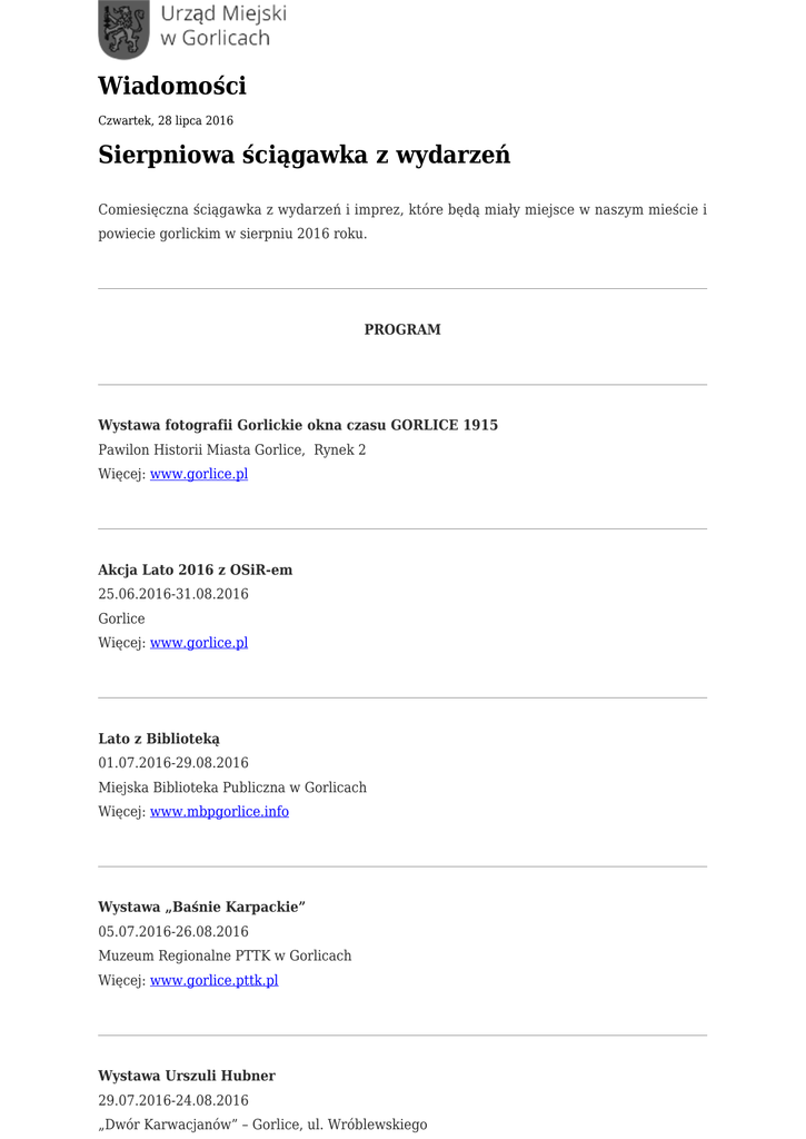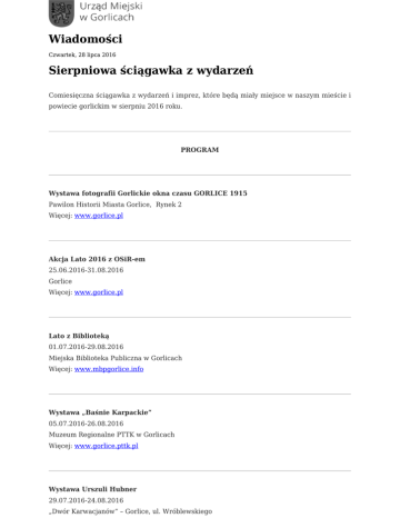 Wiadomości Czwartek, 28 lipca 2016 Sierpniowa ściągawka z wydarzeń Comiesięczna ściągawka z wydarzeń i imprez, które będą miały miejsce w naszym mieście i powiecie gorlickim w sierpniu 2016 roku. PROGRAM Wystawa fotografii Gorlickie okna czasu GORLICE 1915 Pawilon Historii Miasta Gorlice, Rynek 2 Więcej: www.gorlice.pl Akcja Lato 2016 z OSiR-em 25.06.2016-31.08.2016 Gorlice Więcej: www.gorlice.pl Lato z Biblioteką 01.07.2016-29.08.2016 Miejska Biblioteka Publiczna w Gorlicach Więcej: www.mbpgorlice.info Wystawa „Baśnie Karpackie” 05.07.2016-26.08.2016 Muzeum Regionalne PTTK w Gorlicach Więcej: www.gorlice.pttk.pl Wystawa Urszuli Hubner 29.07.2016-24.08.2016 „Dwór Karwacjanów” – Gorlice, ul. Wróblewskiego Więcej: www.muzeum.gorlice.pl Wystawa Visioni/Wizje 29.07.2016-24.08.2016 „Dwór Karwacjanów” – Gorlice, ul. Wróblewskiego Więcej: www.muzeum.gorlice.pl Beach tenis w ramach GWS 30.07.2016, godz. 8.30 Boiska OSiR w Gorlicach Więcej: www.gorlice.pl/gws 95-lecie klubu GKS Glinik Gorlice 30.07.2016, godz. 8.00-18.00 Stadnion OSiR w Gorlicach Więcej: www.gorlice.pl Otwarte Mistrzostwa Gorlic w tenisie ziemnym 30.07.2016, godz. 9.00 Korty tenisowe OSiR Więcej: www.osir.gorlice.pl V Beach party 30.07.2016, godz. 14.00 Boiska do siatkówki plażowej w Gorlicach Więcej: www.gorlice.pl Piknik historyczny "Z Bobowej pod Grunwald" 30.07.2016, godz. 15.00 Amfiteatr w Wilczyskach Więcej: www.bobowa.pl Tydzień Pozytywnych Inicjatyw w Gorlicach 31.07.2016-06.08.2016 Gorlice Więcej: www.gorlice.pl Pogórzańskie Targowisko Staroci 31.07.2016, godz. 9.00-17.00 Skansen w Szymbarku Więcej: www.muzeum.gorlice.pl Zdobywamy Kasztel Szymbarski 31.07.2016, godz. 14.00 Kasztel w Szymbarku Więcej: www.muzeum.gorlice.pl Gorlickie Lato 2016 01.08.2016-31.08.2016 Gorlice Więcej: www.gorlice.pl Wystawa malarstwa Stefana Telep 02.08.2016-31.08.2016 Dom Polsko-Słowacki w Gorlicach Więcej: www.gck.gorlice.pl Wystawa malarstwa Grupy Plastycznej Piaseczno 02.08.2016-06.08.2016 Dom Polsko-Słowacki w Gorlicach Więcej: www.gck.gorlice.pl Wystawa "Rośliny Gór Polskich" Stanisław Augustyn 04.08.2016-06.09.2016 Gorlicki Salon Fotografii, ul. Mickiewicza 14 Gorlice Więcej: www.gorlice.pl Wystawa grafiki Joanny Janowskiej-Augustyn 05.08.2016-30.08.2016 Kasztel w Szymbarku Więcej: www.muzeum.gorlice.pl Otwarte Wrota Pogórza 2016 05.08.2016-07.08.2016 Pogórza Karpackie Więcej: www.gorlice.pl Kolarstwo w ramach GWS 06.08.2016 Gorlice Więcej: www.gorlice.pl/gws Wycieczka w Tatry Słowackie 06.08.2016, godz. 6.00 Tatry Słowackie Więcej: www.gorlice.pttk.pl Piknik Libuski 06.08.2016-07.08.2016 Libusza Więcej: www.biecz.pl Koncert kameralny - Trio im. Wiłkomirskich 06.08.2016, godz. 18.00 „Dwór Karwacjanów” – Gorlice, ul. Wróblewskiego Więcej: www.muzeum.gorlice.pl Wycieczka do Zakopanego 07.08.2016, godz. 6.00 Zakopane Więcej: www.gorlice.pttk.pl Festiwal Muzyka Zaklęta w Drewnie 07.08.2016, godz. 17.00 Cerkiew w Kwiatoniu Więcej: www.drewniana.malopolska.pl Kromer Festival 11.08.2016-14.08.2016 Biecz Więcej: www.biecz.pl Wycieczka na VIII Nowotarski Piknik Lotniczy 14.08.2016, godz. 9.00 Tatry Słowackie Więcej: www.gorlice.pttk.pl Festiwal Muzyka Zaklęta w Drewnie 14.08.2016, godz. 18.00 Cerkiew w Brunarach Wyżnych Więcej: www.drewniana.malopolska.pl Gorlicka Piątka z Regatta i Piknik 15.08.2016, godz. 12.00 Stadion OSiR w Gorlicach, Park Miejski Więcej: www.gorlice.pl XXII Międzynarodowy Zlot Motocykli 19.08.2016-21.08.2016 Zdynia-Regietów Więcej: www.zdynia.eu Koncert Arka Zawilińskiego 19.08.2016, godz. 19.00 Dziedziniec Ratusza w Gorlicach Więcej: www.gck.gorlice.pl Kino letnie "Wino truskawkowe" 19.08.2016, godz. 21.00 Dziedziniec Ratusza w Gorlicach Więcej: www.gck.gorlice.pl Święto Maziarzy Łosiańskich 21.08.2016, godz. 13.00 Zagroda Maziarska w Łosiu Więcej: www.muzeum.gorlice.pl Warsztaty Pogórzańskie Eko-klimaty 21.08.2016, godz. 15.00 Skansen w Szymbarku Więcej: www.muzeum.gorlice.pl Festiwal Muzyka Zaklęta w Drewnie 21.08.2016, godz. 18.00 Kościół w Binarowej Więcej: www.drewniana.malopolska.pl Wystawa malarstwa Stanisława Stocha 26.08.2016-21.09.2016 „Dwór Karwacjanów” – Gorlice, ul. Wróblewskiego Więcej: www.muzeum.gorlice.pl Wycieczka w dolinę Białej Wody Kieżmarskiej 28.08.2016, godz. 6.00 Słowacja Więcej: www.gorlice.pttk.pl Inscenizacja dożynek wiejskich 28.08.2016, godz. 16.00 Skansen w Szymbarku Więcej: www.muzeum.gorlice.pl