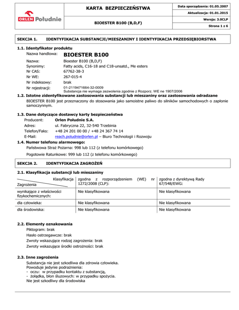 Data sporządzenia: 01.05.2007 KARTA BEZPIECZEŃSTWA Aktualizacja: 01.01.2015 Wersja: 3.0CLP BIOESTER B100 (B,D,F) SEKCJA 1. Strona 1 z 6 IDENTYFIKACJA SUBSTANCJI/MIESZANINY I IDENTYFIKACJA PRZEDSIĘBIORSTWA 1.1. Identyfikator produktu Nazwa handlowa: BIOESTER B100 Nazwa: Synonimy: Nr CAS: Bioester B100 (B,D,F) Fatty acids, C16-18 and C18-unsatd., Me esters 67762-38-3 Nr WE: 267-015-4 Nr indeksowy: brak Nr rejestracji: 01-2119471664-32-0009 Substancja nie wymaga zezwolenia zgodnie z Rozporz. WE ne 1907/2006 1.2. Istotne zidentyfikowane zastosowania substancji lub mieszaniny oraz zastosowania odradzane BIOESTER B100 jest przeznaczony do stosowania jako samoistne paliwo do silników samochodowych o zapłonie samoczynnym. 1.3. Dane dotyczące dostawcy karty bezpieczeństwa Producent: Orlen Południe S.A. Adres: ul. Fabryczna 22, 32-540 Trzebinia Telefon/Faks: +48 24 201 00 00 / +48 24 367 74 14 E-Mail: [email protected] – Biuro Technologii i Rozwoju 1.4. Numer telefonu alarmowego: Państwowa Straż Pożarna: 998 lub 112 (z telefonu komórkowego) Pogotowie Ratunkowe: 999 lub 112 (z telefonu komórkowego) SEKCJA 2. IDENTYFIKACJA ZAGROŻEŃ 2.1. Klasyfikacja substancji lub mieszaniny Klasyfikacja Zagrożenia zgodna z rozporządzeniem 1272/2008 (CLP): (WE) nr zgodna z dyrektywą Rady 67/548/EWG: wynikające z właściwości fizykochemicznych: Nie klasyfikowana Nie klasyfikowana dla człowieka: Nie klasyfikowana Nie klasyfikowana dla środowiska: Nie klasyfikowana Nie klasyfikowana 2.2. Elementy oznakowania Piktogram: brak Hasło ostrzegawcze: brak Zwroty wskazujące rodzaj zagrożenia: brak Zwroty wskazujące środki ostrożności: brak 2.3. Inne zagrożenia Substancja nie jest szkodliwa dla zdrowia człowieka. Powoduje jedynie podrażnienia: - oczu: w przypadku kontaktu z substancją, - żołądka, błon śluzowych: w przypadku spożycia. Nie jest szkodliwy dla środowiska KARTA BEZPIECZEŃSTWA Data sporządzenia: 01.05.2007 Aktualizacja: 01.01.2015 Wersja: 3.0CLP BIOESTER B100 (B,D,F) SEKCJA 3. Strona 2 z 6 SKŁAD/INFORMACJA O SKŁADNIKACH 3.1. Substancje Nazwa substancji Wzór % wagowy Nr CAS Nr WE Nr indeksowy Fatty acids, C16-18 and C18-unsatd., Me esters Nie dotyczy min. 80 67762-38-3 267-015-4 brak Charakterystyka chemiczna: Mieszanina estrów metylowych wyższych kwasów tłuszczowych, charakterystycznych dla oleju rzepakowego. Składniki niebezpieczne. Substancja spełniająca wymagania normy PN EN 14214 nie zawiera składników klasyfikowanych jako substancje niebezpieczne. 3.2. Mieszaniny Nie dotyczy – produkt jest substancją. SEKCJA 4. ŚRODKI PIERWSZEJ POMOCY 4.1. Opis środków pierwszej pomocy Wdychanie: Brak szczególnych sposobów działania Kontakt ze skórą: Zdjąć zanieczyszczoną odzież i buty, zmyć skórę dużą ilością mydła i wody Kontakt z oczami: Przemywać oczy bieżącą wodą przez 10-15 minut przy otwartej powiece. Jeśli po tym ból nie ustanie, wezwać lekarza Połknięcie: Nie wywoływać wymiotów, przepłukać usta wodą, jeśli osoba jest przytomna dać do wypicia 0,5 litra wody; w przypadku złego samopoczucia wezwać lekarza 4.2. Najważniejsze ostre i opóźnione objawy oraz skutki narażenia Brak 4.3. Wskazania dotyczące wszelkiej natychmiastowej pomocy lekarskiej i szczególnego postępowania z poszkodowanym Brak SEKCJA 5. POSTĘPOWANIE W PRZYPADKU POŻARU Substancja palna. W przypadku pożaru istnieje możliwość powstania niebezpiecznych gazów pożarowych lub oparów. Zalecenia ogólne: Zawiadomić otoczenie o pożarze, usunąć z obszaru zagrożenia wszystkie osoby nie biorące udziału w likwidowaniu awarii, w razie potrzeby zarządzić ewakuację, wezwać ekipy ratownicze, Straż Pożarną. Należy wyeliminować źródła zapłonu – ugasić otwarty płomień. 5.1. Środki gaśnicze Odpowiednie środki gaśnicze: gaśnica śniegowa, gaśnica proszkowa, piany. Niewłaściwe środki gaśnicze: zwarte prądy wody. Uwaga: nie stosować wody. 5.2. Szczególne zagrożenia związane z substancją Przy spalaniu powstają toksyczne tlenki, tlenek węgla, dwutlenek węgla, przy niepełnym spalaniu sadza 5.3. Informacje dla straży pożarnej Udział w akcji ratowniczej wyłącznie osób przeszkolonych, wyposażonych w aparat oddechowy z niezależnym dopływem powietrza, odzież ochronną aby zapobiec kontaktu z oczami i skórą. KARTA BEZPIECZEŃSTWA Data sporządzenia: 01.05.2007 Aktualizacja: 01.01.2015 BIOESTER B100 (B,D,F) SEKCJA 6. Wersja: 3.0CLP Strona 3 z 6 POSTĘPOWIANIE W PRZYPADKU NIEZAMIERZONEGO UWOLNIENIA DO ŚRODOWISKA 6.1. Indywidualne środki ostrożności, wyposażenie ochronne i procedury w sytuacjach awaryjnych Wyeliminować wszystkie źródła zapłonu. Oddalić się od źródła niebezpieczeństwa, w kierunku pod wiatr. 6.2. Środki ostrożności w zakresie ochrony środowiska Nie dopuścić do przedostania się substancji w większych ilościach do wody gruntowej lub kanalizacji bez rozcieńczenia, wyciek obwałować i zebrać. 6.3. Metody i materiały zapobiegające rozprzestrzenianiu się skażenia i służące do usuwania skażenia Ograniczyć rozprzestrzenianie się wycieku przez obwałowanie terenu; zebraną ciecz odpompować. Małe ilości rozlanej substancji przysypać niepalnym materiałem chłonnym np. suchą ziemią, piaskiem lub trocinami, zebrać zanieczyszczone sorbenty. 6.4. Odniesienia do innych sekcji Odnieść się również do sekcji 8 i 13 karty bezpieczeństwa. SEKCJA 7. POSTĘPOWANIE Z SUBSTANCJAMI I MIESZANINAMI ORAZ ICH MAGAZYNOWANIE 7.1. Środki ostrożności dotyczące bezpiecznego postępowania Podejmowanie szczególnych działań nie jest konieczne: BIOESTER B100 nie jest substancją trującą. Należy unikać bezpośredniego kontaktu z substancją. 7.2. Warunki bezpiecznego magazynowania, łącznie z informacjami dotyczącymi wszelkich wzajemnych niezgodności Przechowywać w chłodnym, dobrze wentylowanym obszarze. Składować wyłącznie w zamkniętych zbiornikach, w temperaturze otoczenia +15