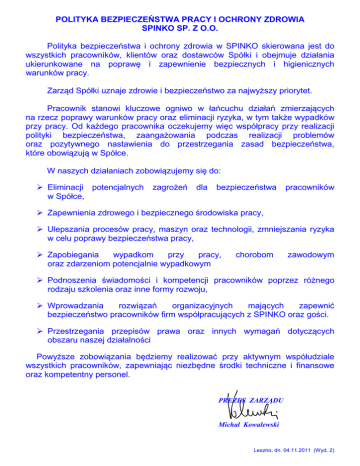 POLITYKA BEZPIECZEŃSTWA PRACY I OCHRONY ZDROWIA SPINKO SP. Z O.O. Polityka bezpieczeństwa i ochrony zdrowia w SPINKO skierowana jest do wszystkich pracowników, klientów oraz dostawców Spółki i obejmuje działania ukierunkowane na poprawę i zapewnienie bezpiecznych i higienicznych warunków pracy. Zarząd Spółki uznaje zdrowie i bezpieczeństwo za najwyższy priorytet. Pracownik stanowi kluczowe ogniwo w łańcuchu działań zmierzających na rzecz poprawy warunków pracy oraz eliminacji ryzyka, w tym także wypadków przy pracy. Od każdego pracownika oczekujemy więc współpracy przy realizacji polityki bezpieczeństwa, zaangażowania podczas realizacji problemów oraz pozytywnego nastawienia do przestrzegania zasad bezpieczeństwa, które obowiązują w Spółce. W naszych działaniach zobowiązujemy się do: Eliminacji potencjalnych w Spółce, zagrożeń dla bezpieczeństwa pracowników Zapewnienia zdrowego i bezpiecznego środowiska pracy, Ulepszania procesów pracy, maszyn oraz technologii, zmniejszania ryzyka w celu poprawy bezpieczeństwa pracy, Zapobiegania wypadkom przy pracy, oraz zdarzeniom potencjalnie wypadkowym chorobom zawodowym Podnoszenia świadomości i kompetencji pracowników poprzez różnego rodzaju szkolenia oraz inne formy rozwoju, Wprowadzania rozwiązań organizacyjnych mających zapewnić bezpieczeństwo pracowników firm współpracujących z SPINKO oraz gości. Przestrzegania przepisów prawa oraz innych wymagań dotyczących obszaru naszej działalności Powyższe zobowiązania będziemy realizować przy aktywnym współudziale wszystkich pracowników, zapewniając niezbędne środki techniczne i finansowe oraz kompetentny personel. PREZES ZARZĄDU Michał Kowalewski Leszno, dn. 04.11.2011 (Wyd. 2)