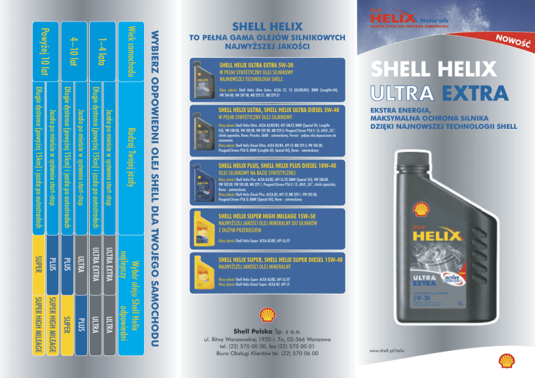 Rodzaj Twojej jazdy Jazda po mieÊcie w systemie start-stop D∏ugie dystanse (powy˝ej 15km) i jazda po autostradach Jazda po mieÊcie w systemie start-stop D∏ugie dystanse (powy˝ej 15km) i jazda po autostradach Jazda po mieÊcie w systemie start-stop D∏ugie dystanse (powy˝ej 15km) i jazda po autostradach ULTRA Wybór oleju Shell Helix najlepszy odpowiedni ULTRA EXTRA ULTRA PLUS SUPER SUPER HIGH MILEAGE SUPER HIGH MILEAGE ULTRA EXTRA ULTRA PLUS PLUS SUPER WYBIERZ ODPOWIEDNI OLEJ SHELL DLA TWOJEGO SAMOCHODU Wiek samochodu 1–4 lata 4–10 lat Powy˝ej 10 lat SHELL HELIX NOW OÂå TO PEŁNA GAMA OLEJÓW SILNIKOWYCH NAJWY˚SZEJ JAKOÂCI SHELL HELIX ULTRA EXTRA 5W-30 W PE¸NI SYNTETYCZNY OLEJ SILNIKOWY NAJNOWSZEJ TECHNOLOGII SHELL Klasy jakoÊci Shell Helix Ultra Extra: ACEA C2, C3 (A3/B3/B4), BMW (Longlife-04), VW 504.00, VW 507.00, MB 229.51, MB 229.31 SHELL HELIX ULTRA, SHELL HELIX ULTRA DIESEL 5W-40 W PEŁNI SYNTETYCZNY OLEJ SILNIKOWY Klasy jakoÊci Shell Helix Ultra: ACEA A3/B3/B4, API SM/CF, BMW (Special Oil, Longlife Oil), VW 500.00, VW 502.00, VW 505.00, MB 229.3, Peugeot/Citroen PSA E i D, JASO „SG”, silniki japoƒskie, Rover, Porsche, SAAB - zatwierdzony, Ferrari - jedyny olej dopuszczony do stosowania Klasy jakoÊci Shell Helix Diesel Ultra: ACEA B3/B4, API CF, MB 229.3, VW 505.00, Peugeot/Citroen PSA D, BMW (Longlife Oil, Special Oil), Rover - zatwierdzony EKSTRA ENERGIA, MAKSYMALNA OCHRONA SILNIKA DZI¢KI NAJNOWSZEJ TECHNOLOGII SHELL SHELL HELIX PLUS, SHELL HELIX PLUS DIESEL 10W-40 OLEJ SILNIKOWY NA BAZIE SYNTETYCZNEJ Klasy jakoÊci Shell Helix Plus: ACEA A3/B3, API SL/CF, BMW (Special Oil), VW 500.00, VW 502.00, VW 505.00, MB 229.1, Peugeot/Citroen PSA E i D, JASO „SG”, silniki japoƒskie, Rover - zatwierdzony Klasy jakoÊci Shell Helix Diesel Plus: ACEA B3, API CF, MB 229.1, VW 505.00, Peugeot/Citroen PSA D, BMW (Special Oil), Rover - zatwierdzony SHELL HELIX SUPER HIGH MILEAGE 15W-50 NAJWY˚SZEJ JAKOÂCI OLEJ MINERALNY DO SILNIKÓW Z DU˚YM PRZEBIEGIEM Klasy jakoÊci Shell Helix Super: ACEA A2/B2, API SL/CF SHELL HELIX SUPER, SHELL HELIX SUPER DIESEL 15W-40 NAJWY˚SZEJ JAKOÂCI OLEJ MINERALNY Klasy jakoÊci Shell Helix Super: ACEA A2/B2, API SL/CF Klasy jakoÊci Shell Helix Diesel Super: ACEA B2, API CF Shell Polska Sp. z o.o. ul. Bitwy Warszawskiej 1920 r. 7a, 02-366 Warszawa tel. (22) 570 00 00, fax (22) 570 00 01 Biuro Obs∏ugi Klientów tel. (22) 570 06 00 www.shell.pl/helix EKSTRA ENERGIA, MAKSYMALNA OCHRONA SILNIKA DZI¢KI NAJNOWSZEJ TECHNOLOGII SHELL SAMOCHODY NAP¢DZANE SILNIKIEM BENZYNOWYM Z KATALIZATOREM Shell Helix Ultra Extra 5W-30 zapewnia ochron´ wszystkich silników benzynowych posiadajàcych trójdro˝ny katalizator ze wzgl´du na zmniejszonà iloÊç dodatków zawierajàcych siark´ i fosfor. SAMOCHODY NAP¢DZANE SILNIKIEM DIESLA Z FILTREM CZÑSTECZEK STAŁYCH (DPF) Dzi´ki najnowszej technologii oraz unikalnym właÊciwoÊciom czyszczàcym, olej Shell Helix Ultra Extra 5W-30 zapewnia wyjàtkowà energi´ dla silnika Twojego samochodu nawet w trakcie wydłu˝onego okresu u˝ytkowania oleju. Spełnia najnowsze normy: VW, Audi, BMW i Mercedes-Benz. Shell Helix Ultra Extra 5W-30 jest syntetycznym olejem opracowanym w technologii „low SAPS” zaprojektowanym specjalnie do stosowania w samochodach nap´dzanych silnikiem Diesla wyposa˝onym w filtr czàstek stałych. Olej ten ma zmniejszonà iloÊç dodatków zawierajàcych siark´ i fosfor. Tworzy znacznie mniej popiołu, nie powodujàc jak powszechnie dotàd u˝ywane oleje silnikowe, blokowania kosztownych filtrów sadzy montowanych w układach wydechowych pojazdów. Shell Helix Ultra Extra zawiera pakiet specjalnych dodatków czyszczàcych, które aktywnie usuwajà szkodliwe osady z silnika utrzymujàc go w doskona∏ym stanie w trakcie całego okresu intensywnej eksploatacji. Oczyszczanie i ochrona silnika majà szczególne znaczenie podczas wydłu˝onych okresów u˝ytkowania oleju. W JAKI SPOSÓB SHELL HELIX OCZYSZCZA SILNIK? Nawarstwianie si´ osadów jest spowodowane ∏àczeniem si´ ze sobà czàsteczek w´gla (A). Shell Helix zapobiega ∏àczeniu si´ czàsteczek, a tym samym osadzaniu si´ zanieczyszczeƒ (B). Wp∏ywa to znaczàco na osiàgi silnika i wyd∏u˝enie okresu jego u˝ytkowania. (A) (B) > CECHY KORZYÂCI zastosowanie najnowszej technologii Shell ekstra energia unikalny pakiet specjalnych dodatków czyszczàcych oczyszczenie i doskonała ochrona silnika nawet w ekstremalnych warunkach jego pracy wytwarzanie znacznie mniejszej iloÊci popiołu nie powoduje blokowania filtrów sadzy wydłu˝ony okres u˝ytkowania oleju mi´dzy wymianami wymiana oleju co 30 000 km benzyna, co 50 000 km Diesel zmniejszona iloÊç dodatków zawierajàcych siark´ i fosfor ochrona silnika benzynowego z katalizatorem długotrwa∏a odpornoÊç na działanie temperatury i czynników utleniajàcych zabezpieczenie silnika podczas całego okresu eksploatacji oleju (zgodnie z zaleceniami producenta silinika) (do kolejnej jego wymiany) niska lepkoÊç, szybki przepływ oleju i małe tarcie mniejsze zu˝ycie paliwa, bezproblemowy start silnika nawet w niskich temaperaturach ograniczenie wibracji silnika bardziej cicha i płynna jazda DLACZEGO WARTO KUPIå NOWY OLEJ SHELL HELIX ULTRA EXTRA: • Unikalne właÊciwoÊci - ekstra energia oraz maksymalna ochrona silnika • Do stosowania w wi´kszoÊci silników benzynowych z trójdro˝nym katalizatorem oraz silników Diesla w tym z filtrem czàstek stałych (DPF) • Umo˝liwia wydłu˝enie okresów u˝ytkowania oleju mi´dzy jego wymianami (do 30 000 km benzyna, do 50 000 km Diesel)* Dzi´ki temu silnik pracuje bardziej cicho i p∏ynnie. CECHY ORAZ KORZYÂCI ZE STOSOWANIA OLEJU SHELL HELIX ULTRA EXTRA • Spełnia wszystkie najnowsze wymagania niemieckich producentów samochodów: VW, Audi, BMW, Mercedes-Benz * zgodnie z zaleceniami producenta silnika KLASY JAKOÂCI I REKOMENDACJE PRODUCENTÓW SAMOCHODÓW ACEA C2, C3 (A3 / B4) Mercedes-Benz MB 229.51 BM