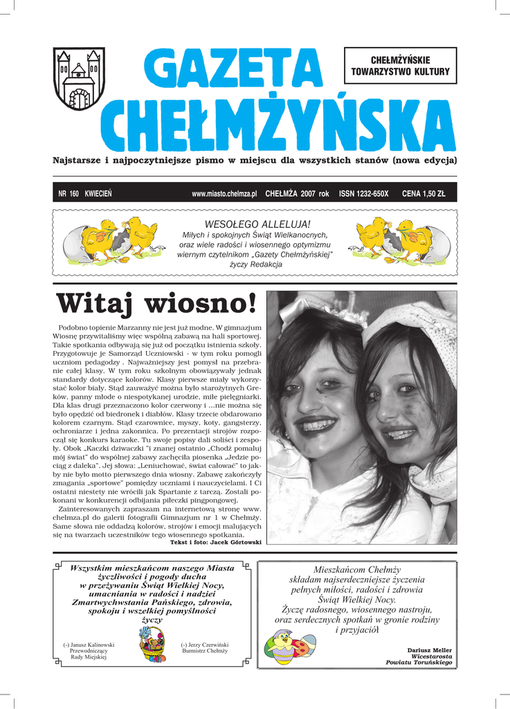 CHE£M¯YÑSKIE TOWARZYSTWO KULTURY Najstarsze i najpoczytniejsze pismo w miejscu dla wszystkich stanów (nowa edycja) NR 160 KWIECIEÑ www.miasto.chelmza.pl CHE£M¯A 2007 rok ISSN 1232-650X CENA 1,50 Z£ WESOŁEGO ALLELUJA! Miłych i spokojnych Świąt Wielkanocnych, oraz wiele radości i wiosennego optymizmu wiernym czytelnikom „Gazety Chełmżyńskiej” życzy Redakcja Witaj wiosno! Podobno topienie Marzanny nie jest ju¿ modne. W gimnazjum Wiosnê przywitaliœmy wiêc wspóln¹ zabaw¹ na hali sportowej. Takie spotkania odbywaj¹ siê ju¿ od pocz¹tku istnienia szko³y. Przygotowuje je Samorz¹d Uczniowski - w tym roku pomogli uczniom pedagodzy . Najwa¿niejszy jest pomys³ na przebranie ca³ej klasy. W tym roku szkolnym obowi¹zywa³y jednak standardy dotycz¹ce kolorów. Klasy pierwsze mia³y wykorzystaæ kolor bia³y. St¹d zauwa¿yæ mo¿na by³o staro¿ytnych Greków, panny m³ode o niespotykanej urodzie, mi³e pielêgniarki. Dla klas drugi przeznaczono kolor czerwony i ...nie mo¿na siê by³o opêdziæ od biedronek i diab³ów. Klasy trzecie obdarowano kolorem czarnym. St¹d czarownice, myszy, koty, gangsterzy, ochroniarze i jedna zakonnica. Po prezentacji strojów rozpocz¹³ siê konkurs karaoke. Tu swoje popisy dali soliœci i zespo³y. Obok „Kaczki dziwaczki ”i znanej ostatnio „ChodŸ pomaluj mój œwiat” do wspólnej zabawy zachêci³a piosenka „Jedzie poci¹g z daleka”. Jej s³owa: „Leniuchowaæ, œwiat ca³owaæ” to jakby nie by³o motto pierwszego dnia wiosny. Zabawê zakoñczy³y zmagania „sportowe” pomiêdzy uczniami i nauczycielami. I Ci ostatni niestety nie wrócili jak Spartanie z tarcz¹. Zostali pokonani w konkurencji odbijania pi³eczki pingpongowej. Zainteresowanych zapraszam na internetow¹ stronê www. chelmza.pl do galerii fotografii Gimnazjum nr 1 w Che³m¿y. Same s³owa nie oddadz¹ kolorów, strojów i emocji maluj¹cych siê na twarzach uczestników tego wiosennego spotkania. Tekst i foto: Jacek Górtowski Wszystkim mieszkańcom naszego Miasta życzliwości i pogody ducha w przeżywaniu Świąt Wielkiej Nocy, umacniania w radości i nadziei Zmartwychwstania Pańskiego, zdrowia, spokoju i wszelkiej pomyślności życzy (-) Janusz Kalinowski Przewodniczący Rady Miejskiej (-) Jerzy Czerwiński Burmistrz Chełmży Mieszkańcom Chełmży składam najserdeczniejsze życzenia pełnych miłości, radości i zdrowia Świąt Wielkiej Nocy. Życzę radosnego, wiosennego nastroju, oraz serdecznych spotkań w gronie rodziny i przyjaciół Dariusz Meller Wicestarosta Powiatu Toruñskiego STR. 8 GAZETA CHE£M¯YÑSKA NR 160 Zamiast kina – teatr 9 marca uczniowie kilku klas Gimnazjum nr 1 w Che³m¿y pod opiek¹ nauczycieli udali siê do Teatru im. Wiliama Horzycy w Toruniu. M³odzi ludzie nie przepadaj¹ za teatrem, wiêc zachêtê swoich polonistów i wychowawców traktowali z rezerw¹. Jednak wrócili pe³ni wra¿eñ i teraz to oni namawiaj¹ nauczycieli na kolejny wyjazd. „Niebieski, niebieski, niebieski”, bo taki tytu³ mia³o przedstawienie obejrzane przez che³m¿yñskich gimnazjalistów, to sztuka wspó³czesnego (rocznik ’67) wêgierskiego dramatopisarza. Przedstawia upadaj¹c¹ biedn¹ trupê cyrkow¹ „Filadelfiê”. Artyœci dawno przestali æwiczyæ, zmarnowali talent, stracili wszelkie ambicje. Marz¹ o lepszym ¿yciu, ale nie wiedz¹, jak te marzenia realizowaæ. Los daje im jednak szansê przyst¹pienia do miêdzynarodowej organizacji cyrków wêdrownych (WC). Widzowie staj¹ siê œwiadkami wyj¹tkowego przedstawienia cyrkowego – i to wzbudzi³o najwiêkszy aplauz m³odych ludzi. „Niebieski, niebieski, niebieski” to barwna ale gorzka opowieœæ o têsknocie za innym, lepszym ¿yciem, o przepaœci miêdzy marzeniami a rzeczywistoœci¹. Wspólny wyjazd uczniów i nauczycie- li sta³ siê okazj¹ do rozmowy nie tylko o teatrze, ale tak¿e o jêzyku. Sfrustrowani bohaterowie wyra¿ali bowiem swoje emocje, u¿ywaj¹c wulgaryzmów. M³odzi ludzie, którzy stykaj¹ siê z tym na co dzieñ, w³aœciwie reagowali na nieparlamentarne s³o- wa padaj¹ce ze sceny. Có¿, w ka¿dym spektaklu odbija siê prawdziwe ¿ycie i widz – doros³y czy uczeñ musi uœwiadomiæ sobie w teatrze tak¿e tê prawdê. Alina £oboda Odznaczeni Brązowym Kolejny sukces Krzyżem Zasługi Mateusza 21 marca odby³a siê w Urzêdzie Wojewódzkim w Bydgoszczy uroczystoœæ wrêczenia odznaczeñ pañstwowych przez wojewodê kujawsko – pomorskiego. Wœród wielu odznaczonych byli te¿ che³m¿anie i torunianka zatrudniona w Che³m¿y, którzy na wniosek burmistrza J. Czerwiñskiego otrzymali Br¹zowe Krzy¿e Zas³ugi. Uhonorowani zostali: Iwona Wierzbicka – nauczycielka przyrody w Szkole Podstawowej nr 3, od 1992 r. opiekunka Szkolnego Ko³a Krajoznawczo – Turystycznego, które odnosi znacz¹ce ADRES REDAKCJI: Rynek 4, 87-140 Che³m¿a, tel. 675-24-61. REDAGUJE ZESPÓ£: Barbara Kuna, Dariusz Meller, Ryszard Mu zio³, El¿ bie ta No wac ka, Tomasz Wiœniewski. Materia³ów nie zamówionych redakcja nie zwraca, zastrzega sobie prawo skrótów oraz zmiany tytu³ów. Redakcja nie odpowiada za treœæ zamieszczonych reklam i og³oszeñ. Konto Che³m¿yñskiego Towarzystwa Kultury: Bank Spó³dzielczy w Brodnicy, Oddzia³ w Che³m¿y, ul. Rynek 2, nr konta: 09 9484 1017 0200 1687 2002 0001. Og³oszenia i reklamy p³atne: 1 modu³ (wielkoœæ w mm 25x50) – prywatne og³oszenia drobne, ¿yczenia okolicznoœciowe – 10 z³, firmy (reklamy, og³oszenia) - 20 z³, pierwsza strona 50% dro¿ej. sukcesy w skali kraju, organizatorka wielu rajdów, wycieczek, marszy na orientacjê – imprez o charakterze lokalnym, oddzia³owym i wojewódzkim. Micha³ Krzemiñski – kierownik jednostki terenowej WOPR w Che³m¿y, a tak¿e wiceprezes Rejonowego Zarz¹du WOPR w Toruniu; zaanga¿owany w poprawê bezpieczeñstwa k¹pi¹cych siê i korzystaj¹cych ze sprzêtu p³ywaj¹cego. Zabezpiecza imprezy odbywaj¹ce siê na J. Che³m¿yñskim, inicjuje wiele przedsi