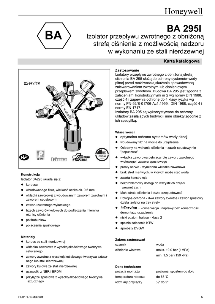 Honeywell BA BA 295I Izolator przepływu zwrotnego z obniŜoną strefą ciśnienia z moŜliwością nadzoru w wykonaniu ze stali nierdzewnej Karta katalogowa Zastosowanie Izolatory przepływu zwrotnego z obniŜoną strefą ciśnienia BA 295 słuŜą do ochrony systemów wody pitnej przed moŜliwością skaŜenia spowodowaną zalewarowaniem zwrotnym lub ciśnieniowym przepływem zwrotnym. Budowa BA 295 jest zgodna z zaleceniami konstrukcyjnymi nr 2 wg normy DIN 1988, część 4 i zapewnia ochronę do 4 klasy ryzyka wg normy PN-92/B-01706-Az1:1999, DIN 1988, część 4 i normy EN 1717. Izolatory BA 295 są wykorzystywane do ochrony układów zasilających budynki i inne obiekty zgodnie z ich specyfiką. Właściwości optymalna ochrona systemów wody pitnej wbudowany filtr na wlocie do urządzenia Odporny na wahania ciśnienia – zawór spustowy nie "popuszcza" wkładka zaworowa pełniąca rolę zaworu zwrotnego wlotowego i zaworu spustowego prosty serwis - wymienna wkładka zaworowa Konstrukcja Izolator BA295 składa się z: korpusu wbudowanego filtra, wielkość oczka ok. 0.6 mm wkładki zaworowej z wbudowanym zaworem zwrotnym i zaworem spustowym zaworu zwrotnego wylotowego trzech zaworów kulowych do podłączenia miernika róŜnicy ciśnienia półśrubunków połączenia spustowego Materiały korpus ze stali nierdzewnej wkładka zaworowa z wysokojakościowego tworzywa sztucznego brak stref martwych, w których moŜe stać woda zwarta konstrukcja bezproblemowy dostęp do wszystkich części wewnętrzych Mała strata ciśnienia i duŜa przepustowość Potrójna ochrona - dwa zawory zwrotne i zawór spustowy dzielą izolator na trzy strefy – konserwacja i naprawy bez konieczności demontaŜu urządzenia niski poziom hałasu - klasa 2 spełnia zalecenia KTW aprobaty DVGW Zakres zastosowań czynnik woda ciśnienie wlotowe maks. 10.0 bar (1MPa) min. 1.5 bar (150 kPa) zawory zwrotne z wysokojakościowego tworzywa sztucznego lub stali nierdzewnej zawory kulowe ze stali nierdzewnej uszczelki z NBR i EPDM przyłącze spustowe z wysokojakościowego tworzywa sztucznego PLH1H013MB0904 Dane techniczne pozycja montaŜu pozioma, spustem do dołu temperatura robocza do 65 °C rozmiary przyłączy ½" do 2" 5 Izolator przepływów zwrotnych BA 295 h R H Zasada działania Izolatory przepływu zwrotnego typu BA podzielone są na trzy strefy. Ciśnienie w komorze wlotowej (strefa 1) jest wyŜsze niŜ w komorze środkowej (strefa 2), które jest z kolei wyŜsze niŜ w komorze wylotowej (strefa 3). Spadek ciśnienia pomiędzy poszczególnymi strefami jest dokładnie określony. Jeśli róŜnica ciśnienia pomiędzy strefami 1 i 2 (komorą wlotową i komorą środkową) spadnie do granicy 0,14 bara (140kPa)(poniŜej której istnieje ryzyko zalewarowania zwrotnego lub przepływu zwrotnego ciśnieniowego), zawór w komorze środkowej otwiera się do atmosfery a zawory zwrotne zamykają. Woda z komory środkowej wypływa na zewnątrz izolatora a zasilanie w wodę zostaje przerwane i zabezpieczone. Wykonania BA 295 I – . . . A 50 = wersja standardowa z przyłączami gwintowymi 1/2", 3/4", 1 1/2" i 2" l L Wielkość przyłącza R CięŜar (w przybliŜeniu) [kg] Wymiary [mm] L l H h Przepływ [m3/h] przy ∆p = 1.0 bar (0.1 MPa) 1/2" 1.50 3/4" 1.55 1" 1.65 1 1/4" 4.60 1 1/2" 4.70 2" 4.80 195 135 80 138 208 140 80 138 225 146 80 138 315 220 284 162 315 220 284 162 345 230 284 162 3.0 3.5 4.0 8.7 13.6 21.2 Akcesoria D 06 F 6 4 8 2 0 Regulator ciśnienia Nie wywołujący hałasu regulator ciśnienia ze skalą nastawy. Maksymalne ciśnienie wlotowe 25.0 bar (0.25 MPa), zakres ciśnienia wylotowego od 1.5 – 6.0 bar (0.15 do 0.6 MPa) bar A = do 40 °C - klosz z tworzywa sztucznego B = do 70 °C - klosz z mosi ądzu 10 TK 295 D 06 F F 76 S Zestaw testowy Elektroniczny przyrząd do badania ciśnienia ze wskaźnikiem cyfrowym, idealny dla kontroli i konserwacji wszystkich izolatorów przepływów zwrotnych typu BA. Obudowa z aluminium. TKA 295 Zestaw testowy Analogowy przyrząd do badania ciśnienia z analogowym wskaźnikiem róŜnicy ciśnień, idealny dla kontroli i konserwacji wszystkich izolatorów przepływów zwrotnych typu BA. F 76 S 6 Filtr drobnosiatkowy z płukaniem wstecznym AA = klosz z tworzywa sztucznego AAM = klosz z czerwonego brązu PLH1H013MB090 Izolator przepływów zwrotnych BA 295 Przykład instalacji Zasady instalacji zamontować zawory odcinające umoŜliwiają konserwację i obsługę bez demontaŜu izolatora, tzw. instalować poziomo, zaworem wypływowym ku dołowi zapewnić łatwy dostęp do urządzenia ułatwia konserwację i kontrolę Izolator BA295 posiada wbudowany filtr, nie ma więc konieczności montowania go (chyba, Ŝe zanieczyszczenie wody wymaga gęstszej siatki). Filtr wewnętrzny powinien być czyszczony co najmniej raz na pół roku, lub częściej jeŜeli jest to wymagane ze względu na duŜy stopień zanieczyszczenia wody. Czyszczenie filtra naleŜy do standardowych czynności eksploatacyjnych i nie podlega czynnościom wykonywanych w ramach gwarancji. filtr chroni urządzenie przed zanieczyszczeniami nie montować w miejscu naraŜonym na zalanie instalować w wentylowanych i chronionych przed zamarzaniem pomieszczeniach podłączyc do kanalizacji z odpowiednią przepustowością Za izolatorem nie moŜe być podłączone do instalacji Ŝadne inne niechronione zasilanie! Typowe zastosowania Izolatory przepływu zwrotnego BA zalecane są do zastosowań w układach zasilania budynków i obiektów produkcyjno-usługowo-handlowych. Instaluje się w instalacjach wody pitnej w miejscach naraŜonych na kontakt z płynem zaliczanym do 4 kategorii. Stosowane jako zabezpieczenie główne na przyłączu instalacji do sieci wodociągowej. Powinny być instalowane w układach zasilania m.in.: pralni chemicznych myjni chemicznych instalacji zmiękczania i odkwaszania; regeneracji z lub bez kwasów i zasad; dezynfekcji formaliną laboratoriów fotograficznych kąpieli galwanicznych podgrzew