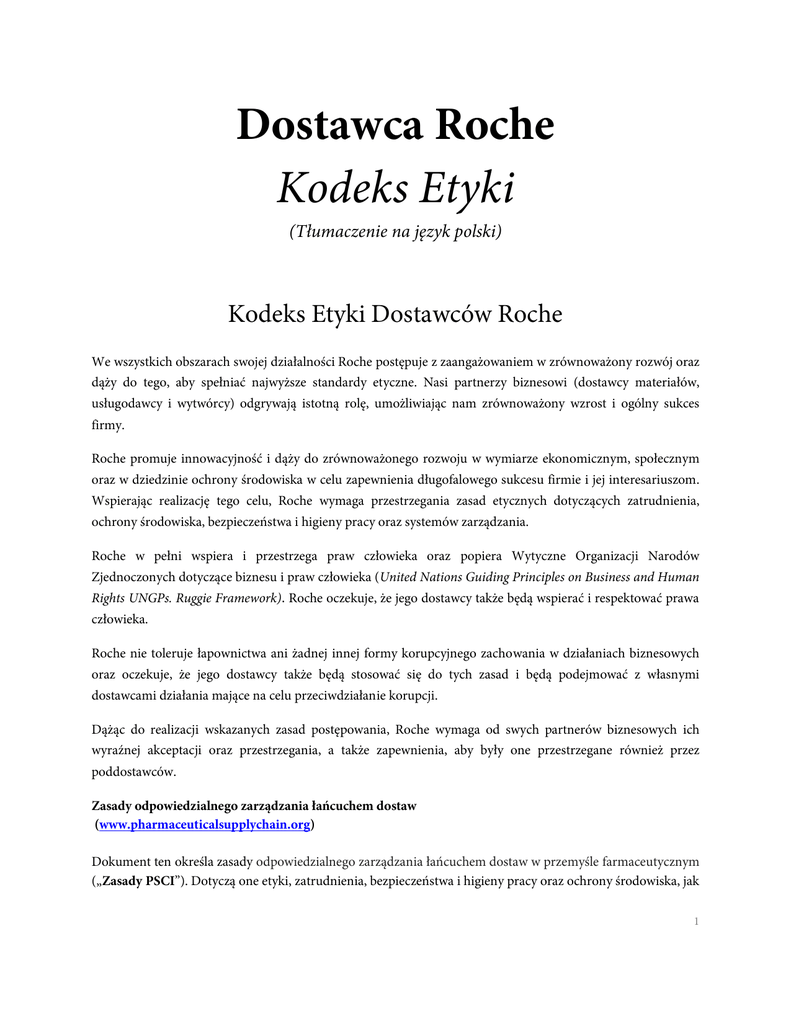 Dostawca Roche Kodeks Etyki (Tłumaczenie na język polski) Kodeks Etyki Dostawców Roche We wszystkich obszarach swojej działalności Roche postępuje z zaangażowaniem w zrównoważony rozwój oraz dąży do tego, aby spełniać najwyższe standardy etyczne. Nasi partnerzy biznesowi (dostawcy materiałów, usługodawcy i wytwórcy) odgrywają istotną rolę, umożliwiając nam zrównoważony wzrost i ogólny sukces firmy. Roche promuje innowacyjność i dąży do zrównoważonego rozwoju w wymiarze ekonomicznym, społecznym oraz w dziedzinie ochrony środowiska w celu zapewnienia długofalowego sukcesu firmie i jej interesariuszom. Wspierając realizację tego celu, Roche wymaga przestrzegania zasad etycznych dotyczących zatrudnienia, ochrony środowiska, bezpieczeństwa i higieny pracy oraz systemów zarządzania. Roche w pełni wspiera i przestrzega praw człowieka oraz popiera Wytyczne Organizacji Narodów Zjednoczonych dotyczące biznesu i praw człowieka (United Nations Guiding Principles on Business and Human Rights UNGPs. Ruggie Framework). Roche oczekuje, że jego dostawcy także będą wspierać i respektować prawa człowieka. Roche nie toleruje łapownictwa ani żadnej innej formy korupcyjnego zachowania w działaniach biznesowych oraz oczekuje, że jego dostawcy także będą stosować się do tych zasad i będą podejmować z własnymi dostawcami działania mające na celu przeciwdziałanie korupcji. Dążąc do realizacji wskazanych zasad postępowania, Roche wymaga od swych partnerów biznesowych ich wyraźnej akceptacji oraz przestrzegania, a także zapewnienia, aby były one przestrzegane również przez poddostawców. Zasady odpowiedzialnego zarządzania łańcuchem dostaw (www.pharmaceuticalsupplychain.org) Dokument ten określa zasady odpowiedzialnego zarządzania łańcuchem dostaw w przemyśle farmaceutycznym („Zasady PSCI”). Dotyczą one etyki, zatrudnienia, bezpieczeństwa i higieny pracy oraz ochrony środowiska, jak 1 również powiązanych z nimi systemów zarządzania. Zasady te mogą być dobrowolnie stosowane przez każdy podmiot w branży farmaceutycznej. Firmy stosujące wymienione wyżej Zasady: – Integrują je z własnymi programami współpracy z dostawcami i przestrzegają ich. – Uważają, że społeczeństwu i przedsiębiorstwom najlepiej służą odpowiedzialne zachowania i praktyki biznesowe. Podstawą tego jest założenie, że przedsiębiorcy muszą co najmniej, przestrzegać wszystkich obowiązujących przepisów prawa, regulacji i przyjętych zasad. – Są świadome różnic kulturowych i wyzwań związanych z interpretacją i stosowaniem Zasad w skali globalnej. Jakkolwiek firmy stosujące Zasady uważają, że oczekiwany cel ma charakter uniwersalny, to metody jego osiągniecia mogą być różne i muszą być zgodne z przepisami prawa, wartościami i oczekiwaniami wynikającymi z kulturowych uwarunkowań różnych społeczności na świecie. – Wierzą, że Zasady najskuteczniej można wdrożyć poprzez ustawiczne doskonalenie i idący za nim postęp. Etyka Dostawcy zobowiązani są działać uczciwie oraz etycznie. Etyka w biznesie obejmuje: Uczciwość i rzetelność w działalności gospodarczej oraz przestrzeganie zasad uczciwej konkurencji Wszelkie przejawy korupcji, wymuszenia czy defraudacji są zabronione. Dostawcom nie wolno wręczać ani przyjmować łapówek, niedozwolonych korzyści finansowych ani uczestniczyć w jakichkolwiek praktykach o charakterze korupcyjnym w relacjach z podmiotami gospodarczymi lub publicznymi. Dostawcy mają obowiązek prowadzić działalność gospodarczą zgodnie z zasadami uczciwej konkurencji oraz obowiązującymi przepisami prawa antymonopolowego. Partnerzy biznesowi Roche mają obowiązek stosować uczciwe praktyki w swojej działalności gospodarczej, w tym posługiwać się wyłącznie dokładnymi i prawdziwymi informacjami w reklamie. Wątpliwości Wszystkich pracowników należy zachęcać do zgłaszania wątpliwości, jak również informowania o niezgodnych z prawem działaniach w miejscu pracy, bez narażenia na ewentualne działania odwetowe, zastraszanie czy molestowanie. O ile zajdzie taka potrzeba, dostawcy mają obowiązek przeprowadzić postępowanie wyjaśniające oraz podjąć odpowiednie działania korygujące. 2 Prawa zwierząt Zwierzęta muszą być traktowane godnie, a ich ból i stres powinny być ograniczane do minimum. Testy na zwierzętach mogą być przeprowadzane wyłącznie po uprzednim rozważeniu możliwości zastąpienia takich badań innymi metodami, ograniczenia liczby zwierząt wykorzystywanych w badaniach lub udoskonalenia procedur pod kątem zminimalizowania zadawanego zwierzętom bólu i stresu. W każdym przypadku gdy jest to uzasadnione naukowo i akceptowane przez organy regulacyjne należy stosować alternatywne metody testowania. Ochrona prywatności Dostawcy mają obowiązek chronić informacje poufne i korzystać z nich tylko w sposób dozwolony, zapewniając ochronę prawa do prywatności firmy, pracowników i pacjentów. Zatrudnienie Obowiązkiem dostawców jest przestrzeganie praw przynależnych pracownikom oraz traktowanie ich w sposób godny i z szacunkiem. Sfera zatrudnienia obejmuje: Swoboda podejmowania pracy Zakazane jest korzystanie przez dostawców z pracy przymusowej, niewolniczej bądź z niedobrowolnej pracy więźniów. Praca dzieci i młodzieży Zakazane jest korzystanie przez dostawców z pracy dzieci. Zatrudnienie pracowników młodocianych poniżej 18 roku życia może mieć miejsce tylko w przypadku pracy pozbawionej zagrożeń oraz jeżeli wiek młodocianych pracowników jest wyższy od obowiązującego w danym kraju minimalnego wieku dopuszczalnego zatrudnienia oraz wieku ustania obowiązku szkolnego. Zakaz dyskryminacji Obowiązkiem dostawców jest zapewnienie pracownikom miejsc pracy wolnych od molestowania i dyskryminacji. Dyskryminacja z powodów takich, jak rasa, kolor skóry, wiek, płeć, orientacja seksualna, pocho