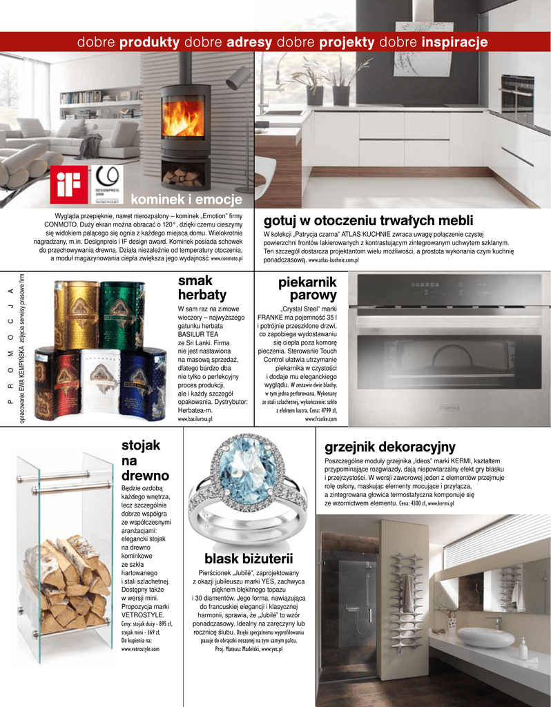 dobre produkty dobre adresy dobre projekty dobre inspiracje kominek i emocje smak herbaty opracowanie EWA KEMPIŃSKA zdjęcia serwisy prasowe firm P R O M O C J A Wygląda przepięknie, nawet nierozpalony – kominek „Emotion” firmy CONMOTO. Duży ekran można obracać o 120°, dzięki czemu cieszymy się widokiem palącego się ognia z każdego miejsca domu. Wielokrotnie nagradzany, m.in. Designpreis i IF design award. Kominek posiada schowek do przechowywania drewna. Działa niezależnie od temperatury otoczenia, a moduł magazynowania ciepła zwiększa jego wydajność. www.conmoto.pl W sam raz na zimowe wieczory – najwyższego gatunku herbata BASILUR TEA ze Sri Lanki. Firma nie jest nastawiona na masową sprzedaż, dlatego bardzo dba nie tylko o perfekcyjny proces produkcji, ale i każdy szczegół opakowania. Dystrybutor: Herbatea-m. www.basilurtea.pl gotuj w otoczeniu trwałych mebli W kolekcji „Patrycja czarna” Atlas Kuchnie zwraca uwagę połączenie czystej powierzchni frontów lakierowanych z kontrastującym zintegrowanym uchwytem szklanym. Ten szczegół dostarcza projektantom wielu możliwości, a prostota wykonania czyni kuchnię ponadczasową. www.atlas-kuchnie.com.pl piekarnik parowy „Crystal Steel” marki FRANKE ma pojemność 35 l i potrójnie przeszklone drzwi, co zapobiega wydostawaniu się ciepła poza komorę pieczenia. Sterowanie Touch Control ułatwia utrzymanie piekarnika w czystości i dodaje mu eleganckiego wyglądu. W zestawie dwie blachy, w tym jedna perforowana. Wykonany ze stali szlachetnej, wykończenie: szkło z efektem lustra. Cena: 4799 zł, www.franke.com stojak na drewno Będzie ozdobą każdego wnętrza, lecz szczególnie dobrze współgra ze współczesnymi aranżacjami: elegancki stojak na drewno kominkowe ze szkła hartowanego i stali szlachetnej. Dostępny także w wersji mini. Propozycja marki VETROSTYLE. Ceny: stojak duży - 895 zł, stojak mini - 369 zł, Do kupienia na: www.vetrostyle.com grzejnik dekoracyjny Poszczególne moduły grzejnika „Ideos” marki KERMI, kształtem przypominające rozgwiazdy, dają niepowtarzalny efekt gry blasku i przejrzystości. W wersji zaworowej jeden z elementów przejmuje rolę osłony, maskując elementy mocujące i przyłącza, a zintegrowana głowica termostatyczna komponuje się ze wzornictwem elementu. Cena: 4300 zł, www.kermi.pl blask biżuterii Pierścionek „Jubilé”, zaprojektowany z okazji jubileuszu marki YES, zachwyca pięknem błękitnego topazu i 30 diamentów. Jego forma, nawiązująca do francuskiej elegancji i klasycznej harmonii, sprawia, że „Jubilé” to wzór ponadczasowy. Idealny na zaręczyny lub rocznicę ślubu. Dzięki specjalnemu wyprofilowaniu pasuje do obrączki noszonej na tym samym palcu. Proj. Mateusz Madelski, www.yes.pl