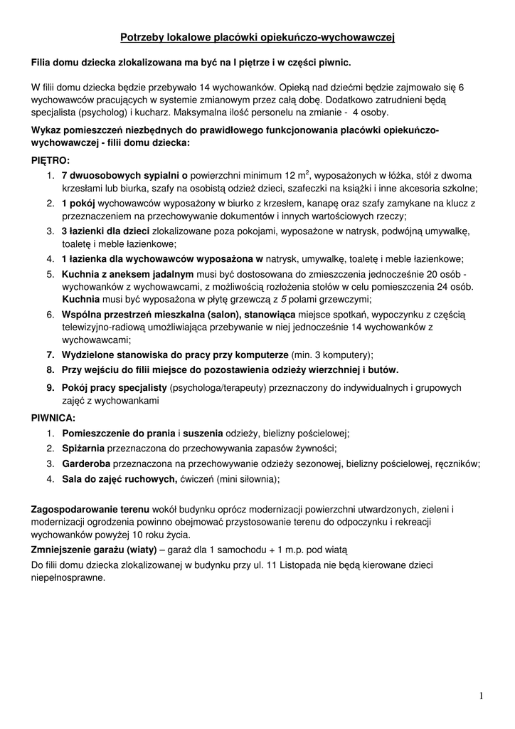 1 Potrzeby lokalowe placówki opiekuńczo-wychowawczej
