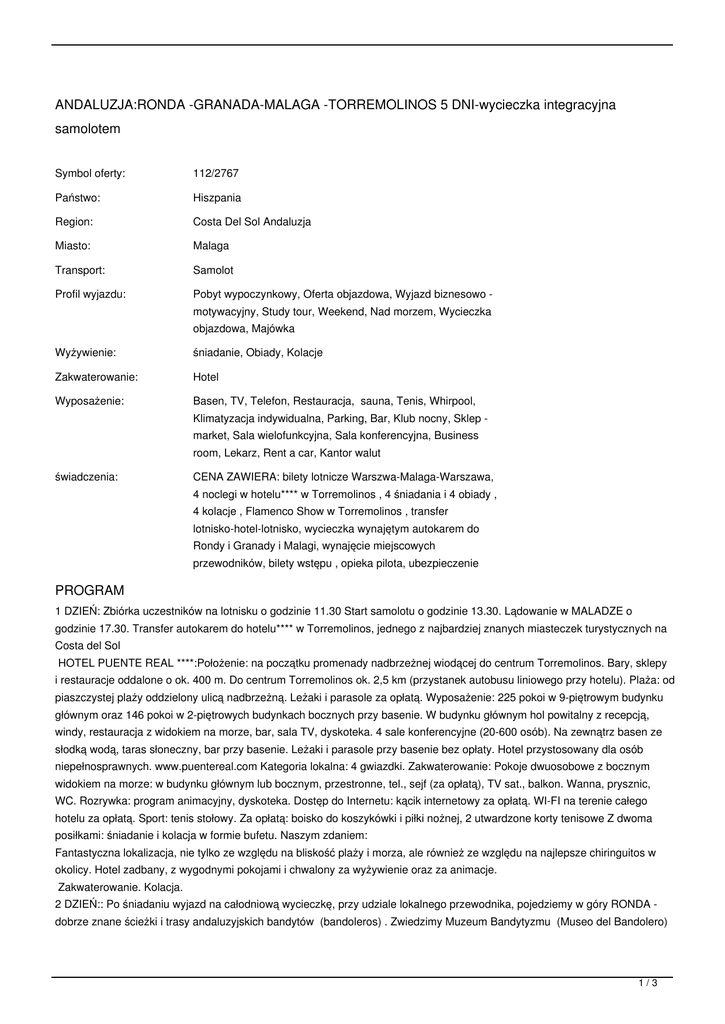 ANDALUZJA:RONDA -GRANADA-MALAGA -TORREMOLINOS 5 DNI-wycieczka integracyjna samolotem Symbol oferty: 112/2767 Państwo: Hiszpania Region: Costa Del Sol Andaluzja Miasto: Malaga Transport: Samolot Profil wyjazdu: Pobyt wypoczynkowy, Oferta objazdowa, Wyjazd biznesowo motywacyjny, Study tour, Weekend, Nad morzem, Wycieczka objazdowa, Majówka Wyżywienie: śniadanie, Obiady, Kolacje Zakwaterowanie: Hotel Wyposażenie: Basen, TV, Telefon, Restauracja, sauna, Tenis, Whirpool, Klimatyzacja indywidualna, Parking, Bar, Klub nocny, Sklep market, Sala wielofunkcyjna, Sala konferencyjna, Business room, Lekarz, Rent a car, Kantor walut świadczenia: CENA ZAWIERA: bilety lotnicze Warszwa-Malaga-Warszawa, 4 noclegi w hotelu**** w Torremolinos , 4 śniadania i 4 obiady , 4 kolacje , Flamenco Show w Torremolinos , transfer lotnisko-hotel-lotnisko, wycieczka wynajętym autokarem do Rondy i Granady i Malagi, wynajęcie miejscowych przewodników, bilety wstępu , opieka pilota, ubezpieczenie PROGRAM 1 DZIEŃ: Zbiórka uczestników na lotnisku o godzinie 11.30 Start samolotu o godzinie 13.30. Lądowanie w MALADZE o godzinie 17.30. Transfer autokarem do hotelu**** w Torremolinos, jednego z najbardziej znanych miasteczek turystycznych na Costa del Sol HOTEL PUENTE REAL ****:Położenie: na początku promenady nadbrzeżnej wiodącej do centrum Torremolinos. Bary, sklepy i restauracje oddalone o ok. 400 m. Do centrum Torremolinos ok. 2,5 km (przystanek autobusu liniowego przy hotelu). Plaża: od piaszczystej plaży oddzielony ulicą nadbrzeżną. Leżaki i parasole za opłatą. Wyposażenie: 225 pokoi w 9-piętrowym budynku głównym oraz 146 pokoi w 2-piętrowych budynkach bocznych przy basenie. W budynku głównym hol powitalny z recepcją, windy, restauracja z widokiem na morze, bar, sala TV, dyskoteka. 4 sale konferencyjne (20-600 osób). Na zewnątrz basen ze słodką wodą, taras słoneczny, bar przy basenie. Leżaki i parasole przy basenie bez opłaty. Hotel przystosowany dla osób niepełnosprawnych. www.puentereal.com Kategoria lokalna: 4 gwiazdki. Zakwaterowanie: Pokoje dwuosobowe z bocznym widokiem na morze: w budynku głównym lub bocznym, przestronne, tel., sejf (za opłatą), TV sat., balkon. Wanna, prysznic, WC. Rozrywka: program animacyjny, dyskoteka. Dostęp do Internetu: kącik internetowy za opłatą. WI-FI na terenie całego hotelu za opłatą. Sport: tenis stołowy. Za opłatą: boisko do koszykówki i piłki nożnej, 2 utwardzone korty tenisowe Z dwoma posiłkami: śniadanie i kolacja w formie bufetu. Naszym zdaniem: Fantastyczna lokalizacja, nie tylko ze względu na bliskość plaży i morza, ale również ze względu na najlepsze chiringuitos w okolicy. Hotel zadbany, z wygodnymi pokojami i chwalony za wyżywienie oraz za animacje. Zakwaterowanie. Kolacja. 2 DZIEŃ:: Po śniadaniu wyjazd na całodniową wycieczkę, przy udziale lokalnego przewodnika, pojedziemy w góry RONDA - dobrze znane ścieżki i trasy andaluzyjskich bandytów (bandoleros) . Zwiedzimy Muzeum Bandytyzmu (Museo del Bandolero) 1/3 Przejdziemy się po Plaza de Toros - gdzie organizowana jest słynna Corrida Goyesca. Na koniec spojrzenie z niezwykłego kamiennego mostu, łączącego dwa brzegi rzeki Tag, której nurt płynie 104 metry poniżej. Powrót do hotelu. KOLACJA Wieczorem wyjście do najlepszego lokalu w Torremolinos na pokaz tańców flamenco + muzyka live 3 DZIEŃ: Po śniadaniu wyjazd na całodniowa wycieczkę do największej atrakcji turystycznej prowincji - miasta GRANADA. Jednym z najczęściej odwiedzanych zabytków w Europie jest kompleks pałacowy muzułmańskiej dynastii Nasrydów - ALHAMBRA, wraz z położonymi obok arabskimi ogrodami w letniej rezydencji arabskich władców - Generalife oraz dzielnicą Albaicín wpisane na listę dziedzictwa światowego UNESCO. Artyzm architektury i sztuki muzułmańskiej widoczny w Alhambrze jest odzwierciedleniem zamysłu jego mecenasów, którzy zapragnęli stworzyć w tym miejscu raj na ziemi.Następnie ALBAICIN To wspaniały labirynt wąskich uliczek przeplatanych pachnących jaśminem ogrodami oraz placami i punktami widokowymi z których można kontemplować piękno pałaców na tle majestatycznych, ośnieżonych szczytów masywu Sierra Nevada. Powrót do Hotelu na kolację. 4 DZIEŃ:: Po śniadaniu dzień wolny dla uczestników, spacer po Torremolinos. Od lat TORREMOLINOS to ulubione miejsce spotkań młodych i szukających rozrywki urlopowiczów. Swoją niepowtarzalną atmosferę miejscowość ta zawdzięcza gościom z całego świata. Dla wszystkich, którzy szukają prawdziwie wakacyjnej atmosfery Toremolinos jest właściwym miejscem. Życie toczy się tu w barach, dyskotekach, restauracjach, klubach nocnych i na plaży. Możliwości rozrywki są ogromne. Miasteczko wodne ze zjeżdżalniami, pływalniami, sztucznymi falami i innymi atrakcjami oddalone jest o 3 km od miasta. Park rozrywki Tivolli w Arejo de la Miel (oddalony o ok. 3 km), kasyno w Benalmadena Costa (około 4 km dalej) oraz różnorodne bary i lokale flamenco to niezaprzeczalne lokale dla odwiedzających. Na plaży znajdą Państwo niedrogie "chiringuitos" - typowe plażowe restauracje, które specjalizują się w daniach z ryb. W ciągu dnia LUNCH w restauracji hotelowej. Wieczorem kolacja (bufet 5 DZIEŃ: Po śniadaniu wykwaterowanie z hotelu, przejazd do MALAGI - stolicy regionu, miejsce urodzenia Pabla Picassa. Spacer po uliczkach Malagi, najcenniejsze zabytki to Katedra, twierdza Alcazaba i Dom Picassa, a następnie transfer na lotnisko w Maladze. Start samolotu o godzinie 15.15. Zakończenie wycieczki ŚWIADCZENIA CENA OBEJMUJE: Bilety lotnicze do Malagi • Transfery lotnisko -hotel- lotnisko •4 noclegi w hotelu Puente Real **** w Torremolinos (pokoje 2-osobowe z łazienkami) •4 x śniadania, 4 x kolacja •wino i woda do obiadów i kolacji w cenie (1/4 litra wina /osoba i 1/4 litra wody /osob) •Pokaz tańców flamenco + hiszpańska muzyka live •Wycieczka do Malagi •Wycieczk