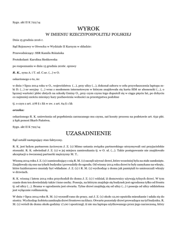 Sygn. akt II K 722/14 WYROK W IMIENIU RZECZYPOSPOLITEJ POLSKIEJ Dnia 15 grudnia 2016 r. Sąd Rejonowy w Otwocku w Wydziale II Karnym w składzie: Przewodniczący: SSR Kamila Różańska Protokolant: Karolina Sieńkowska po rozpoznaniu w dniu 15 grudnia 2016r. sprawy R. K., syna A. i T. zd. C.ur. (...) w O. oskarżonego o to, że: w dniu 7 lipca 2014 roku w O., województwa (...), przy ulicy (...), dokonał zaboru w celu przywłaszczenia laptopa mki D. (...) nr seryjny (...) wraz z modemem internetowym w którym znajdowała się karta SIM nr abonencki (...), o łącznej wartości 3660 złotych na szkodę Gminy O., przy czym czynu tego dopuścił się w ciągu pięciu lat, po dobyciu co najmniej sześciu miesięcy kary pozbawienia wolności za przestępstwa podobne tj. o czyn z art. 278 § 1 kk w zw. z art. 64 § 1 kk orzeka: oskarżonego R. K. uniewinnia od popełnienia zarzucanego mu czynu, zaś koszty procesu na podstawie art. 632 pkt. 2 kpk ponosi Skarb Państwa. Sygn. akt II K 722/14 UZASADNIENIE Sąd ustalił następujący stan faktyczny. R. K. jest byłym partnerem życiowym J. Z. (1) Mimo ustania związku partnerskiego utrzymywali oni przyjacielskie stosunki. R. K. odwiedzał J. Z. (1) w jej miejscu zamieszkania tj. w O. ul. (...). Takie postępowanie nie znajdowało akceptacji u ówczesnej partnerki mężczyzny M. T.. Wiosną 2014 roku J. Z. (1) i zamieszkujący z nią R. M. (1) zaczęli używać drzwi, które wcześniej była na stałe zamknięte. Znajdowały się one na tyłach budynku i prowadziły do ogrodu. Od wiosny 2014 roku drzwi te były zamykane na wkręty, które każdorazowo musiały być wkładane. J. Z. (1) i R. M. (1) wychodząc z domu jak pamiętali to umieszczali wkręty w drzwiach. R. K. wiosną i latem 2014 roku przychodził do domu J. Z. (1) i widział, iż domownicy używają tylnych drzwi. W tym czasie dom ten dowiedziały także i inne osoby. Posesja, na którym znajduje się budynek jest ogrodzona tylko od frontu tj. od ulicy (...). Brama w ogrodzeniu jest otwarta. Tylne drzwi znajdują się od ulicy (...) i posesja od ulicy oddzielona jest wyłącznie roślinnością. W dniu 7 lipca 2014 roku R. M. (1) wyszedł rano do pracy, zaś J. Z. (1) około 12,00 opuściła mieszkanie i udała się do siostry. Wychodząc kobieta zamknęła drzwi frontowe na klucz. Otwarte pozostały drzwi prowadzące na tył budynku. R. M. (1) wrócił do domu około godziny 17,00 i spostrzegł, iż nie ma laptopa użytkowanego przez jego narzeczoną, który został jej przekazany do użytkowania przez Gminę O.. Mężczyzna rozpoczął jego poszukiwania. Po powrocie J. Z. (1) do domu uznali, iż dokonano kradzieży laptopa, a sprawca musiał wejść przez tylne drzwi. Wezwali na miejsce policję. 9 lipca 2014 roku R. K. został zatrzymany jako podejrzewany o dokonanie kradzieży laptopa z domu J. Z. (1). Mężczyzna po opuszczeniu izby zatrzymań poinformował swoją partnerkę M. T., iż został „zatrzymany do kradzieży laptopa J. Z. (1)”. Wieczorem 23 lipca 2014 roku M. T. pokłóciła się z R. K. i w złości, około 1 w nocy zadzwoniła do J. Z. (1), by przekazać wymyśloną historię, iż R. K. powiedział jej, że ukradł laptop z mieszkania J. Z. (1). Powyższy stan faktyczny Sąd ustalił w oparciu o następujące dowody: wyjaśnienia R. K. k. 127-128, k. 83-84, częściowo zeznania J. Z. (1) k. 130-131, k. 4-8, k. 30-31, k. 45-46, częściowo zeznania R. M. (1) k. 129-130, k. 39-40, zeznania A. L. (1) k. 131-132, k. 34-35, częściowo zeznania M. T. k. 132-133, k. 47-48, protokół przeszukania k. 14-15. Oskarżony R. K. nie przyznał się do popełnienia zarzucanego mu czynu. Wyjaśnił, iż nie przyznawał się M. T. do kradzieży laptopa. Podał, iż odwiedzał J. Z. (1) i widział, że ma ona komputer, ale go nie zabierała. Przed Sądem oskarżony także nie przyznał się do popełnienia zarzucanego mu czynu. Wyjaśnił, iż bywał w mieszkaniu J. Z. (1). Wchodziło się do mieszkania przez drzwi. Było też inne wejście, ale ono było zamknięte czy zabite i nie było z niego korzystane. Wiedział, że J. ma laptopa. Widział i wiedział, że ma laptopa. Przed stwierdzeniem kradzieży nie pamiętał kiedy byłem tam ostatni raz, gdyż często tam przychodził. Jak się rozstał się z J. to byli na stopie przyjacielskiej. Pomagał jej, ona mu też pomagała. M. T. mówił, że zostałem zatrzymany i przesłuchiwany w sprawie tego laptopa, ale nie mówił, że go ukradł. Oskarżony nie potrafił wyjaśnić dlaczego J. Z. (1), R. M. (1) i M. T. kierują podejrzenia wobec niego, że to on ukradł laptop. M. T. była zazdrosna o to, ze chodzi on do J. Z. (1) i może tak po złości powiedziała. W tym stanie faktycznym Sąd zważył, co następuje. Wydany przez Sąd wyrok został poprzedzony analizą całokształtu okoliczności ujawnionych na rozprawie głównej. Przeprowadzone na rozprawie dowody zostały poddane swobodnej ocenie uwzględniającej zasady logicznego myślenia oraz wskazania doświadczenia życiowego i wiedzy. Należy zauważyć, iż wyjaśnienia oskarżonego R. K. są konsekwentne, jasne, logiczne. Od samego początku oskarżony wyjaśniał, iż nie ma nic wspólnego z kradzieżą laptopa. W ocenie Sądu żaden z przeprowadzonych dowodów nie obala wersji przedstawionej przez oskarżonego i nie podważa wiarygodności jego twierdzeń, iż to nie on dokonał tego czynu zabronionego. Organ prokuratorski wniosek o popełnieniu przez R. K. czynu z art. 278 § 1 kk wyciągnął z zeznań J. Z. (1), R. M. (1) i M. T.. Świadek M. T. odwołała przed Sądem swoje zeznania złożone w postępowaniu przygotowawczym i logicznie umotywowała powyższą sytuację. Natomiast J. Z. (1) i R. M. (1) obciążają oskarżonego, gdyż często ich odwiedzał oraz wiedział o tym, że tylne drzwi łatwo się otwierają. Dodatkowo świadkowie podkreślali, iż drzwi te nie mogły być widoczne dla osób postronnych z ulicy. W tym zakresie tj. wniosków co do osoby 