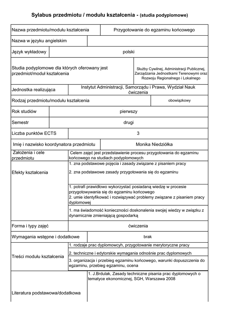 Sylabus przedmiotu / modułu kształcenia - (studia podyplomowe) Nazwa przedmiotu/modułu kształcenia Przygotowanie do egzaminu końcowego Nazwa w języku angielskim Język wykładowy polski Studia podyplomowe dla których oferowany jest przedmiot/moduł kształcenia Służby Cywilnej, Administracji Publicznej, Zarządzania Jednostkami Terenowymi oraz Rozwoju Regionalnego i Lokalnego Instytut Administracji, Samorządu i Prawa, Wydział Nauk ćwiczenia Jednostka realizująca Rodzaj przedmiotu/modułu kształcenia Rok studiów obowiązkowy pierwszy Semestr drugi Liczba punktów ECTS 3 Imię i nazwisko koordynatora przedmiotu Monika Niedziółka Założenia i cele przedmiotu Celem zajęć jest przedstawienie procesu przygotowania do egzaminu końcowego na studiach podyplomowych 1. zna podstawowe pojęcia i zasady związane z pisaniem pracy Efekty kształcenia 2. zna podstawowe zasady przygotowania się do egzaminu 1. potrafi prawidłowo wykorzystać posiadaną wiedzę w procesie przygotowywania się do egzaminu końcowego 2. umie identyfikować i rozwiązywać problemy związane z pisaniem pracy dyplomowej 1. ma świadomość konieczności doskonalenia swojej wiedzy w związku z dynamicznie zmieniającą gospodarką Forma i typy zajęć ćwiczenia Wymagania wstępne i dodatkowe brak 1. rodzaje prac dyplomowcyh, przygotowanie merytoryczne pracy Treści modułu kształcenia 2. techniczne i edytorskie wymagania odnośnie prac dyplomowych 3. organizacja i przebieg egzaminu końcowego, warunki dopuszczenia do egzaminu, przebieg egzaminu, ocena 1. J.Brdulak, Zasady techniczne pisania prac dyplomowych o tematyce ekonomicznej, SGH, Warszawa 2008 Literatura podstawowa/dodatkowa Planowane formy/działania/metody dydaktyczne wykład uzupełniany case study Sposoby weryfikacji określonych efektów kształcenia osiaganych przez studenta Forma i sposób zaliczenia (wraz z kryteriami oceniania) Bilans punktów ECTS Weryfikacja efektów kształcenia w zakresie umiejętności następuje na egzaminie końcowym. warunkiem otrzymania zaliczenia przedmiotu jest napisanie pracy końcowej