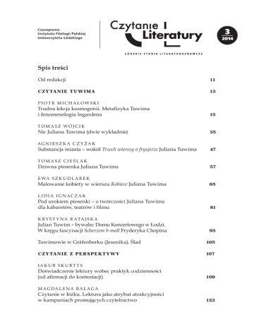 Czasopismo Instytutu Filologii Polskiej Uniwersytetu Łódzkiego Spis treści Od redakcji 11 c z y ta n i e t u w i m a 13 Piot r M ic h ałowsk i Trudna lekcja kosmogonii. Metafizyka Tuwima i fenomenologia Ingardena 15 Tom a sz Wójc i k Nic Juliana Tuwima (dwie wykładnie) 35 Ag n i e sz k a C z y ż a k Substancja miasta – wokół Trzech wierszy o fryzjerze Juliana Tuwima 47 Tom asz Cieśla k Dziwna piosenka Juliana Tuwima 57 E wa S z k u d l a r e k Malowanie kobiety w wierszu Kobiece Juliana Tuwima 65 L i di a Ig nac z a k Pod urokiem piosenki – o twórczości Juliana Tuwima dla kabaretów, teatrów i filmu 81 K ryst y na R atajsk a Julian Tuwim – bywalec Domu Koncertowego w Łodzi. W kręgu fascynacji Scherzem b-moll Fryderyka Chopina 95 Tuwimowie w Gräfenberku (Jeseniku). Ślad 105 c z y ta n i e z p e r sp e k t y w y 107 Ja k u b Sk u rt ys Doświadczenie lektury wobec praktyk codzienności (od afirmacji do kontestacji) 109 M ag da le na Ba ł ag a Czytanie w łóżku. Lektura jako atrybut atrakcyjności w kampaniach promujących czytelnictwo 123 M a łgor z ata Ja n kowsk a Literatura a pamięć kulturowa. Obrazoburcze rewitalizacje mitów 133 M a łgor z ata W i elgosz „Smutek rzeczy” czy melancholijny uśmiech. O odczytywaniu nastrojów i walorów estetycznych w dalekowschodnich utworach poetyckich oraz ich współczesnych imitacjach 153 I z a be ll a A da mc z e ws k a Wariacje na temat pewnego paktu. O dziennikarstwie gonzo 187 M a łgor z ata Bort l ic z e k O morfologii tekstów popularnonaukowych dla dzieci 205 c z y ta n i e t r a dyc j i 225 Tom a sz K ac z m a r e k Mężczyzna i jego upiory Henri-René Lenormanda, przykład dramatu stacyjnego 227 Piotr Sobolczy k Homogotycki skandal według Michała Choromańskiego 239 M ag da le na Ja r no tows k a Cieleśnie. O Stefanie Napierskim 263 List Stefana Napierskiego do Wandy i Seweryna Pollaków 289 A n na T ry k sz a Ogród wierszowej tradycji. Kilka uwag o Zachodzie słońca w Milanówku Jarosława Marka Rymkiewicza 293 c z y ta n i e (oko ł o)ł ód z k i e 307 A da m H e m e r Twarz lodzermenscha, czyli wizerunek człowieka łódzkiego w Ziemi obiecanej Władysława Stanisława Reymonta 309 K ata r z y na Ba d owsk a Mapowanie Łodzi 329 Ag n i e sz k a K a łowsk a Łódzkie dialogi o „Czytaniu…” i czytaniu 359 O Interdyscyplinarnym Centrum Badań Humanistycznych 363 Z Kościuszki na Pomorską 367 r o z mow y ( n i e t y l ko) o c z y ta n i u 369 Literatura prywatna. Z Tarasem Prochaśką rozmawia prof. Krystyna Pietrych 371 „Mój łódzki okres – to była moja młodość!”. Z Profesor Heleną Karwacką rozmawiają Krystyna Pietrych i Jacek Brzozowski t łu m ac z e n i a 381 397 Ricardo Piglia Pisarz jako czytelnik 399 E wa K o b y ł e c k a - P i w o ń s k a Największy pisarz argentyński 405 Wiersze Juliana Tuwima w tłumaczeniach 407 r e c e n z j e 413 M a r i a W i c h o wa Recepcja dzieł Justusa Lipsjusza w piśmiennictwie polskim epok dawnych 415 M a łgor z ata M edec k a Odzyskiwanie Conrada 421 K r z ysz tof T ry buś Leśmian romantyczny 429 M a ł g o r z a t a G a j a k -T o c z e k Utrwalić ślad 435 A n na Z ator a Dokąd zmierza literatura 445 ja k na s c z y ta ją z a g r a n icą 449 M a r z e na K a rwowsk a La Morale de Madame Dulska – o francuskojęzycznej edycji dramatu Gabrieli Zapolskiej 451 A n n e -M a r i e Mon luçon Kilka uwag na temat aktualnej recepcji literatury polskiej we Francji 455 Pa u l i n a S z u l i m Między »Trans« a »Atlantykiem«. O trudnościach włoskiego i angielskiego przekładu Trans-Atlantyku 473 Alfred Gall Czytanie literatury polskiej w Niemczech – osobisty pogląd polonisty 483 ja k na s c z y ta ją z a g r a n icą (a n k i e ta) 491 J u l i a Bu ł ac hows k a I r e na P obi da sz I r e na Sz e wc z e n ko 493 495 497 c z y m j e st d z i ś c z y ta n i e l i t e r at u ry (a n k i e ta) 499 Jac e k De h n e l J a ro s ł aw K l e j n o c k i Tom a sz Róż yc k i P iot r Sz e wc 501 503 505 507 no t y o k si ą ż k ac h 509 no t y o au t or ac h 523