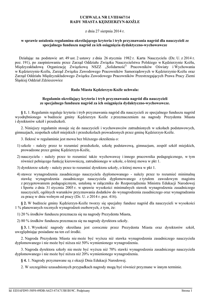 UCHWAŁA NR LVIII/667/14 RADY MIASTA KĘDZIERZYN-KOŹLE z dnia 27 sierpnia 2014 r. w sprawie ustalenia regulaminu określającego kryteria i tryb przyznawania nagród dla nauczycieli ze specjalnego funduszu nagród za ich osiągnięcia dydaktyczno-wychowawcze Działając na podstawie art. 49 ust. 2 ustawy z dnia 26 stycznia 1982 r. Karta Nauczyciela (Dz. U. z 2014 r. poz. 191), po zaopiniowaniu przez Zarząd Oddziału Związku Nauczycielstwa Polskiego w Kędzierzynie Koźlu, Międzyzakładową Organizację Związkową NSZZ „Solidarność” Pracowników Oświaty i Wychowania w Kędzierzynie-Koźlu, Zarząd Związku Zawodowego Pracowników Samorządowych w Kędzierzynie-Koźlu oraz Zarząd Oddziału Międzyzakładowego Związku Zawodowego Pracowników Przestrzegających Prawa Pracy Ziemi Śląskiej Oddział Zdzieszowice Rada Miasta Kędzierzyn-Koźle uchwala: Regulamin określający kryteria i tryb przyznawania nagród dla nauczycieli ze specjalnego funduszu nagród za ich osiągnięcia dydaktyczno-wychowawcze. § 1. 1. Regulamin reguluje kryteria i tryb przyznawania nagród dla nauczycieli ze specjalnego funduszu nagród wyodrębnionego w budżecie gminy Kędzierzyn Koźle z przeznaczeniem na nagrody Prezydenta Miasta i dyrektorów szkół i przedszkoli. 2. Niniejszy regulamin stosuje się do nauczycieli i wychowawców zatrudnionych w szkołach podstawowych, gimnazjach, zespołach szkół miejskich i przedszkolach prowadzonych przez gminę Kędzierzyn-Koźle. 3. Ilekroć w regulaminie jest mowa bez bliższego określenia o: 1) szkole - należy przez to rozumieć przedszkole, szkołę podstawową, gimnazjum, zespół szkół miejskich, prowadzone przez gminę Kędzierzyn-Koźle, 2) nauczycielu - należy przez to rozumieć także wychowawcę i innego pracownika pedagogicznego, w tym również pełniącego funkcję kierowniczą, zatrudnionego w szkole, o której mowa w pkt 1. 3) dyrektorze szkoły - należy przez to rozumieć dyrektora szkoły, o której mowa w pkt 1. 4) stawce wynagrodzenia zasadniczego nauczyciela dyplomowanego - należy przez to rozumieć minimalną stawkę wynagrodzenia zasadniczego nauczyciela dyplomowanego z tytułem zawodowym magistra z przygotowaniem pedagogicznym, ustaloną w załączniku do Rozporządzenia Ministra Edukacji Narodowej i Sportu z dnia 31 stycznia 2005 r. w sprawie wysokości minimalnych stawek wynagrodzenia zasadniczego nauczycieli, ogólnych warunków przyznawania dodatków do wynagrodzenia zasadniczego oraz wynagradzania za pracę w dniu wolnym od pracy (Dz. U. z 2014 r. poz. 416). § 2. W budżecie gminy Kędzierzyn-Koźle tworzy się specjalny fundusz nagród dla nauczycieli w wysokości 1 % planowanych rocznych wynagrodzeń osobowych, z tym, że: 1) 20 % środków funduszu przeznacza się na nagrody Prezydenta Miasta, 2) 80 % środków funduszu przeznacza się na nagrody dyrektora szkoły. § 3. 1. Wysokość nagrody określana jest corocznie przez Prezydenta Miasta oraz dyrektorów szkół, uwzględniając posiadane na ten cel środki. 2. Nagroda Prezydenta Miasta nie może być wyższa niż stawka wynagrodzenia zasadniczego nauczyciela dyplomowanego i nie może być niższa niż 50% wymienionego wynagrodzenia. 3. Nagroda dyrektora szkoły nie może być wyższa niż 70% stawki wynagrodzenia zasadniczego nauczyciela dyplomowanego i nie może być niższa niż 20% wymienionego wynagrodzenia. § 4. 1. Nagrody przyznawane są z okazji Dnia Edukacji Narodowej. 2. W szczególnie uzasadnionych przypadkach nagrody mogą być również przyznane w innym terminie. Id: ED3AFD95-58F0-49DB-A623-47A713B1B19C. Podpisany Strona 1 3. Nagroda może być przyznana nauczycielowi po przepracowaniu w szkole co najmniej 1 roku. § 5. Nauczyciel może otrzymać nagrodę Dyrektora za wymierne efekty pracy dydaktyczno-wychowawczej, opiekuńczo-wychowawczej, a w szczególności za: a) osiąganie dobrych wyników w nauczaniu wykazane w sprawdzianach i egzaminach uczniów, przeprowadzanych przez Okręgową Komisję Egzaminacyjną, b) podejmowanie działalności innowacyjnej w zakresie wdrażania nowatorskich metod nauczania i wychowania, opracowywania autorskich programów i publikacji, c) osiąganie bardzo dobrych wyników w nauczaniu, potwierdzone zakwalifikowaniem uczniów do udziału w finale wojewódzkim zawodów przedmiotowych, zajęciem przez uczniów (zespół uczniów) I-III miejsca w konkursach, zawodach, przeglądach i festiwalach wojewódzkich i ogólnopolskich, d) osiąganie bardzo dobrych wyników szkolenia sportowego, potwierdzone zajęciem przez uczniów (zespół uczniów) I-III miejsca w zawodach wojewódzkich oraz I-X miejsca w makroregionie i kraju, e) posiadanie udokumentowanych osiągnięć w pracy z uczniami uzdolnionymi lub z uczniami mającymi trudności w nauce, f) przygotowywanie i wzorowe organizowanie uroczystości szkolnych lub środowiskowych, imprez kulturalnych, sportowych, rekreacyjnych, g) prowadzenie znaczącej działalności wychowawczej w klasie, szkole lub placówce przez organizowanie wycieczek, udział uczniów w spektaklach teatralnych, koncertach, wystawach i spotkaniach, h) sprawowanie opieki nad organizacjami społecznymi, wzorowo działającymi w szkole, i) dzielenie się swoją wiedzą i doświadczeniami z pracy dydaktyczno- wychowawczej z innymi nauczycielami m. in. poprzez przeprowadzanie szkoleń rady pedagogicznej lub zespołów przedmiotowych, publikowanie swoich osiągnięć w prasie, j) zapewnianie pomocy i opieki uczniom lub wychowankom będącym w trudnej sytuacji materialnej lub życiowej, pochodzącym z rodzin ubogich lub patologicznych, k) prowadzenie działalności mającej na celu zapobieganie i zwalczanie przejawów patologii społecznej wśród dzieci i młodzieży, w szczególności narkomanii i alkoholizmu. § 6. 1. Nagrodę Prezydenta Miasta może otrzymać nauczyciel, który: 1) posiada osiągnięcia wymienione w § 5, jeśli jego dorobek jest upowszechniany co najmniej na terenie miasta, 2) przyczynia 