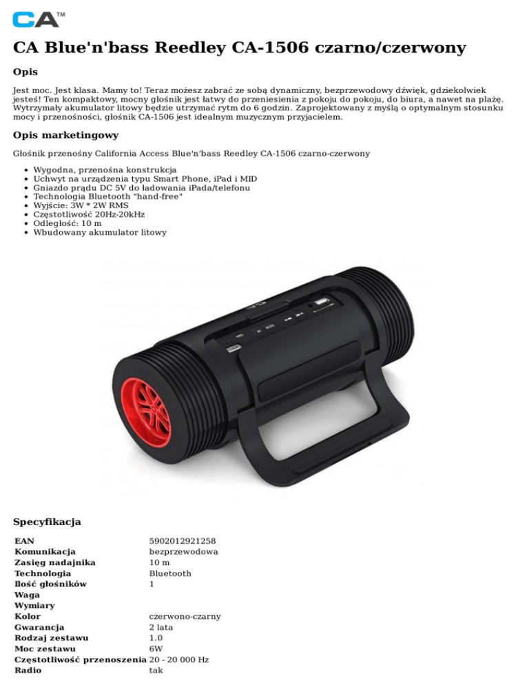 CABlue'n'bassReedleyCA-1506czarno/czerwony Opis Jestmoc.Jestklasa.Mamyto!Terazmożeszzabraćzesobądynamiczny,bezprzewodowydźwięk,gdziekolwiek jesteś!Tenkompaktowy,mocnygłośnikjestłatwydoprzeniesieniazpokojudopokoju,dobiura,anawetnaplażę. Wytrzymałyakumulatorlitowybędzieutrzymaćrytmdo6godzin.Zaprojektowanyzmyśląooptymalnymstosunku mocyiprzenośności,głośnikCA-1506jestidealnymmuzycznymprzyjacielem. Opismarketingowy GłośnikprzenośnyCaliforniaAccessBlue'n'bassReedleyCA-1506czarno-czerwony Wygodna,przenośnakonstrukcja UchwytnaurządzeniatypuSmartPhone,iPadiMID GniazdoprąduDC5VdoładowaniaiPada/telefonu TechnologiaBluetooth"hand-free" Wyjście:3W*2WRMS Częstotliwość20Hz-20kHz Odległość:10m Wbudowanyakumulatorlitowy Specyfikacja EAN 5902012921258 Komunikacja bezprzewodowa Zasięgnadajnika 10m Technologia Bluetooth Ilośćgłośników 1 Waga Wymiary Kolor czerwono-czarny Gwarancja 2lata Rodzajzestawu 1.0 Moczestawu 6W Częstotliwośćprzenoszenia 20-20000Hz Radio tak Akumulator ObsługakartSD Dodatkoweakcesoria e-mail:[email protected] tak tak kabelstereoiUSB ©2015-2017CaliforniaAccessWszystkieprawazastrzeżone