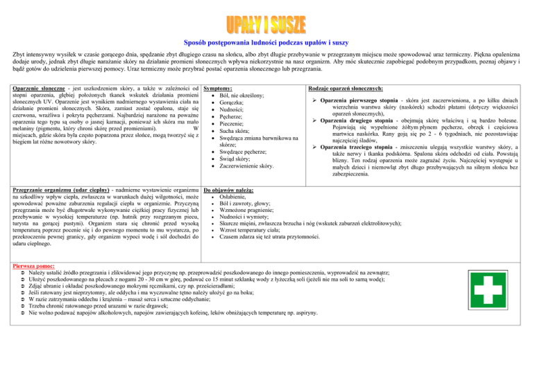 Sposób postępowania ludności podczas upałów i suszy Zbyt intensywny wysiłek w czasie gorącego dnia, spędzanie zbyt długiego czasu na słońcu, albo zbyt długie przebywanie w przegrzanym miejscu może spowodować uraz termiczny. Piękna opalenizna dodaje urody, jednak zbyt długie narażanie skóry na działanie promieni słonecznych wpływa niekorzystnie na nasz organizm. Aby móc skutecznie zapobiegać podobnym przypadkom, poznaj objawy i bądź gotów do udzielenia pierwszej pomocy. Uraz termiczny może przybrać postać oparzenia słonecznego lub przegrzania. Oparzenie słoneczne - jest uszkodzeniem skóry, a także w zależności od Symptomy: stopni oparzenia, głębiej położonych tkanek wskutek działania promieni Ból, nie określony; słonecznych UV. Oparzenie jest wynikiem nadmiernego wystawienia ciała na Gorączka; działanie promieni słonecznych. Skóra, zamiast zostać opalona, staje się Nudności; czerwona, wrażliwa i pokryta pęcherzami. Najbardziej narażone na poważne Pęcherze; oparzenia tego typu są osoby o jasnej karnacji, ponieważ ich skóra ma mało Pieczenie; melaniny (pigmentu, który chroni skórę przed promieniami). W Sucha skóra; miejscach, gdzie skóra była często poparzona przez słońce, mogą tworzyć się z Swędząca zmiana barwnikowa na biegiem lat różne nowotwory skóry. skórze; Swędzące pęcherze; Świąd skóry; Zaczerwienienie skóry. Rodzaje oparzeń słonecznych: Oparzenia pierwszego stopnia - skóra jest zaczerwieniona, a po kilku dniach wierzchnia warstwa skóry (naskórek) schodzi płatami (dotyczy większości oparzeń słonecznych), Oparzenia drugiego stopnia - obejmują skórę właściwą i są bardzo bolesne. Pojawiają się wypełnione żółtym płynem pęcherze, obrzęk i częściowa martwica naskórka. Rany goją się po 2 - 6 tygodniach, nie pozostawiając najczęściej śladów, Oparzenia trzeciego stopnia - zniszczeniu ulegają wszystkie warstwy skóry, a także nerwy i tkanka podskórna. Spalona skóra odchodzi od ciała. Powstają blizny. Ten rodzaj oparzenia może zagrażać życiu. Najczęściej występuje u małych dzieci i niemowląt zbyt długo przebywających na silnym słońcu bez zabezpieczenia. Przegrzanie organizmu (udar cieplny) - nadmierne wystawienie organizmu Do objawów należą: na szkodliwy wpływ ciepła, zwłaszcza w warunkach dużej wilgotności, może Osłabienie, spowodować poważne zaburzenia regulacji ciepła w organizmie. Przyczyną Ból i zawroty, głowy; przegrzania może być długotrwałe wykonywanie ciężkiej pracy fizycznej lub Wzmożone pragnienie; przebywanie w wysokiej temperaturze (np. hutnik przy rozgrzanym piecu, Nudności i wymioty; turysta na gorącej pustyni). Organizm stara się chronić przed wysoką Skurcze mięśni, zwłaszcza brzucha i nóg (wskutek zaburzeń elektrolitowych); temperaturą poprzez pocenie się i do pewnego momentu to mu wystarcza, po Wzrost temperatury ciała; przekroczeniu pewnej granicy, gdy organizm wypoci wodę i sól dochodzi do Czasem zdarza się też utrata przytomności. udaru cieplnego. Pierwsza pomoc: Należy ustalić źródło przegrzania i zlikwidować jego przyczynę np. przeprowadzić poszkodowanego do innego pomieszczenia, wyprowadzić na zewnątrz; Ułożyć poszkodowanego na plecach z nogami 20 - 30 cm w górę, podawać co 15 minut szklankę wody z łyżeczką soli (jeżeli nie ma soli to samą wodę); Zdjąć ubranie i okładać poszkodowanego mokrymi ręcznikami, czy np. prześcieradłami; Jeśli ratowany jest nieprzytomny, ale oddycha i ma wyczuwalne tętno należy ułożyć go na boku; W razie zatrzymania oddechu i krążenia – masaż serca i sztuczne oddychanie; Trzeba chronić ratowanego przed urazami w razie drgawek; Nie wolno podawać napojów alkoholowych, napojów zawierających kofeinę, leków obniżających temperaturę np. aspiryny. Zachowanie się w przypadku upałów: Utrzymuj chłodne powietrze wewnątrz pomieszczeń, stosując żaluzje w drzwiach i oknach. Sprawdź przewody urządzeń klimatyzacyjnych, czy są właściwie izolowane i szczelne. Oszczędzaj elektryczność. W okresie dużych upałów ludzie mają skłonności do znacznie większego zużycia energii elektrycznej na potrzeby urządzeń klimatyzacyjnych, co prowadzi do niedoboru mocy lub przerw w dopływie prądu. Przebywaj wewnątrz pomieszczeń tak długo, jak to możliwe. Jeśli jest brak klimatyzacji, przebywaj na najniższym poziomie budynku, poza zasięgiem światła słonecznego. Spożywaj zbilansowane, lekkie posiłki. Regularnie pij duże ilości wody mineralnej. Osoby cierpiące na epilepsję oraz schorzenia serca, nerek lub wątroby, będące na niskowodnej diecie oraz mające problemy z utrzymaniem płynów, powinny skontaktować się z lekarzem przed zwiększonym przyjmowaniem płynów. Ogranicz przyjmowanie napojów alkoholowych. Mimo że piwo i napoje alkoholowe zdają się zaspakajać pragnienie, to zazwyczaj powodują dalsze odwodnienie organizmu. Ubieraj się w luźno dopasowane rzeczy, zakrywające możliwie największą powierzchnię skóry. Lekka, o jasnych kolorach odzież odbija ciepło i promieniowanie słońca oraz pomaga utrzymać normalną temperaturę ciała. Noś okrycia głowy, które skutecznie będą chronić twarz i głowę przed nadmiernym nagrzaniem. Unikaj zbytniego nasłonecznienia. Opalenizna spowalnia zdolność do samoczynnego chłodzenia się. Użyj środków ochrony przed promieniami słonecznymi o wysokim współczynniku skuteczności. Unikaj skrajnych zmian temperatury. Zwolnij tryb życia. Osoby z grupy wysokiego ryzyka powinny przebywać w chłodnych miejscach. Stosuj tabletki solne, ale tylko wtedy, jeśli zostały zalecone przez lekarza. Pamiętaj, że podczas upałów występuje zwiększone zagrożenie przeciwpożarowe - przebywając w lesie, na podsuszonych łąkach, ścierniskach, zachowaj szczególną ostrożność i staraj się nie zaprószyć ognia. Zachowanie się w przypadku suszy: Zmniejs