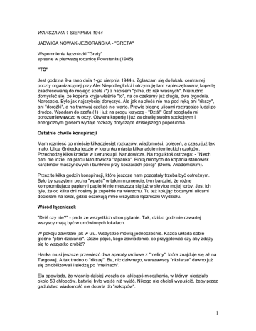 WARSZAWA 1 SIERPNIA 1944 JADWIGA NOWAK-JEZIORAŃSKA - "GRETA" Wspomnienia łączniczki "Grety" spisane w pierwszą rocznicę Powstania (1945) "TO" Jest godzina 9-a rano dnia 1-go sierpnia 1944 r. Zgłaszam się do lokalu centralnej poczty organizacyjnej przy Alei Niepodległości i otrzymuję tam zapieczętowaną kopertę zaadresowaną do mojego szefa (*) z napisem "pilne, do rąk własnych". Nietrudno domyśleć się, że koperta kryje właśnie "to", na co czekamy już długie, dwa tygodnie. Nareszcie. Byle jak najszybciej doręczyć. Ale jak na złość nie ma pod ręką ani "rikszy", ani "dorożki", a na tramwaj czekać nie warto. Prawie biegnę ulicami roztrącając ludzi po drodze. Wpadam do szefa (1) i już na progu krzyczę - "Dziś!" Szef spogląda mi porozumiewawczo w oczy. Otwiera kopertę i już za chwilę swoim spokojnym i energicznym głosem wydaje rozkazy dotyczące dzisiejszego popołudnia. Ostatnie chwile konspiracji Mam roznieść po mieście kilkadziesiąt rozkazów, wiadomości, poleceń, a czasu już tak mało. Ulicą Grójecką jedzie w kierunku miasta kilkanaście niemieckich czołgów. Przechodzę kilka kroków w kierunku pl. Narutowicza. Na rogu ktoś ostrzega: - "Niech pani nie idzie, na placu Narutowicza "łapanka". Biorą młodych do kopania stanowisk karabinów maszynowych i bunkrów przy koszarach policji" (Domu Akademickim). Przez te kilka godzin konspiracji, które jeszcze nam pozostały trzeba być ostrożnym. Było by szczytem pecha "wpaść" w takim momencie, tym bardziej, że różne kompromitujące papiery i papierki nie mieszczą się już w skrytce mojej torby. Jest ich tyle, że od kilku dni nosimy je zupełnie na wierzchu. Tu też kołując bocznymi ulicami docieram na lokal, gdzie oczekują mnie wszystkie łączniczki Wydziału. Wśród łączniczek "Dziś czy nie?" - pada ze wszystkich stron pytanie. Tak, dziś o godzinie czwartej wszyscy mają być w umówionych lokalach. W pokoju zawrzało jak w ulu. Wszystkie mówią jednocześnie. Każda układa sobie głośno "plan działania". Gdzie pójść, kogo zawiadomić, co przygotować czy aby zdąży się to wszystko zrobić? Hanka musi jeszcze przewieźć dwa aparaty radiowe z "meliny", która znajduje się aż na Targowej. A tak trudno o "rikszę". Ba, nic dziwnego, warszawscy "riksiarze" dawno już się zmobilizowali i siedzą po "melinach". Ela opowiada, że właśnie dzisiaj weszła do jakiegoś mieszkania, w którym siedziało około 50 chłopców. Łatwiej było wejść niż wyjść. Nikogo nie chcieli wypuścić, żeby przez gadulstwo wiadomość nie dotarła do "szkopów". 1 "Musiałam się długo tłumaczyć - mówi Ela - podałam im prawie cały swój życiorys. Ale dopiero jak im pokazałam ostatni numer "Biuletynu Informacyjnego" dali się przekonać. Mówię wam, wspaniali chłopcy. Jedni czyścili broń, inni rachowali amunicję, sanitariuszki pakowały swoje torby. Nastrój był wspaniały. Nic jeszcze nie wiedzieli, że to już dziś". Anna martwi się, że już nie zdąży do domu, na Żolibórz. A ma na sobie tylko te pantofelki, które za chwilę się rozlecą w drobny maczek i tę letnią sukienczynę. Ale "to" i tak nie potrwa dłużej niż kilka dni. Nasza gospodyni, stara przyjaciółka i konspiratorka, u której już tyle spotkań odbyłyśmy żegna się z nami jak matka. Ma syna w "Kedywie". Od dwóch dni nie było go w domu. Pożegnanie Po zawiadomieniu wszystkich pędzę do domu. Deszcz, który leje od rana ustaje i zza chmur wychodzi słońce. Warszawa uśmiecha się do nas pogodnie. W domu otwieram skrytki, wyciągam z nich papiery, pieniądze organizacyjne, zabieram broń i owijam ją w chustkę. Już na progu mimo całego pośpiechu coś mnie zatrzymuje. Rzucam spojrzenie na to mieszkanie, w którym przeżyłam lata konspiracji. Uświadamiam sobie w tym momencie, że zostawiam za sobą w życiu coś, co już nie wróci. Ile ciężkich a jednak pięknych zarazem chwil przeżyłam w tych ścianach. Tu spotykali się ludzie z mojego zespołu. Tu nieraz szukali schronienia ci, którzy musieli własne mieszkanie opuszczać nagle i nieoczekiwanie. Ile momentów pełnych napięcia, gdy w nocy lub nad ranem budzi stukot ciężkich butów "szkopskich", nawoływania w znienawidzonym języku, brzęk kluczy dozorczyni. Może do nas, a tu akurat tyle rzeczy leży na wierzchu. Lecz nie. To w oficynie naprzeciwko zapalają się światła w oknach. Słychać łomot, wrzask, jęki i płacz. Później znów odgłos kroków, odjeżdżają auta i znowu cisza zalega. A nad ranem życie toczy się normalnie, tylko w najbliższym sklepiku na rogu sąsiadki podają sobie z ust do ust plotkę. My zaś wiemy tylko jedno, że tej nocy ubył jeden z naszych. To wszystko teraz zostało już za mną. Już nie wróci. Podziemna mobilizacja Idę ulicami miasta, które przeżywa w tej chwili szczególny moment podziemnej mobilizacji. (2) Mężczyźni i kobiety - żołnierze AK, którzy za parę godzin staną do walki zmieszani są jeszcze z tłumem cywilów. Lecz wprawne oko może ich już łatwo odróżnić po przyspieszonym kroku, po długich butach z cholewami, pasach, beretach, wiatrówkach, którymi już teraz starają się nadać sobie wygląd zbliżony do żołnierskiego. Znajomi nie przystają jak zwykle, nie rozmawiają ze sobą. Powietrze naładowane elektrycznością jak przed burzą. Punktualnie o godzinie 16 melduję się na ulicy Boduena. Wchodzę za umówionym hasłem. Wszyscy są już na miejscu. Pięciu chłopaków z "Kedywu" obwieszonych bronią, granatami i "filipinkami" czeka na moment wyjścia na ulicę. Są spokojni i pewni siebie to weterani. Mają już za sobą niejedną akcję uliczną, to co dziś się stanie nie będzie dla nich pierwszyzną. 2 O godzinie pół do piątej narzucają na siebie palta dla ukrycia broni, odbezpieczają "rozpylacze" i wychodzimy kolejno co dwie minuty na następny punkt zbiórki. Przechodząc przez Świętokrzyską słyszymy pojedyncze strzały