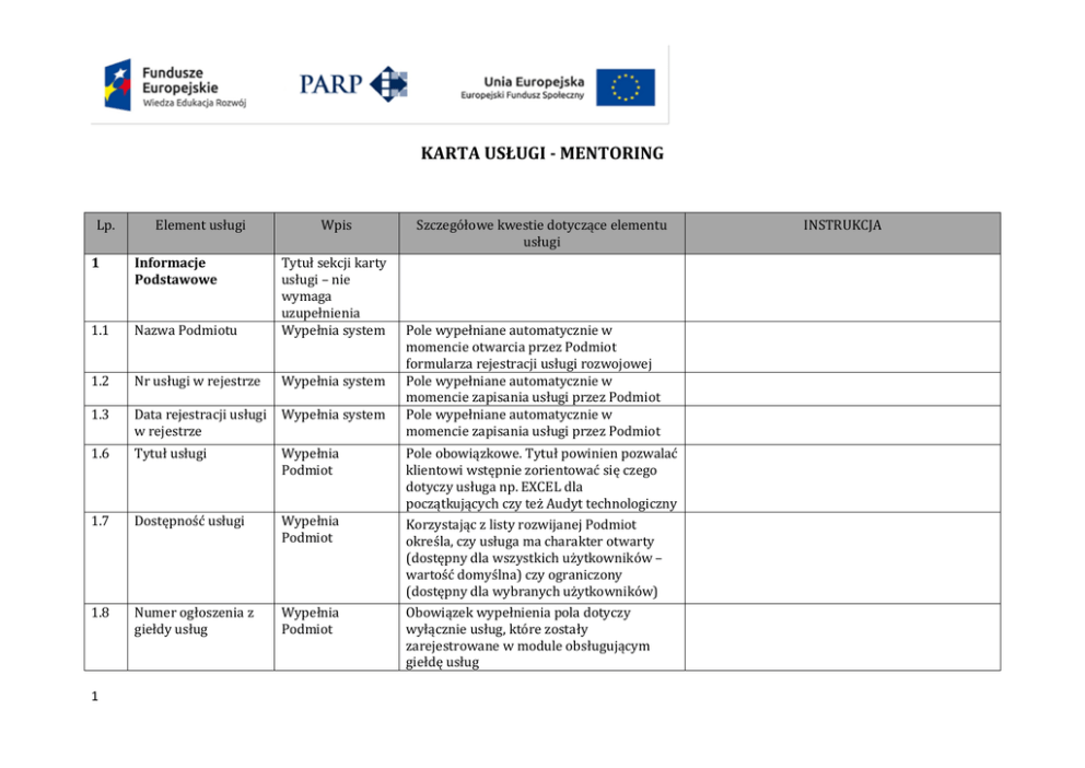 KARTA USŁUGI - MENTORING Lp. Element usługi Wpis 1 Informacje Podstawowe 1.1 Nazwa Podmiotu Tytuł sekcji karty usługi – nie wymaga uzupełnienia Wypełnia system 1.2 Nr usługi w rejestrze Wypełnia system 1.3 Data rejestracji usługi w rejestrze Wypełnia system 1.6 Tytuł usługi Wypełnia Podmiot 1.7 Dostępność usługi Wypełnia Podmiot 1.8 Numer ogłoszenia z giełdy usług Wypełnia Podmiot 1 Szczegółowe kwestie dotyczące elementu usługi Pole wypełniane automatycznie w momencie otwarcia przez Podmiot formularza rejestracji usługi rozwojowej Pole wypełniane automatycznie w momencie zapisania usługi przez Podmiot Pole wypełniane automatycznie w momencie zapisania usługi przez Podmiot Pole obowiązkowe. Tytuł powinien pozwalać klientowi wstępnie zorientować się czego dotyczy usługa np. EXCEL dla początkujących czy też Audyt technologiczny Korzystając z listy rozwijanej Podmiot określa, czy usługa ma charakter otwarty (dostępny dla wszystkich użytkowników – wartość domyślna) czy ograniczony (dostępny dla wybranych użytkowników) Obowiązek wypełnienia pola dotyczy wyłącznie usług, które zostały zarejestrowane w module obsługującym giełdę usług INSTRUKCJA 1.9 Identyfikator uczestnika usługi (REGON przedsiębiorcy lub instytucji, do której skierowana jest usługa / PESEL osób prywatnych) Rodzaj/podrodzaj świadczonej usługi rozwojowej Wypełnia Podmiot Istnieje możliwość dodania wielu numerów REGON lub PESEL, na podstawie których system dokona wyszukania przedsiębiorców w bazie i przypisania do nich karty usługi Wypełnia Podmiot wybierając rodzaj/podrodzaj usługi z listy usług określonych w Rejestrze Usług Rozwojowych Pole obowiązkowe. W przypadku usług łączonych (np. usługa szkoleniowa i elearningowa, szkolenie otwarte z egzaminem) system będzie pozwalać na wybór kilku rodzajów/podrodzajów usług. 1.11 Kategoria usługi Wypełnia Podmiot wybierając kategorię usługi z listy usług określonych w Rejestrze Usług Rozwojowych Pole obowiązkowe. W przypadku usług interdyscyplinarnych (np. z zakresu logistyki i marketingu) należy wybrać kategorię dominującą/przeważającą. 1.12 Podkategoria usługi Wypełnia Podmiot wybierając podkategorię usługi z listy Pole obowiązkowe. W przypadku, gdy usługa dotyczy kilku podkategorii (np. reklamy i public relations) należy wybrać podkategorię dominującą/przeważającą. 1.10 2 usług określonych w Rejestrze Usług Rozwojowych 2. 3 Główny cel usługi Wypełnia Podmiot Pole obowiązkowe. Podmiot określa czy usługa ma charakter: biznesowy (tj. realizacja usługi pozwala na wytworzenie produktu/ów, który/e pośrednio wpływa/ją na sytuację ekonomiczną lub rynkową Odbiorcy instytucjonalnego lub realizacja usługi może pozwolić na poprawę sytuacji ekonomicznej lub rynkowej Odbiorcy instytucjonalnego) czy edukacyjny (tj. realizacja usługi ma umożliwić nabycie/podniesienie wiedzy lub umiejętności lub kompetencji społecznych Uczestników indywidualnych lub nabycie kwalifikacji). Główny cel musi bezpośrednio wynikać z potrzeb potencjalnych uczestników usługi mentoringowej. W przypadku gdy usługa mentoringu prowadzi do realizacji celów edukacyjnych oraz biznesowych należy określić dwa rodzaje celów. Główny cel musi być prawidłowo sformułowany i opisany językiem zrozumiałym dla klienta. Odpowiednio opisany cel jest podstawowym elementem dobrego opisu każdej usługi mentoringowej. Jest to przede wszystkim wskazanie tego, czego można oczekiwać w wyniku realizacji usługi. Cele Biznesowe vs. edukacyjne W ramach Rejestru Usług Rozwojowych wyróżniono dwa typy celów: 1. Biznesowy. 2. Edukacyjny. Cele biznesowe bardziej odnoszą się do korzyści organizacyjnych (czyli Odbiorców usługi) w sferze ekonomicznej i rynkowej. Obszary te należy rozumieć dość ogólnie. Chodzi przede wszystkim o wskazanie czy cele danej usługi da się odnieść do kondycji finansowej i/lub rynkowej danej firmy. Przy wskazaniu tych celów warto jednak być bardziej specyficznym i odnosić się do konkretnych określeń typu "obniżenie kosztów rekrutacji o 10%" (cel ekonomiczny) lub zwiększenie poziomu satysfakcji klientów zewnętrznych o jeden poziom w skali 1-10 (cel rynkowy). Chodzi o to, że powinniśmy być w stanie ocenić poziom realizacji zakładanych celów. Cele edukacyjne odnosimy do zakresu wiedzy, Realizacja głównego celu będzie podlegać ocenie w rejestrze przez klientów po zakończeniu usługi. Dlatego też cel (lub cele) powinny określać precyzyjne wskaźniki pozwalające na ocenę realizacji. W przypadku: celu biznesowego należy odwołać się do zasady SMART celu edukacyjnego musi zostać opisany językiem efektów uczenia się/kształcenia w rozumieniu ZSK 1. umiejętności i kompetencji społecznych uczestników usługi (w tym przypadku mentee). Inaczej mówiąc warto w tym miejscu wskazać jakie zakresy wiedzy, umiejętności i kompetencji ulegną rozwojowy i w jakim zakresie (np. rozwój kompetencji "orientacja w biznesie o 1 poziom w skali 1-5!). Można w tym przypadku odnieść się do języka efektów uczenia się/kształcenia w rozumieniu Zintegrowanego Systemu Kwalifikacji (p. poniżej). Zasada SMART Pomocne może być wykorzystanie zasady SMART. Zgodnie z tą zasadą cel powinien być: : Specyficzny (dobrze określony i zrozumiały), Mierzalny (pozwalający na ocenę stopnia realizacji), Atrakcyjny (powiązany z korzyściami), Realistyczny (możliwy do osiągnięcia) oraz Określony w czasie (ang: Time bound - ze wskazanymi ramami czasowymi). Chodzi o to aby potencjalny odbiorca dokładnie wiedział czego może się spodziewać i jakie warunki muszą być spełnione aby te oczekiwania zostały spełnione. Warto też pamiętać, że zasada SMART znacząco ułatwia późniejszą ocenę usługi, szczególnie w takich aspektach jak wskaźniki realizacji (mierzalność) oraz czas realizacji. Wskaźniki 1 4 ZSK – Zi