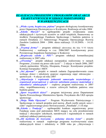 REALIZACJA PROJEKTÓW I PROGRAMÓW ORAZ AKCJI CHARYTATYWNYCH W SZKOLE PODSTAWOWEJ W WAWRZEŃCZYCACH 1. ,,Wisła czysta, bezpieczna, piękna” program ekologiczny koordynowany przez Organizację Ekoinicjatywa w Kwidzynie. Realizacja od roku 2004 2. ,,Szkoła Marzeń” to ogólnopolski projekt zwiększania szans edukacyjnych i życiowych uczniów ze szkół wiejskich, finansowany ze środków Europejskiego Funduszu Społecznego i budżetu państwa w ramach Działania 2.1 Sektorowego Programu Operacyjnego Rozwój Zasobów Ludzkich 2004 – 2006. okres realizacji: 15.10.2005r. – 14.10. 2006r. 3. ,,Trzymaj formę” – program edukacji zdrowotnej dla klas V-VI Szkoły Podstawowej – realizacja w r.sz. 2006/2007 koordynowany przez Powiatowego Inspektora Sanitarnego w Krakowie 4. ,,Bezpieczna szkoła z PZU”- program edukacji komunikacyjnej realizowany w 2007 roku 5. ,,eTwening” projekt edukacji europejskiej realizowany w ramach Programu ,,Uczenie się przez całe życie” - 2 edycje w latach 2006, 2007 /szkoły partnerskie: Włochy, Hiszpania, Francja/. Koordynator projektu: Komisja Europejska i MEN 6. ,,Już pływam” - projekt w ramach zadania Zagospodarowania czasu wolnego dzieci i młodzieży poprzez organizację zajęć rekreacyjno – sportowych – 4 edycje od roku 2007 7. ,,Aktywizacja i wspieranie jednostek samorządu terytorialnego i organizacji pozarządowej w zakresie udzielania pomocy materialnej o charakterze edukacyjnym” – rządowy program realizowany w 2007 roku, współfinansowany z rezerw celowych budżetu państwa oraz budżetu gminy 8. ,,Sport wszystkich dzieci” - program inicjowany przez Departament Sportu Powszechnego Ministerstwa Sportu. Pozyskanie dla UKS sprzętu sportowego 9. ,,Moja Mała Ojczyzna” - Program Wychowania Patriotycznego i Społecznego w ramach projektu pod nazwą ,,Ruch rzeźbi umysł, serce i ciało” organizowanego przez Stowarzyszenie ,,Parafiada”, I i II etap 10.,,Szkoła z Tradycją” – ogólnopolski konkurs organizowany przez Fundację szans pod patronatem MEN mający na celu przedstawienie tradycji i obyczajów szkolnych, narodowych i regionalnych w ramach realizacji edukacji patriotycznej 11.,,Od myślenia do tworzenia – pokażmy dziecku świat” - projekt realizowany w ramach rządowego programu wyrównywania szans edukacyjnych dzieci i młodzieży w 2008 roku pn ,,Aktywizacja i 1 wspieranie jednostek samorządu terytorialnego i organizacji pozarządowych” 12.,,Ratujmy i uczmy ratować”- projekt realizowany w ramach działań pierwszej pomocy przedlekarskiej z inicjatywy organizatorów przedsięwzięcia Wielkiej Orkiestry Świątecznej Pomocy 13.,,Kursy doskonalące dla nauczycieli w zakresie języków obcych” – projekt finansowany ze środków budżetu państwa i Europejskiego Funduszu Społecznego w ramach Sektora Programu Operacyjnego Rozwoju Zasobów Ludzkich, Działanie 2.2 Schemat c 14.,,Doskonalenie zawodowe nauczycieli w dziedzinie wykorzystania technologii informacyjnej” - projekt finansowany ze środków budżetu państwa i Europejskiego Funduszu Społecznego w ramach Programu ,,Uczenie się przez całe życie” 15.,,Pierwsze uczniowskie doświadczenia drogą do wiedzy” – projekt edukacyjny rozwijający dziecięce zdolności, współfinansowany przez Unię Europejską w ramach Europejskiego Funduszu Społecznego w ramach Programu Operacyjnego Kapitał Ludzki. Realizacja: 2010,2011 rok 16.,,DiAMEnT” - dostrzec i aktywizować możliwości, energię, talenty – projekt współfinansowany przez Unię Europejską w ramach Europejskiego Funduszu Społecznego Program Operacyjny Kapitał Ludzki Priorytet IX, Działanie 9.1. 17.,,Radosna szkoła” – pomoce dydaktyczne do miejsca zabaw w szkole – projekt realizowany w ramach Programu Rządowego 18.,,Comenius" – Partnerskie Projekty Szkół pod nazwą ,,Travel to Healthy Food Along Europe” w ramach programu ,,Uczenie się przez całe życie”, realizowany w latach 2011 – 2013. Szkoły partnerskie: Francja, Wielka Brytania, Włochy, Hiszpania. 19.,,The Fibonacci Project” - projekt edukacyjny dotyczący rozpowszechniania edukacji matematyczno – przyrodniczej finansowany przez Unię Europejską. Jego celem jest rozpowszechnianie nowoczesnych metod nauczania matematyki i elementów przyrody w klasach I – III oraz przyrody w klasach IV-VI tzw. metodologia IBSME. Realizacja w latach 2011, 2012 20.,,Szkoła Promująca Zalecenia Europejskiego Kodeksu Walki z Rakiem” - projekt edukacyjny realizowany w ramach profilaktyki onkologicznej pn ,,Upowszechnianie Zasad Europejskiego Kodeksu Walki z Rakiem” – 2011r. 21.,,Jestem Kibicem przez duże K” - ogólnopolski program edukacyjno – alternatywny koordynowany przez Biuro Prewencji Komendy Głównej Policji, realizowany w latach 2011/2015 2 22.,,Bezpieczna szkoła” – projekt realizowany w ramach edukacji komunikacyjnej, organizowany przez Wojewódzką Komendę Policji wrzesień – październik 2011r. 23.,,Szkoła ucząca racjonalnego gospodarowania energią” – projekt edukacyjny finansowany przez EFS realizowany przez Krajowe Stowarzyszenie Pomocy Szkole w roku 2011 24.,,Mogę więcej –Indywidualizacja nauczania i wychowania w szkołach, dla których organem prowadzącym jest Gmina Igołomia Wawrzeńczyce .” – projekt systemowy realizowany w ramach Programu Operacyjnego Kapitał Ludzki, finansowany przez Europejski Fundusz Społeczny wrzesień 2012 – czerwiec 2013r. 25.,,Teatr jest w nas”- projekt realizowany w ramach programu pt. ,,Bank Dziecięcych Uśmiechów” z inicjatywy Fundacji Banku Zachodniego WBK w Warszawie w celu pomocy dzieciom wyrównywania szans edukacyjnych. Projekt realizowany przez Stowarzyszenie ,,Odnowa Wsi Wawrzeńczyce” we współpracy ze szkołą 26.,,Owoc w szkole”- projekt w ramach edukacji zdrowotnej, koordynowany przez Agencję Rynku Rolnego od roku 2009 27.,,Mleko w szkole” – program w ramach edukacji zdrowotnej koordynowany przez Ag