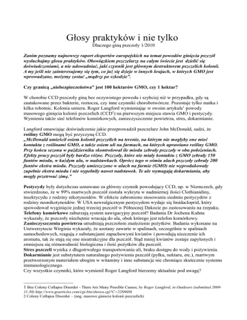 Głosy praktyków i nie tylko Dlaczego giną pszczoły 1/2010 Zanim poznamy najnowszy raport ekspertów europejskich na temat powodów ginięcia pszczół wysłuchajmy głosu praktyków. Obowiązkiem pszczelarzy na całym świecie jest dzielić się doświadczeniami, a nie udowadniać, jaki czynnik jest głównym destruktorem pszczelich kolonii. A my jeśli nie zainteresujemy się tym, co już się dzieje w innych krajach, w których GMO jest wprowadzane, możemy zostać „mądrzy po szkodzie”. Czy granicą „niebezpieczeństwa” jest 100 hektarów GMO, czy 1 hektar? W chorobie CCD pszczoły giną bez oczywistego powodu i szybciej niż w przypadku, gdy są zaatakowane przez bakterie, roztocza, czy inne czynniki chorobotwórcze. Pozostaje tylko matka i kilka robotnic. Kolonia umiera. Roger Langford wymieniając w swoim artykule1 powody masowego ginięcia kolonii pszczelich (CCD2) na pierwszym miejscu stawia GMO i pestycydy. Wymienia także sieć telefonów komórkowych, zanieczyszczenie powietrza, stres, dokarmianie. Langford omawiając doświadczenie jakie przeprowadził pszczelarz John McDonald, sadzi, że rośliny GMO mogą być przyczyną CCD. „McDonald umieścił osiem kolonii pszczelich na terenie, na którym nie mogłyby one mieć kontaktu z roślinami GMO, a także osiem uli na farmach, na których uprawiano rośliny GMO. Przy końcu sezonu w październiku skontrolował ile miodu zebrały pszczoły w obu położeniach. Efekty pracy pszczół były bardzo różne. Pszczoły, które nie miały kontaktu z GMO zebrały 150 funtów miodu, w każdym ulu, w nadstawkach. Oprócz tego w ośmiu ulach pszczoły zebrały 200 funtów ekstra miodu. Pszczoły umieszczone w ulach na farmie (GMO) nie wyprodukowały zupełnie ekstra miodu i nie wypełniły nawet nadstawek. Te ule wymagają dokarmiania, aby mogły przetrwać zimę.” Pestycydy były dotychczas uznawane za główny czynnik powodujący CCD, np. w Niemczech, gdy stwierdzono, że w 99% martwych pszczół została wykryta w nadmiernej ilości Clothianidiny, insektycydu z rodziny nikotynoidów. W efekcie zabroniono stosowania siedmiu pestycydów z rodziny neonikotynoidów. W USA newralgicznym pestycydem wydaje się Imidacloprid, który spowodował wyginięcie jednej trzeciej pszczół w Północnej Dakocie po zastosowaniu na rzepaku. Telefony komórkowe zaburzają system nawigacyjny pszczół? Badania Dr Jochena Kuhna wykazały, że pszczoły niechętnie wracają do ula, obok którego jest telefon komórkowy. Zanieczyszczenia powietrza utrudniają pszczołom znalezienie pożytków. Badania wykonane na Uniwersytecie Wirginia wykazały, że azotany zawarte w spalinach, szczególnie w spalinach samochodowych, reagują z substancjami zapachowymi kwiatów i powodują niszczenie ich aromatu, tak że stają się one nieatrakcyjne dla pszczół. Stąd mniej kwiatów zostaje zapylonych i zmniejsza się różnorodność biologiczna i ilość pożytków dla pszczół. Stres pszczeli wynika z długotrwałego transportowania uli, braku dostępu do wody i pożywienia. Dokarmianie jest substytutem naturalnego pożywienia pszczół (pyłku, nektaru, etc.), martwym przetworzonym materiałem ubogim w witaminy i inne substancje nie chroniące skutecznie systemu immunologicznego. Czy wszystkie czynniki, które wymienił Roger Langford bierzemy aktualnie pod uwagę? 1 Bee Colony Collapse Disorder - There Are Many Possible Causes; by Roger Langford, in Outdoors (submitted 200911-30) http://www.goarticles.com/cgi-bin/showa.cgi?C=2288686 2 Colony Collapse Disorder – (ang. masowe giniecie kolonii pszczelich) Jaka odległość od GMO jest konieczna dla bezpieczeństwa pszczół Aby uchronić rolnictwo ekologiczne, pasieki i ich produkty przed zanieczyszczeniem GMO na Łotewskim Uniwersytecie Rolniczym przeprowadzono badania3 w celu ustalenia czy i na ile koegzystencja jest możliwa. Ustalonym w badaniach wymogiem koegzystencji na Łotwie jest odległość od pola rzepaku GMO do upraw ekologicznego rzepaku wynosząca co najmniej 4000m. Taka odległość zdefiniowano dla warunków rozdrobnionego rolnictwa łotewskiego. Na Łotwie, nie ma aktualnie upraw GMO. W ciągu 10 lat (1998-2007) ilość gospodarstw ekologicznych wzrosła do 4120. Ewentualne wprowadzenie upraw GMO wymaga wcześniejszych badań określających jak rozprzestrzeniają się rośliny GMO. Z wcześniejszych badań wynika, że pyłek rzepaku, buraka i kukurydzy może rozprzestrzenić się na odległość od 1-4 km (Kjellson et al., 2003). szczególnie niebezpieczny jest rzepak, ponieważ może generować hybrydy z kapustą, i dziką rzodkwią, które dalej rozprzestrzeniają cechy GMO. Nasiona rzepaku mogą przetrwać od 5 do 20 lat w glebie, dlatego zmianowanie musi być pod obserwacją (monitoringiem). Ale nawet odległość 4000 m nie wystarczy by zabezpieczyć produkty pszczele przed pyłkiem rzepaku GMO. Zanieczyszczenie miodu pszczelego powoduje utratę certyfikatu i straty finansowe pszczelarza. Przyjmuje się że aktualny transfer pyłku przez pszczoły wynosi do 4 km, a potencjalnie może osiągnąć 8-10 km. Dla trzmieli ta odległość wynosi 0.25 – 3km (Turka et al., 2005a, 2005b; Vanags& Turka, 2008). Aktualnie nie można dokładne ustalić na jaką odległość dotrze pyłek rzepaku GMO przeniesiony przez pszczoły, wiatr, ptaki. Metodą mapowania można teoretycznie ustalić, że ten zasięg będzie istotnie groźny (Turka et al., 2005a, 2005b). Należy odnotować, że nie jest możliwym utrzymanie rzepaku GMO w ustalonych prawem UE granicach. Zasięg upraw GMO nie jest podawany do publicznej wiadomości,co powoduje, że planowanie monitorowania i inspekcje kontrolne są uyrudnione. Ponieważ wszystkie tereny zachodzą na siebie teoretyczne ulokowanie upraw ekologicznych i pasiek byłoby niemożliwe a ekonomiczna koegzystencja ograniczona. Pozostaje problem ograniczenia stref buforowych w obszarach przygranicznych, ze względu na brak uregulowania prawem tych kwestii w Unii