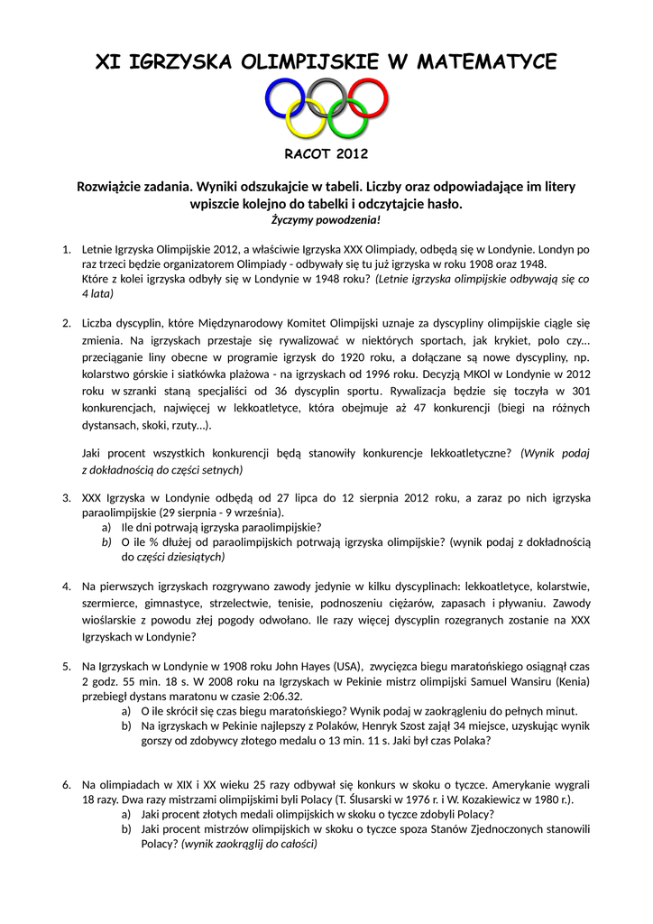 XI IGRZYSKA OLIMPIJSKIE W MATEMATYCE RACOT 2012 Rozwiążcie zadania. Wyniki odszukajcie w tabeli. Liczby oraz odpowiadające im litery wpiszcie kolejno do tabelki i odczytajcie hasło. Życzymy powodzenia! 1. Letnie Igrzyska Olimpijskie 2012, a właściwie Igrzyska XXX Olimpiady, odbędą się w Londynie. Londyn po raz trzeci będzie organizatorem Olimpiady - odbywały się tu już igrzyska w roku 1908 oraz 1948. Które z kolei igrzyska odbyły się w Londynie w 1948 roku? (Letnie igrzyska olimpijskie odbywają się co 4 lata) 2. Liczba dyscyplin, które Międzynarodowy Komitet Olimpijski uznaje za dyscypliny olimpijskie ciągle się zmienia. Na igrzyskach przestaje się rywalizować w niektórych sportach, jak krykiet, polo czy... przeciąganie liny obecne w programie igrzysk do 1920 roku, a dołączane są nowe dyscypliny, np. kolarstwo górskie i siatkówka plażowa - na igrzyskach od 1996 roku. Decyzją MKOl w Londynie w 2012 roku w szranki staną specjaliści od 36 dyscyplin sportu. Rywalizacja będzie się toczyła w 301 konkurencjach, najwięcej w lekkoatletyce, która obejmuje aż 47 konkurencji (biegi na różnych dystansach, skoki, rzuty…). Jaki procent wszystkich konkurencji będą stanowiły konkurencje lekkoatletyczne? (Wynik podaj z dokładnością do części setnych) 3. XXX Igrzyska w Londynie odbędą od 27 lipca do 12 sierpnia 2012 roku, a zaraz po nich igrzyska paraolimpijskie (29 sierpnia - 9 września). a) Ile dni potrwają igrzyska paraolimpijskie? b) O ile % dłużej od paraolimpijskich potrwają igrzyska olimpijskie? (wynik podaj z dokładnością do części dziesiątych) 4. Na pierwszych igrzyskach rozgrywano zawody jedynie w kilku dyscyplinach: lekkoatletyce, kolarstwie, szermierce, gimnastyce, strzelectwie, tenisie, podnoszeniu ciężarów, zapasach i pływaniu. Zawody wioślarskie z powodu złej pogody odwołano. Ile razy więcej dyscyplin rozegranych zostanie na XXX Igrzyskach w Londynie? 5. Na Igrzyskach w Londynie w 1908 roku John Hayes (USA), zwycięzca biegu maratońskiego osiągnął czas 2 godz. 55 min. 18 s. W 2008 roku na Igrzyskach w Pekinie mistrz olimpijski Samuel Wansiru (Kenia) przebiegł dystans maratonu w czasie 2:06.32. a) O ile skrócił się czas biegu maratońskiego? Wynik podaj w zaokrągleniu do pełnych minut. b) Na igrzyskach w Pekinie najlepszy z Polaków, Henryk Szost zajął 34 miejsce, uzyskując wynik gorszy od zdobywcy złotego medalu o 13 min. 11 s. Jaki był czas Polaka? 6. Na olimpiadach w XIX i XX wieku 25 razy odbywał się konkurs w skoku o tyczce. Amerykanie wygrali 18 razy. Dwa razy mistrzami olimpijskimi byli Polacy (T. Ślusarski w 1976 r. i W. Kozakiewicz w 1980 r.). a) Jaki procent złotych medali olimpijskich w skoku o tyczce zdobyli Polacy? b) Jaki procent mistrzów olimpijskich w skoku o tyczce spoza Stanów Zjednoczonych stanowili Polacy? (wynik zaokrąglij do całości) 7. Na rysunku obok przedstawiono plan murawy stadionu, wokół której wytyczona będzie bieżnia lekkoatletyczna. Murawa ma kształt prostokąta z doklejonymi na końcach półkolami. Oblicz, jaki powinien być promień tych półkoli, aby jedno okrążenie stadionu przy wewnętrznej krawędzi bieżni miało długość 400 m. W obliczeniach przyjmij π ≈ 22 7 . Wynik zaokrąglij do całości. 8. Najlepszy zawodnik ligi koszykarskiej w pierwszych dziewięciu meczach sezonu zdobywał przeciętnie 35 punktów na mecz. W dziesiątym meczu zdobył 27 punktów. Ile wynosiła po 10 meczach średnia liczba punktów zdobytych przez tego zawodnika? 9. Krzysztof wybrał się z grupą kolegów na trzydniowy rejs. Mieli przebyć 90 km. Pierwszego dnia przepłynęli 2 5 pozostałej części. ostatniego dnia? trasy, drugiego dnia Ile kilometrów 5 12 przepłynęli 10. Przy silnych wiatrach zmniejsza się powierzchnię żagla (czyli refuje) np. nawijając go na bom. Żagiel jednej z łódek ma kształt trójkąta prostokątnego jak na rysunku obok. Na tym rysunku jest także przedstawiony żagiel zrefowany do powierzchni 12,8m2. a) O ile metrów kwadratowych zmniejszono powierzchnię żagla? b) O ile centymetrów opuszczono żagiel przy refowaniu? 11. Krzysztof po zakończeniu sezonu postanowił pomalować swoją żaglówkę. Powierzchnia do pomalowania to 23,6m2. Jedna puszka farby wystarcza na pomalowanie 9m 2. Ile puszek farby musi kupić Krzysztof, jeśli chce trzykrotnie pomalować powierzchnię łódki? 12. Zuzanna jedzie na rowerze z tak ustawioną przerzutką, że jeden pełny obrót pedałów powoduje dwa obroty każdego koła roweru. Koła te mają średnicę 70 cm. Ile pełnych obrotów pedałami musi wykonać Zuzanna, aby przejechać 1 kilometr? W obliczeniach przyjmij π ≈ 22 7 . 13. Organizatorzy zawodów przygotowali dla zawodników napój regeneracyjny, którym wypełnili prostopadłościenne naczynie o wymiarach 50 cm × 50 cm × 1 m. Ile kubeczków o pojemności 200 ml można napełnić tym napojem? 14. Przepisy gry w piłkę nożną zostały sformułowane w Anglii, dlatego wszystkie odległości i wymiary podane były w jednostkach anglosaskich, tzn. stopach i jardach (1 stopa =30,48 cm, 1 jard = 3 stopy). Punkt, z którego wykonuje się rzut karny, jest oddalony od bramki o 11 m. Gdy zawodnik wykonuje rzut wolny, gracze drużyny przeciwnej muszą stać w odległości co najmniej 9,15 m od piłki. W pierwotnych przepisach te odległości podane były w pełnych jardach. Ile jardów wynosiła pierwsza z podanych odległości?
