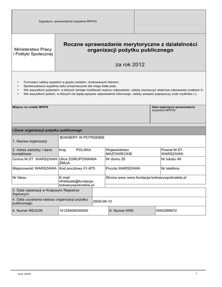 6\JQDWXUDVSUDZR]GDQLDZ\SHáQLD 6\JQDWXUDVSUDZR]GDQLDZ\SHáQLD03L36 MPiPS) Ministerstwo Pracy L3ROLW\NL6SRáHF]QHM 5RF]QHVSUDZR]GDQLHPHU\WRU\F]QH]G]LDáDOQRĞFL RUJDQL]DFMLSRĪ\WNXSXEOLF]QHJR za rok 2012 • • • • )RUPXODU]QDOHĪ\Z\SHáQLüZMĊ]\NXSROVNLPGUXNRZDQ\PLOLWHUDPL 6SUDZR]GDZFDZ\SHáQLDW\ONRSU]H]QDF]RQHGODQLHJRELDáHSROD :HZV]\VWNLFKS\WDQLDFKZNWyU\FKLVWQLHMHPRĪOLZRĞüZ\ERUXRGSRZLHG]LQDOHĪ\]D]QDF]\üZáDĞFLZHRGSRZLHG]L]QDNLHP; :HZV]\VWNLFKSRODFKZNWyU\FKQLHEĊGąZSLVDQHRGSRZLHGQLHLQIRUPDFMHQDOHĪ\ZVWDZLüSRMHG\QF]\]QDNP\ĞOQLND 'DWDZSá\QLĊFLDVSUDZR]GDQLD Z\SHáQLD03L36 Miejsce na notatki MPiPS ,'DQHRUJDQL]DFMLSRĪ\WNXSXEOLF]QHJR BOKSERY W POTRZEBIE 1. Nazwa organizacji 2. Adres siedziby i dane kontaktowe Kraj POLSKA Województwo MAZOWIECKIE Powiat M.ST. WARSZAWA Gmina M.ST. WARSZAWA Ulica ZGRUPOWANIA ĩ0,-$ Nr domu 25 Nr lokalu 49 0LHMVFRZRĞü:$56=$:$ Kod pocztowy 01-875 Poczta WARSZAWA Nr telefonu Nr faksu Strona www www.fundacja-bokserywpotrzebie.pl E-mail [email protected] 3. Data rejestracji w Krajowym Rejestrze 6ąGRZ\P 'DWDX]\VNDQLDVWDWXVXRUJDQL]DFMLSRĪ\WNX publicznego 5. Numer REGON Druk: MPiPS 14125406200000 2009-09-10 6. Numer KRS 0000288972 1 6NáDGRUJDQX]DU]ąG]DMąFHJRRUJDQL]DFML 1DOHĪ\ZSLVDüLPLRQDQD]ZLVNDRUD]LQIRUPDFMHRIXQNFML SHáQLRQHMSU]H]SRV]F]HJyOQ\FKF]áRQNyZRUJDQX ]DU]ąG]DMąFHJR 1DWDOLD)UHOLV]HN3UH]HV=DU]ąGX 5HQDWD.U\JLHU&]áRQHN=DU]ąGX 0DJGDOHQD'PRFKRZVND3U]HZRGQLF]ąFD5DG\ 6NáDGRUJDQXNRQWUROLOXEQDG]RUXRUJDQL]DFML $QQD/XEHFND&]áRQHN5DG\ 1DOHĪ\ZSLVDüLPLRQDQD]ZLVNDRUD]LQIRUPDFMHRIXQNFML $JDWD:RMWNR&]áRQHN5DG\ SHáQLRQHMSU]H]SRV]F]HJyOQ\FKF]áRQNyZRUJDQXNRQWUROL 7RPDV]*XOF]HZVNL&]áRQHN5DG\ lub nadzoru) $QGU]HM0HUNHU&]áRQHN5DG\ 9. Cele statutowe organizacji 1DOHĪ\RSLVDüFHOHQDSRGVWDZLHVWDWXWXRUJDQL]DFML &HOHP)XQGDFMLMHVWG]LDáDQLHQDU]HF]SRĪ\WNXSXEOLF]QHJRZ ]DNUHVLHKXPDQLWDUQHJRWUDNWRZDQLD]ZLHU]ąWREMĊFLDLFKRFKURQąL RWRF]HQLDRSLHNąRUD]SU]HFLZG]LDáDQLDZV]HONLPIRUPRP VWRVRZDQLDRNUXFLHĔVWZDSU]HPRF\LEHVWLDOVWZDZREHF]ZLHU]ąW 10. Sposób realizacji celów statutowych organizacji 1DOHĪ\RSLVDüVSRVyEUHDOL]DFMLFHOyZVWDWXWRZ\FK organizacji na podstawie statutu organizacji) Druk: MPiPS 2 1SURZDG]HQLHQRFOHJRZQLVFKURQLVNLSU]\WXOLVNGOD]ZLHU]ąWRUD] SRGHMPRZDQLHLQQ\FKG]LDáDĔPDMąF\FKQDFHOX]DSRELHJDQLHL ]ZDOF]DQLHEH]GRPQRĞFL]ZLHU]ąW 2XPLHV]F]DQLHSRU]XFRQ\FKLNU]\ZG]RQ\FK]ZLHU]ąWZ przytuliskach, schroniskach i noclegowniach prowadzonych przez inne podmioty; 3. wspieranie organizacyjne oraz finansowe placówek ĞZLDGF]ąF\FKSRPRF]ZLHU]ĊWRP 4SURZDG]HQLHG]LDáDOQRĞFLDGRSF\MQHM]ZLHU]ąWSRSU]H] wyszukiwanie dla nich opiekunów; 5ZGUDĪDQLHSURSDJRZDQLHLSURPRFMDSURJUDPXDQW\NRQFHSFML VWHU\OL]DFMLLNDVWUDFMLEH]GRPQ\FK]ZLHU]ąWRUD]SU]HFLZG]LDáDQLHZ QLHNRQFHVMRQRZDQ\PUR]PQDĪDQLX]ZLHU]ąWQLHJRVSRGDUF]\FK (nieprodukcyjnych); 6]ZDOF]DQLHZV]HONLFKIRUP]QĊFDQLDVLĊQDG]ZLHU]ĊWDPL SRSU]H]ZVSyáSUDFĊ]3ROLFMą6WUDĪą0LHMVNąRUD]LQQ\PL RUJDQL]DFMDPLZFHOXXMDZQLDQLDLĞFLJDQLDVSUDZFyZSU]HVWĊSVWZL Z\NURF]HĔSU]HFLZNR]ZLHU]ĊWRP 7. organizowanie i finansowanie kursów edukacyjnych, warsztatów LVSRWNDĔGODOXGQRĞFLZ]DNUHVLHSRWU]HE]ZLHU]ąWLUR]ZRMXLGHLLFK humanitarnego traktowania; 8. organizowanie i finansowanie konferencji i sympozjów QDXNRZ\FKSRĞZLĊFRQ\FKLGHLKXPDQLWDUQHJRVWRVXQNXGR]ZLHU]ąW ; 9ZVSyáSUDFĊ]RUJDQL]DFMDPLLLQVW\WXFMDPL]DMPXMąF\PLVLĊ RFKURQą]ZLHU]ąWZW\P]DJUDQLF]Q\PLLPLĊG]\QDURGRZ\PL 10ZVSyáSUDFD]LQVW\WXFMDPLSDĔVWZRZ\PLVDPRU]ąGRZ\PL VHNWRUHPJRVSRGDUF]\PĞURGNDPLPDVRZHJRSU]HND]X RVRELVWRĞFLDPLĪ\FLDSXEOLF]QHJRRUJDQL]DFMDPLSR]DU]ąGRZ\PLZ FHOXSURSDJRZDQLDKXPDQLWDUQHJRVWRVXQNXGR]ZLHU]ąW wskazywania ich potrzeb oraz w celu eliminacji wszelkich form RNUXFLHĔVWZDZREHF]ZLHU]ąW 11GRĪ\ZLHQLHLOHF]HQLH]ZLHU]ąW 12RSUDFRZDQLHLZGUDĪDQLHSURJUDPXLGHQW\ILNDFML]ZLHU]ąWZFHOX RWRF]HQLDLFKRFKURQąLRSLHNą 13Z\VWĊSRZDQLH]LQLFMDW\ZDPLZ]DNUHVLHZ\GDZDQLDOXE]PLDQ\ SU]HSLVyZGRW\F]ąF\FKSUDZ]ZLHU]ąWRUD]DNW\ZQHXF]HVWQLFWZRZ procesie tworzenia aktów prawnych w tym zakresie; 14XSRZV]HFKQLDQLHZLHG]\RSUREOHPDFK]ZLą]DQ\FK] QLHKXPDQLWDUQ\PWUDNWRZDQLHP]ZLHU]ąWSRSU]H]Z\GDZDQLHL NROSRUWDĪXORWHNRUD]SODNDWyZSU]HND]\ZDQLHLQIRUPDFML]D SRĞUHGQLFWZHPUDGLDLWHOHZL]MLRUD]SXEOLF]QHSRND]\ILOPRZH 15SURZDG]HQLHSXQNWyZLQIRUPDF\MQ\FKZ]DNUHVLHPRĪOLZRĞFL DGRSFMLLLGHQW\ILNDFML]ZLHU]ąWXPLHV]F]DQLH]ZLHU]ąWZGRPDFK W\PF]DVRZ\FKDWDNĪHPRĪOLZRĞFLRWU]\PDQLDGODQLFKLQQHM pomocy; 16GRILQDQVRZ\ZDQLHG]LDáDOQRĞFLZ\GDZQLF]HMSRĞZLĊFRQHM SURSDJRZDQLXLGHLKXPDQLWDUQHJRVWRVXQNXGR]ZLHU]ąW 17. prowadzenie akcji charytatywnych na rzecz bezdomnych i NU]\ZG]RQ\FK]ZLHU]ąWZNUDMXL]DJUDQLFą 18SU]\]QDZDQLHQDJUyGLZ\UyĪQLHĔRVRERPIL]\F]Q\PL SUDZQ\P]DG]LDáDOQRĞüQDU]HF]KXPDQLWDUQHJRVWRVXQNXGR ]ZLHU]ąW 1DMZDĪQLHMV]HVIHU\G]LDáDOQRĞFLSRĪ\WNX publicznego HNRORJLDLRFKURQD]ZLHU]ąWRUD]RFKURQDG]LHG]LFWZD przyrodniczego 1DOHĪ\ZVND]DüQLHZLĊFHMQLĪWU]\QDMZDĪQLHMV]HSRG Z]JOĊGHPZLHONRĞFLZ\GDWNRZDQ\FKĞURGNyZVIHU\ G]LDáDOQRĞFLSRĪ\WNXSXEOLF]QHJRRNWyU\FKPRZDZDUW XVWXVWDZ\]GQLDNZLHWQLDURG]LDáDOQRĞFL SRĪ\WNXSXEOLF]QHJRLRZRORQWDULDFLH(Dz. U. z 2010 r. Nr 234, poz. 1536), ]DF]\QDMąFRGQDMZDĪQLHMV]HM Druk: MPiPS 3 ,,&KDUDNWHU\VW\NDG]LDáDOQRĞFLRUJDQL]DFMLSRĪ\WNXSXEOLF]QHJRZRNUHVLHVSUDZR]GDZF]\P 2SLVG]LDáDOQRĞFLSRĪ\WNXSXEOLF]QHJR )XQGDFMDZ\GDWNXMHX]\VNDQHĞURGNLQDUDWRZDQLHSRU]XFRQ\FKLEH]GRPQ\FK bokserów, odbieranych ze schronisk czy interwencji, które to jest przedmiotem G]LDáDOQRĞFL)XQGDFML *áyZQHG]LDáDQLD 2SLVJáyZQ\FKG]LDáDĔ SRGMĊW\FKSU]H]RUJDQL]DFMĊ - umieszczanie psów rasy bokser w klinikach i lecznicach w celu przeprowadzenia kompleksowej diagnostyki weterynaryjnej, przeprowadzenia QLH]EĊGQ\FKEDGDĔL]DELHJyZ XPLHV]F]DQLHSVyZZKRWHODFKGOD]ZLHU]ąWJG]LHRF]HNXMąQDVWDáHGRP\ umieszczanie psów w domach tymczasowych, gdzie nierzadko kontynuowane MHVWMHVWQLH]EĊGQHOHF]HQLHLJG]LHF]HNDMąQDGRP\VWDáH ILQDQVXMHSRPRFV]NROHQLRZąGODSVyZ]]DEXU]HQLDPLEHKDZLRUDOQ\PLE\ ]ZLĊNV]\üV]DQVĊQDLFKDGRSFMĊ ILQDQVXMHSRZ\ĪV]HG]LDáDQLD =DVLĊJWHU\WRULDOQ\SURZDG]RQHMSU]H]RUJDQL]DFMĊ G]LDáDOQRĞ