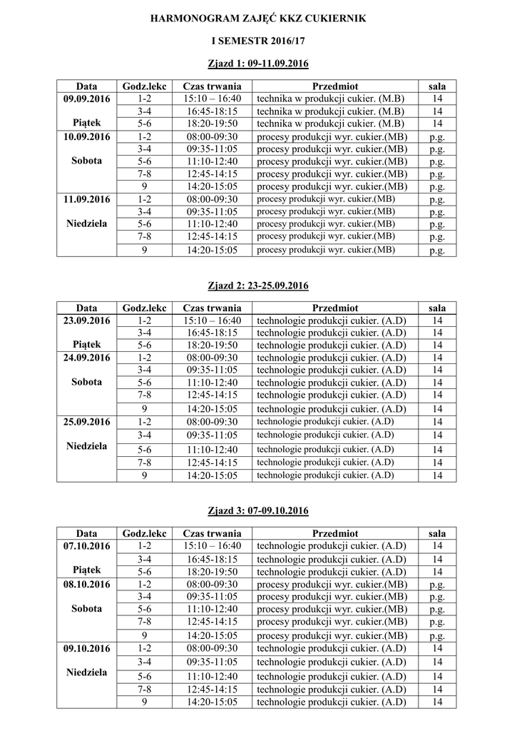 HARMONOGRAM ZAJĘĆ KKZ CUKIERNIK I SEMESTR 2016/17 Zjazd 1: 09-11.09.2016 Data 09.09.2016 Piątek 10.09.2016 Sobota 11.09.2016 Niedziela Godz.lekc 1-2 3-4 5-6 1-2 3-4 5-6 7-8 9 1-2 3-4 5-6 7-8 9 Czas trwania 15:10 – 16:40 16:45-18:15 18:20-19:50 08:00-09:30 09:35-11:05 11:10-12:40 12:45-14:15 14:20-15:05 08:00-09:30 09:35-11:05 11:10-12:40 12:45-14:15 14:20-15:05 Przedmiot technika w produkcji cukier. (M.B) technika w produkcji cukier. (M.B) technika w produkcji cukier. (M.B) procesy produkcji wyr. cukier.(MB) procesy produkcji wyr. cukier.(MB) procesy produkcji wyr. cukier.(MB) procesy produkcji wyr. cukier.(MB) procesy produkcji wyr. cukier.(MB) procesy produkcji wyr. cukier.(MB) procesy produkcji wyr. cukier.(MB) procesy produkcji wyr. cukier.(MB) procesy produkcji wyr. cukier.(MB) procesy produkcji wyr. cukier.(MB) sala 14 14 14 p.g. p.g. p.g. p.g. p.g. p.g. p.g. p.g. p.g. p.g. Zjazd 2: 23-25.09.2016 Data 23.09.2016 Piątek 24.09.2016 Sobota 25.09.2016 Niedziela Godz.lekc 1-2 3-4 5-6 1-2 3-4 5-6 7-8 9 1-2 3-4 5-6 7-8 9 Czas trwania 15:10 – 16:40 16:45-18:15 18:20-19:50 08:00-09:30 09:35-11:05 11:10-12:40 12:45-14:15 14:20-15:05 08:00-09:30 09:35-11:05 11:10-12:40 12:45-14:15 14:20-15:05 Przedmiot technologie produkcji cukier. (A.D) technologie produkcji cukier. (A.D) technologie produkcji cukier. (A.D) technologie produkcji cukier. (A.D) technologie produkcji cukier. (A.D) technologie produkcji cukier. (A.D) technologie produkcji cukier. (A.D) technologie produkcji cukier. (A.D) technologie produkcji cukier. (A.D) technologie produkcji cukier. (A.D) technologie produkcji cukier. (A.D) technologie produkcji cukier. (A.D) technologie produkcji cukier. (A.D) sala 14 14 14 14 14 14 14 14 14 14 14 14 14 Zjazd 3: 07-09.10.2016 Data 07.10.2016 Piątek 08.10.2016 Sobota 09.10.2016 Niedziela Godz.lekc 1-2 3-4 5-6 1-2 3-4 5-6 7-8 9 1-2 3-4 5-6 7-8 9 Czas trwania 15:10 – 16:40 16:45-18:15 18:20-19:50 08:00-09:30 09:35-11:05 11:10-12:40 12:45-14:15 14:20-15:05 08:00-09:30 09:35-11:05 11:10-12:40 12:45-14:15 14:20-15:05 Przedmiot technologie produkcji cukier. (A.D) technologie produkcji cukier. (A.D) technologie produkcji cukier. (A.D) procesy produkcji wyr. cukier.(MB) procesy produkcji wyr. cukier.(MB) procesy produkcji wyr. cukier.(MB) procesy produkcji wyr. cukier.(MB) procesy produkcji wyr. cukier.(MB) technologie produkcji cukier. (A.D) technologie produkcji cukier. (A.D) technologie produkcji cukier. (A.D) technologie produkcji cukier. (A.D) technologie produkcji cukier. (A.D) sala 14 14 14 p.g. p.g. p.g. p.g. p.g. 14 14 14 14 14 Zjazd 4: 21-23.10.2016 Data 21.10.2016 Piątek 22.10.2016 Sobota 23.10.2016 Niedziela Godz.lekc 1-2 3-4 5-6 1-2 3-4 5-6 7-8 9 1-2 3-4 5-6 7-8 9 Czas trwania 15:10 – 16:40 16:45-18:15 18:20-19:50 08:00-09:30 09:35-11:05 11:10-12:40 12:45-14:15 14:20-15:05 08:00-09:30 09:35-11:05 11:10-12:40 12:45-14:15 14:20-15:05 Przedmiot technologie produkcji cukier. (A.D) technologie produkcji cukier. (A.D) technologie produkcji cukier. (A.D) technologie produkcji cukier. (A.D) technologie produkcji cukier. (A.D) technologie produkcji cukier. (A.D) technologie produkcji cukier. (A.D) technologie produkcji cukier. (A.D) procesy produkcji wyr. cukier.(MB) procesy produkcji wyr. cukier.(MB) procesy produkcji wyr. cukier.(MB) procesy produkcji wyr. cukier.(MB) procesy produkcji wyr. cukier.(MB) sala 14 14 14 14 14 14 14 14 p.g. p.g. p.g. p.g. p.g. Zjazd 5: 04-06.11.2016 Data 04.11.2016 Piątek 05.11.2016 Sobota 06.11.2016 Niedziela Godz.lekc 1-2 3-4 5-6 1-2 3-4 5-6 7-8 9 1-2 3-4 5-6 7-8 9 Czas trwania 15:10 – 16:40 16:45-18:15 18:20-19:50 08:00-09:30 09:35-11:05 11:10-12:40 12:45-14:15 14:20-15:05 08:00-09:30 09:35-11:05 11:10-12:40 12:45-14:15 14:20-15:05 Przedmiot technologie produkcji cukier. (A.D) technologie produkcji cukier. (A.D) technologie produkcji cukier. (A.D) procesy produkcji wyr. cukier.(MB) procesy produkcji wyr. cukier.(MB) procesy produkcji wyr. cukier.(MB) procesy produkcji wyr. cukier.(MB) procesy produkcji wyr. cukier.(MB) technologie produkcji cukier. (A.D) technologie produkcji cukier. (A.D) technologie produkcji cukier. (A.D) technologie produkcji cukier. (A.D) technologie produkcji cukier. (A.D) sala 14 14 14 p.g. p.g. p.g. p.g. p.g. 14 14 14 14 14 Zjazd 6: 18-20.11.2016 Data 18.11.2016 Piątek 19.11.2016 Sobota 20.11.2016 Niedziela Godz.lekc 1-2 3-4 5-6 Czas trwania 15:10 – 16:40 16:45-18:15 18:20-19:50 Przedmiot technologie produkcji cukier. (A.D) technologie produkcji cukier. (A.D) technologie produkcji cukier. (A.D) sala 14 14 14 1-2 3-4 5-6 7-8 9 1-2 3-4 5-6 7-8 9 08:00-09:30 09:35-11:05 11:10-12:40 12:45-14:15 14:20-15:05 08:00-09:30 09:35-11:05 11:10-12:40 12:45-14:15 14:20-15:05 procesy produkcji wyr. cukier.(MB) procesy produkcji wyr. cukier.(MB) procesy produkcji wyr. cukier.(MB) procesy produkcji wyr. cukier.(MB) procesy produkcji wyr. cukier.(MB) technika w produkcji cukier. (M.B) technika w produkcji cukier. (M.B) technika w produkcji cukier. (M.B) technika w produkcji cukier. (M.B) technika w produkcji cukier. (M.B) p.g. p.g. p.g. p.g. p.g. 14 14 14 14 14 Zjazd 7: 25-27.11.2016 Data 25.11.2016 Piątek 26.11.2016 Sobota 27.11.2016 Niedziela Godz.lekc 1-2 3-4 5-6 1-2 3-4 5-6 7-8 9 1-2 3-4 5-6 7-8 9 Czas trwania 15:10 – 16:40 16:45-18:15 18:20-19:50 08:00-09:30 09:35-11:05 11:10-12:40 12:45-14:15 14:20-15:05 08:00-09:30 09:35-11:05 11:10-12:40 12:45-14:15 14:20-15:05 Przedmiot technologie produkcji cukier. (A.D) technologie produkcji cukier. (A.D) technologie produkcji cukier. (A.D) technika w produkcji cukier. (M.B) technika w produkcji cukier. (M.B) język niemiecki zawodowy (A.R) działalność gosp.w przeds.spoż (A.Ch) działalność gosp.w przeds.spoż (A.Ch) procesy produkcji wyr. cukier.(MB) procesy produkcji wyr. cukier.(MB) procesy produkcji wyr. cukier.(MB) procesy produkcji wyr. cukier.(MB) procesy produkcji wyr. cukier.(MB) sala 14 14 14 14 14 14 14 14 p.g. p.g. p.g. p.g. p.g. Zjazd 8: 02-04.12.2016 Data 02.12.2016 Pi
