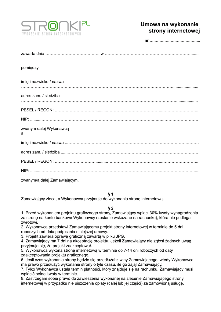 Umowa na wykonanie strony internetowej nr ………………………………….. zawarta dnia …………………………………. w ………………………………………………………....... pomiędzy: imię i nazwisko / nazwa …………………………………………………………………………………………………....................... adres zam. / siedziba ……………………………………………………………………………………………………................... PESEL / REGON: …………………………..........…………………………………...…………………….. NIP: ..........……………………………………………………………………….….…..…….……………… zwanym dalej Wykonawcą a imię i nazwisko / nazwa ..…………………………………………………………………………….……… adres zam. / siedziba ......…………………………………………………………………………………… PESEL / REGON: …………………………..........…………………………………...…………………….. NIP: ..........…………………………………………………………………………….…………………….... zwanym/ą dalej Zamawiającym. §1 Zamawiający zleca, a Wykonawca przyjmuje do wykonania stronę internetową. §2 1. Przed wykonaniem projektu graficznego strony, Zamawiający wpłaci 30% kwoty wynagrodzenia za stronę na konto bankowe Wykonawcy (zostanie wskazane na rachunku), która nie podlega zwrotowi. 2. Wykonawca przedstawi Zamawiającemu projekt strony internetowej w terminie do 5 dni roboczych od dnia podpisania niniejszej umowy. 3. Projekt zawiera oprawę graficzną zawartą w pliku JPG. 4. Zamawiający ma 7 dni na akceptację projektu. Jeżeli Zamawiający nie zgłosi żadnych uwag przyjmuje się, że projekt zaakceptował. 5. Wykonawca wykona stronę internetową w terminie do 7-14 dni roboczych od daty zaakceptowania projektu graficznego. 6. Jeśli czas wykonania strony będzie się przedłużał z winy Zamawiającego, wtedy Wykonawca ma prawo przedłużyć wykonanie strony o tyle czasu, ile go zajął Zamawiający. 7. Tylko Wykonawca ustala termin płatności, który znajduje się na rachunku, Zamawiający musi wpłacić pełne kwoty w terminie. 8. Zastrzegam sobie prawo do zawieszenia wykonanej na zlecenie Zamawiającego strony internetowej w przypadku nie uiszczenia opłaty (całej lub jej części) za zamówioną usługę. §3 1. Zamawiający ma 7 dni na przedstawienie uwag do strony. Jeżeli Zamawiający nie wyrazi uwag dotyczących wykonania i funkcjonowania, przyjmuje się, że stronę zaakceptował. 2. Brak odbioru przez Zamawiającego zleconej pracy w ciągu 20 dni od daty odbioru uzgodnionej i podanej na zamówieniu, podpisanym przez Zamawiającego, będzie traktowane jako odmowa dokonania zapłaty przez Zamawiającego i będzie stanowić podstawę do wystąpienia przez Wykonawcę na drogę sądową wobec Zamawiającego. §4 1. Aktualizacja strony przez pierwszy miesiąc jest darmowa, później odpłatna od 10 zł na numer konta: 33 1090 2776 0000 0001 1468 3193 2. Po skończeniu strony Wykonawca nie zwraca kwoty za stronę. 3. Wykonawca nie odpowiada za materiały (treści i grafiki) zamieszczone na stronie. 4. Wykonawca ma prawo zamieścić stronę Zamawiającego w swoim portfolio. 5. Strona internetowa może być umieszczona na serwerach Wykonawcy do roku czasu za darmo w cenie wykonania strony internetowej oraz w późniejszej opłacie w wysokości od 50 zł na kolejny rok z góry. 6. Domena do strony przez pierwszy rok jest za darmo, za kolejne lata jest odpłatnie co roku, zgodnie z cennikiem domen internetowych. 7. Zamawiający zgadza się na pozostawienie stopki Wykonawcy z adresem stronki.pl. 8. Usunięcie stopki kosztuje 150 zł i nie może być wykonane bez wiedzy Wykonawcy. 9. W przypadku odstąpienia od umowy z winy Zamawiającego, wyłączne prawo do projektu strony pozostaje przy Wykonawcy. 10. Naruszenie powyższych obowiązków będzie skutkowało możliwością dochodzenia przez Wykonawcę kary umownej w wysokości ……........ zł (słownie............................................ zł) oraz odszkodowania przewyższającego tą karę na zasadach ogólnych. §5 Za wykonanie strony, Wykonawca otrzyma wynagrodzenie w wysokości …………… zł brutto (słownie: …….………………………………). Wynagrodzenie zostanie przekazane na konto bankowe Wykonawcy (zostanie wskazane na rachunku) w terminie 14 dni od daty otrzymania rachunku. §6 1. Zamawiający nabywa majątkowe prawa autorskie do strony internetowej w zakresie: 1) Utrwalania techniką cyfrową. 2) Publicznego udostępniania kodu wynikowego (pola eksploatacji). 2. Przeniesienie majątkowych praw autorskich następuje nieodpłatnie. §7 1. W sprawach nie unormowanych w umowie stosuje się przepisy kodeksu cywilnego oraz ustawy o prawie autorskim i prawach pokrewnych oraz ustawy o obrocie instrumentami finansowymi. Ewentualne spory rozstrzygnięte będą przez sąd właściwy miejscowo dla siedziby wykonawcy. 2. Wszelkie zmiany niniejszej umowy wymagają formy pisemnej pod rygorem nieważności. 3. Umowę sporządzono w dwóch jednobrzmiących egzemplarzach po jednym dla każdej ze stron. …………………………............ …………………………............ Zamawiający Wykonawca