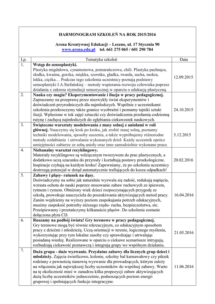 HARMONOGRAM SZKOLEŃ NA ROK 2015/2016 Arena Kreatywnej Edukacji – Leszno, ul. 17 Stycznia 90 www.arena.edu.pl tel. 661 275 065 / 601 290 784 Lp. 1. 2. 3. 4. 5. 6. 7. Tematyka szkoleń Wstęp do sensoplastyki. Plastyka migdałowa, cynamonowa, pomarańczowa, chili. Plastyka pachnąca, słodka, kwaśna, gorzka, miękka, szorstka, gładka, twarda, sucha, mokra, lekka, ciężka… Podczas tego szkolenia uczestnicy poznają podstawy sensoplastyki I.A.Stefańskiej – metody wspierania rozwoju człowieka poprzez działania z zakresu stymulacji sensorycznej w oparciu o edukację plastyczną. Nauka czy magia? Eksperymentowanie i iluzja w pracy pedagogicznej. Zapraszamy na przeprawę przez niezwykły świat eksperymentów i doświadczeń przyrodniczych dla najmłodszych. Wspólnie z uczestnikami szkolenia przekroczymy także granice wyobraźni i poznamy tajniki sztuki iluzji. Wplecione w tok zajęć sztuczki czy doświadczenia przełamią codzienną rutynę i zachęcą najmłodszych do zgłębiania ciekawostek naukowych. Świąteczne warsztaty modelowania z masy solnej z aniołami w roli głównej. Nauczymy się krok po kroku, jak zrobić masę solną, poznamy techniki modelowania, sposoby suszenia, a także wypróbujemy różnorodne metody ozdabiania i utrwalania wykonanych dzieł. Każdy uczestnik oprócz umiejętności zabierze ze sobą anioły oraz inne samodzielnie wykonane prace. Niebanalny warsztat recyklingowy. Materiały recyklingowe są wdzięcznym tworzywem do prac plastycznych, a dodatkowo uczą szacunku do przyrody i kształtują postawy proekologiczne. Inspiracje czyhają na każdym kroku! Zapewniamy, że po szkoleniu uczestnicy dostrzegą potencjał w dotąd automatycznie trafiających do kosza odpadkach! Zabawy i pląsy- ratunek na dąsy. Doświadczymy na sobie jak naturalnie wyzwala się radość, redukują napięcia, wzrasta ochota do nauki poprzez stosowanie zabaw ruchowych ze śpiewem, rytmem i rymem. Obniżony wiek dzieci rozpoczynających przygodę ze szkołą, prowokuje nauczyciela do poszukiwania aktywizujących metod pracy. Zanim wejdziemy na wyższy poziom zaspokajania potrzeb edukacyjnych, musimy zaspokoić potrzeby niższego rzędu- ruchu, bezpieczeństwa, etc. Prześpiewamy i przetańczymy kilkanaście pląsów. Do szkolenia zostanie dołączona płyta CD. Ruszamy na podbój świata! Gry terenowe w pracy pedagogicznej. Gry terenowe mogą być równie rekreacyjnym, co edukacyjnym sposobem pracy z dziećmi i młodzieżą. Uczą orientacji w terenie, logicznego myślenia, wykorzystując przy tym lokalne zasoby czy sprawdzając i utrwalając posiadaną wiedzę. Realizowane w oparciu o ciekawe scenariusze intrygują, rozbudzają ciekawość poznawczą i integrują grupy we wspólnym działaniu. Duża grupa - duże wyzwanie. Przydatne zabawy dla licznych grup dzieci i młodzieży. Zajęcia świetlicowe, kolonie, szkolny bal karnawałowy czy piknik rodzinny z pewnością stanowią wyzwanie dla prowadzących, którym zależy na włączeniu jak największej liczby uczestników do wspólnej zabawy. Warto na tę okoliczność mieć w zanadrzu kilka propozycji zabaw aktywizujących dużą liczbę uczestników jednocześnie, podnoszących poziom energii grupowej i spełniających funkcje integracyjne. Data 12.09.2015 24.10.2015 5.12.2015 20.02.2016 16.04.2016 21.05.2016 11.06.2016 Wstęp do sensoplastyki. Termin szkolenia 12.09.2015 godz. 11.00 - 14.00 i 15.00-18.00 Liczba godzin dydaktycznych 4 Adresat Osoby pracujące z dziećmi i młodzieżą, ale nie tylko… Zapraszamy wszystkich, którzy pragną poznać, czym jest sensoplastyka i odnajdują jej zastosowanie w swoim życiu. Opis szkolenia Plastyka migdałowa, cynamonowa, pomarańczowa, chili. Plastyka pachnąca, słodka, kwaśna, gorzka, miękka, szorstka, gładka, twarda, sucha, mokra, lekka, ciężka… Podczas tego szkolenia poznamy podstawy sensoplastyki metody wspierania rozwoju człowieka poprzez działania z zakresu stymulacji sensorycznej w oparciu o edukację plastyczną. Będziemy ćwiczyć sposoby przygotowania ekologicznych materiałów plastycznych oraz techniki podczas których można je wykorzystać. Zobaczymy w jaki sposób działania sensoplastyczne pozwalają nam rozwijać kompetencje intra oraz interpersonalne niezbędne we współczesnym świecie. Będziemy stymulować wszystkie nasze zmysły dzięki kolorowemu brudzeniu. Zwrócimy uwagę na znaczenie jakie ma edukacja sensorycznoplastyczna we wspieraniu wszechstronnego rozwoju zarówno dzieci jak i osób dorosłych. Imię i nazwisko prowadzącego Izabela Anna Stefańska Opis prowadzącego Koszt Coach, pedagog twórczości, arteterapeutka, edukatorka plastyczna, projektantka. Autorka sensoplastyki - metody stymulowania rozwoju poprzez działania plastyczne. Od 8 lat zajmuje się pedagogiką twórczości oraz profilaktyką arteterapeutyczną czyli działaniami pro-rozwojowymi opartymi na wykorzystywaniu ekspresji twórczej człowieka. Specjalizuje się w pracy z dziećmi w wieku 06lat. Największą inspiracją są dla niej jej dzieci, dzięki którym jest mocno zaangażowana w poszerzanie swojej wiedzy i kompetencji. Stale podnosi swoje kwalifikacje uczestnicząc w międzynarodowych i ogólnopolskich konferencjach dotyczących wykorzystania sztuki w edukacji, terapii i rozwoju człowieka. 250 zł. Udział w szkoleniu daje uprawnienia do prowadzenia zajęć edukacyjnych z elementami Sensoplastyki. Wszyscy uczestnicy otrzymują certyfikat. Nauka czy magia? Eksperymentowanie i iluzja w pracy pedagogicznej. Termin szkolenia 24.10.2015 godz. 10.00 - 15.00 Liczba godzin dydaktycznych 6 Adresat Nauczyciele, pedagodzy, wychowawcy, animatorzy, studenci, osoby pracujące z dziećmi i młodzieżą Opis szkolenia Zapraszamy na przeprawę przez niezwykły świat eksperymentów i doświadczeń przyrodniczych dla najmłodszych. Wspólnie z uczestnikami szkolenia przekroczymy także granice wyobraźni i poznamy tajniki sztuki iluzji. Odkryjemy nowe oblicza ognia czy wody,