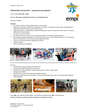 Półkolonie zimowe 2017 PÓŁKOLONIE zimowe 2017 – „Łyżwiarski zawrót głowy” Termin: 13-‐17.02, 8:00 – 16:30 Miejsce: Warszawa, Lodowisko Torwar II, ul. Łazienkowska 6a Dla kogo: 7-‐13 lat Program: • 1 h dziennie zajęć na lodzie (doskonalenie i nauka jazdy) • blok zajęć ruchowych: codzienna rozgrzewka „na wesoło” oraz zajęcia wzmacniające, koordynacyjne, ogólnorozwojowe/taneczne (taniec nowoczesny) • zajęcia plastyczne – projektowanie strojów dla łyżwiarzy, rysunek „lodowisko moich marzeń”, lepienie, budowanie z klocków Lego • warsztaty „zdrowy łyżwiarz” • gry planszowe znane i nieznane (np. „łyżwiarski slalom”, którą dzieci wykonają same • gry i zabawy (zimowe kalambury, rzut ochraniaczem do celu, „spostrzegawczy łyżwiarz”) i poznawanie tajemnic lodowiska (co robi rolba, jak się przygotowuje lód) • spacery na świeżym powietrzu (Agrykola, Łazienki) • czytanie książek • pokaz na zakończenie tygodnia W cenie: • Profesjonalna opieka w godzinach 8:00-‐16:30 • Wstęp do obiektów (lodowisko, sala fitness) • Wyżywienie: drugie śniadanie, obiad, podwieczorek + woda i ciepłe napoje • Ubezpieczenie NNW • Wypożyczenie sprzętu dla osób nieposiadających łyżew • Zajęcia prowadzone przez specjalistów – instruktorów łyżwiarstwa, tańca oraz absolwentkę Akademii Sztuk Pięknych Cena: 899,-‐ dla członków klubu Walley i uczestników wyjazdów Empi, 959,-‐ dla osób spoza. Pierwsze 3 zapisane osoby otrzymają rabat 30 zł oraz śpioszki na łyżwy. Magdalena i Jacek Tascher TŁF Walley, Julianów, ul. Kombatantów 60 www.walley.pl Półkolonie zimowe 2017 PÓŁKOLONIE zimowe 2017 – „Łyżwiarski zawrót głowy” Przykładowy harmonogram: • 8:00-‐8:30 – powitanie dzieci, plan dnia • 8:30-‐9:15 – rozgrzewka „na wesoło” • 9:15-‐9:45 – czas na łyk wody i drobną przekąskę, przebieranie się na łyżwy • 9:45-‐10:45 – zajęcia na lodzie w grupach • 10:45-‐11:15 – przebieranie się, drugie śniadanie • 11:15-‐12:15 – zajęcia plastyczne • 12:15-‐13:15 – zajęcia sportowe np. zajęcia koordynacyjne/ogólnorozwojowe/taniec lub spacer • 13:30-‐14:15 – obiad • 14:15-‐14:45 – czytanie książek • 14:45-‐16:15 – gry i zabawy/zajęcia sportowe • 16:15 – podwieczorek • 16:30 – odbieranie dzieci przez rodziców * w środę istnieje możliwość, za dopłatą, pozostawienia dziecka jeszcze na drugi trening lodowy, który rozpocznie się o 17:25 Rezerwacja miejsca: • formularz zgłoszeniowy: www.walley.pl/zapisy • zaliczka 350 zł (stanowi potwierdzenie rezerwacji miejsca) • pozostała kwota płatna do 31.01 • dane do wpłaty: MUKS Walley-‐Plus Duo, al. Armii Ludowej 4/46, 00-‐571 Warszawa Konto: PKO Bank Polski S.A. 16 Oddział/Warszawa 09 1020 1169 0000 8702 0124 4086 • prosimy o przesłanie potwierdzenia na adres: [email protected] z dopiskiem „półkolonie” • więcej informacji: Magdalena Tascher +48 518 964 605, Michalina Górska +48 502 648 237, [email protected] ZAPRASZAMY na wspaniałą łyżwiarską przygodę z klubem Walley. Od 1991 roku uczymy, organizujemy obozy, pokazy oraz imprezy okolicznościowe. Magdalena i Jacek Tascher TŁF Walley, Julianów, ul. Kombatantów 60 www.walley.pl