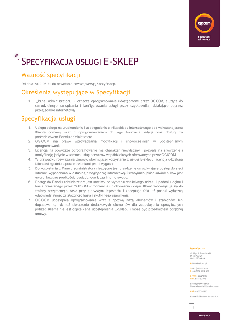 SPECYFIKACJA USŁUGI E-SKLEP Ważność specyfikacji Od dnia 2010-05-21 do odwołania nowszą wersją Specyfikacji. Określenia występujące w Specyfikacji 1. „Panel administratora” – oznacza oprogramowanie udostępnione przez OGICOM, służące do samodzielnego zarządzania i konfigurowania usługi przez użytkownika, działające poprzez przeglądarkę internetową. Specyfikacja usługi 1. 2. 3. 4. 5. 6. 7. Usługa polega na uruchomieniu i udostępnieniu silnika sklepu internetowego pod wskazaną przez Klienta domeną wraz z oprogramowaniem do jego tworzenia, edycji oraz obsługi za pośrednictwem Panelu administratora. OGICOM ma prawo wprowadzania modyfikacji i unowocześnień w udostępnianym oprogramowaniu. Licencja na powyższe oprogramowanie ma charakter niewyłączny i pozwala na stworzenie i modyfikację jedynie w ramach usług serwerów współdzielonych oferowanych przez OGICOM. W przypadku rozwiązania Umowy, obejmującej korzystanie z usługi E-sklepu, licencja udzielona Klientowi zgodnie z postanowieniami pkt. 1 wygasa. Do korzystania z Panelu administratora niezbędne jest urządzenie umożliwiające dostęp do sieci Internet, wyposażone w aktualną przeglądarkę internetową. Przesyłanie jakichkolwiek plików jest uwarunkowane prędkością posiadanego łącza internetowego. Dostęp do Panelu administratora jest możliwy po wybraniu właściwego adresu i podaniu loginu i hasła przesłanego przez OGICOM w momencie uruchomienia sklepu. Klient zobowiązuje się do zmiany otrzymanego hasła przy pierwszym logowaniu i akceptuje fakt, iż ponosi wyłączną odpowiedzialność za złożoność hasła i skutki jego ujawnienia OGICOM udostępnia oprogramowanie wraz z gotową bazą elementów i szablonów. Ich dopasowanie, lub też stworzenie dodatkowych elementów dla zaspokojenia specyficznych potrzeb Klienta nie jest objęte ceną udostępnienia E-Sklepu i może być przedmiotem odrębnej umowy. 1