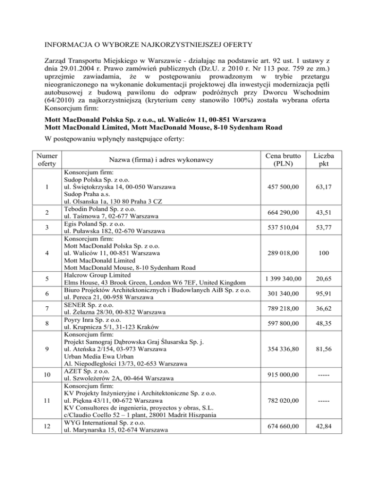 INFORMACJA O WYBORZE NAJKORZYSTNIEJSZEJ OFERTY Zarząd Transportu Miejskiego w Warszawie - działając na podstawie art. 92 ust. 1 ustawy z dnia 29.01.2004 r. Prawo zamówień publicznych (Dz.U. z 2010 r. Nr 113 poz. 759 ze zm.) uprzejmie zawiadamia, że w postępowaniu prowadzonym w trybie przetargu nieograniczonego na wykonanie dokumentacji projektowej dla inwestycji modernizacja pętli autobusowej z budową pawilonu do odpraw podróżnych przy Dworcu Wschodnim (64/2010) za najkorzystniejszą (kryterium ceny stanowiło 100%) została wybrana oferta Konsorcjum firm: Mott MacDonald Polska Sp. z o.o., ul. Waliców 11, 00-851 Warszawa Mott MacDonald Limited, Mott MacDonald Mouse, 8-10 Sydenham Road W postępowaniu wpłynęły następujące oferty: Numer oferty 1 2 3 4 5 6 7 8 9 10 11 12 Nazwa (firma) i adres wykonawcy Konsorcjum firm: Sudop Polska Sp. z o.o. ul. Świętokrzyska 14, 00-050 Warszawa Sudop Praha a.s. ul. Olsanska 1a, 130 80 Praha 3 CZ Tebodin Poland Sp. z o.o. ul. Taśmowa 7, 02-677 Warszawa Egis Poland Sp. z o.o. ul. Puławska 182, 02-670 Warszawa Konsorcjum firm: Mott MacDonald Polska Sp. z o.o. ul. Waliców 11, 00-851 Warszawa Mott MacDonald Limited Mott MacDonald Mouse, 8-10 Sydenham Road Halcrow Group Limited Elms House, 43 Brook Green, London W6 7EF, United Kingdom Biuro Projektów Architektonicznych i Budowlanych AiB Sp. z o.o. ul. Pereca 21, 00-958 Warszawa SENER Sp. z o.o. ul. Żelazna 28/30, 00-832 Warszawa Poyry Inra Sp. z o.o. ul. Krupnicza 5/1, 31-123 Kraków Konsorcjum firm: Projekt Samograj Dąbrowska Graj Ślusarska Sp. j. ul. Ateńska 2/154, 03-973 Warszawa Urban Media Ewa Urban Al. Niepodległości 13/73, 02-653 Warszawa AZET Sp. z o.o. ul. Szwoleżerów 2A, 00-464 Warszawa Konsorcjum firm: KV Projekty Inżynieryjne i Architektoniczne Sp. z o.o. ul. Piękna 43/11, 00-672 Warszawa KV Consultores de ingenieria, proyectos y obras, S.L. c/Claudio Coello 52 – 1 plant, 28001 Madrit Hiszpania WYG International Sp. z o.o. ul. Marynarska 15, 02-674 Warszawa Cena brutto (PLN) Liczba pkt 457 500,00 63,17 664 290,00 43,51 537 510,04 53,77 289 018,00 100 1 399 340,00 20,65 301 340,00 95,91 789 218,00 36,62 597 800,00 48,35 354 336,80 81,56 915 000,00 ----- 782 020,00 ----- 674 660,00 42,84 13 Konsorcjum firm: Biuro Projektów Budownictwa Ogólnego BUDOPOL S.A. ul. Królewska 27, 00-060 Warszawa CTD – Civil Transport Designers s.c. Grzegorz Dąbrowski, Hubert Kleban, Maciej Kryński ul. Fanfarowa 7, 02-858 Warszawa Biuro Inżynieryjnych Usług Projektowych Sp. z o.o. ul. K. Czapińskiego 3, 30-048 Kraków 877 180,00 32,95 Zamawiający zgodnie z art. 92 ust. 1 pkt 1-3 ustawy z dnia 29.01.2004 r.-Prawo zamówień publicznych (Dz. U. z 2010 r. Nr 113 poz. 759 ze zm.) zawiadamia, że w przedmiotowym postępowaniu wykluczeni zostali wykonawcy: 1. AZET Sp. z o.o. - na podstawie art. 24 ust. 2 pkt 4 (złożone na wezwanie zamawiającego dokumenty i oświadczenie nie potwierdzają spełniania przez wykonawcę warunków udziału w postępowaniu nie później niż w dniu, w którym upłynął termin składania ofert), 2. Konsorcjum firm: KV Projekty Inżynieryjne i Architektoniczne Sp. z o.o., KV Consultores de ingenieria, proyectos y obras, S.L. – na podstawie art. 24 ust. 2 pkt 2 (nie wniósł wadium do upływu terminu składania ofert). Oferty ww. wykonawców zostały odrzucone na podstawie art. 24 ust. 4, zgodnie z którym ofertę wykonawcy wykluczonego uznaje się za odrzuconą. Jednocześnie zamawiający informuje, że umowa w sprawie zamówienia publicznego może być zawarta po dniu 17.01.2011 r.