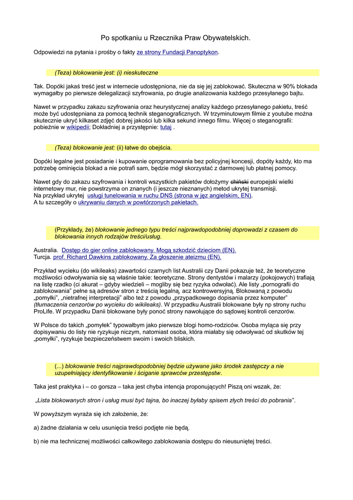 Po spotkaniu u Rzecznika Praw Obywatelskich. Odpowiedzi na pytania i prośby o fakty ze strony Fundacji Panoptykon. (Teza) blokowanie jest: (i) nieskuteczne Tak. Dopóki jakaś treść jest w internecie udostępniona, nie da się jej zablokować. Skuteczna w 90% blokada wymagałby po pierwsze delegalizacji szyfrowania, po drugie analizowania każdego przesyłanego bajtu. Nawet w przypadku zakazu szyfrowania oraz heurystycznej analizy każdego przesyłanego pakietu, treść może być udostępniana za pomocą technik steganograficznych. W trzyminutowym filmie z youtube można skutecznie ukryć kilkaset zdjęć dobrej jakości lub kilka sekund innego filmu. Więcej o steganografii: pobieżnie w wikipedii; Dokładniej a przystępnie: tutaj . (Teza) blokowanie jest: (ii) łatwe do obejścia. Dopóki legalne jest posiadanie i kupowanie oprogramowania bez policyjnej koncesji, dopóty każdy, kto ma potrzebę ominięcia blokad a nie potrafi sam, będzie mógł skorzystać z darmowej lub płatnej pomocy. Nawet gdy do zakazu szyfrowania i kontroli wszystkich pakietów dołożymy chiński europejski wielki internetowy mur, nie powstrzyma on znanych (i jeszcze nieznanych) metod ukrytej transmisji. Na przykład ukrytej usługi tunelowania w ruchu DNS (strona w jęz angielskim, EN). A tu szczegóły o ukrywaniu danych w powtórzonych pakietach. (Przykłady, że) blokowanie jednego typu treści najprawdopodobniej doprowadzi z czasem do blokowania innych rodzajów treści/usług. Australia. Dostęp do gier online zablokowany. Mogą szkodzić dzieciom (EN). Turcja. prof. Richard Dawkins zablokowany. Za głoszenie ateizmu (EN). Przykład wycieku (do wikileaks) zawartości czarnych list Australii czy Danii pokazuje też, że teoretyczne możliwości odwoływania się są właśnie takie: teoretyczne. Strony dentystów i malarzy (pokojowych) trafiają na listę rzadko (ci akurat – gdyby wiedzieli – mogliby się bez ryzyka odwołać). Ale listy „pornografii do zablokowania” pełne są adresów stron z treścią legalną, acz kontrowersyjną. Blokowaną z powodu „pomyłki”, „nietrafnej interpretacji” albo też z powodu „przypadkowego dopisania przez komputer” (tłumaczenia cenzorów po wycieku do wikileaks). W przypadku Australii blokowane były np strony ruchu ProLife. W przypadku Danii blokowane były ponoć strony nawołujące do sądowej kontroli cenzorów. W Polsce do takich „pomyłek” typowałbym jako pierwsze blogi homo-rodziców. Osoba myląca się przy dopisywaniu do listy nie ryzykuje niczym, natomiast osoba, która miałaby się odwoływać od skutków tej „pomyłki”, ryzykuje bezpieczeństwem swoim i swoich bliskich. (...) blokowanie treści najprawdopodobniej będzie używane jako środek zastępczy a nie uzupełniający identyfikowanie i ściganie sprawców przestępstw. Taka jest praktyka i – co gorsza – taka jest chyba intencja proponujących! Piszą oni wszak, że: „Lista blokowanych stron i usług musi być tajna, bo inaczej byłaby spisem złych treści do pobrania”. W powyższym wyraża się ich założenie, że: a) żadne działania w celu usunięcia treści podjęte nie będą. b) nie ma technicznej możliwości całkowitego zablokowania dostępu do nieusuniętej treści. Czy (i dlaczego) nie należy dopuszczać blokowania nawet jako rozwiązania doraźnego/tymczasowego (np. na kilka miesięcy, dopóki treść nie zostanie usunięta)?. Ponieważ blokowanie, choćby tymczasowe, tylko na jeden dzień, wymaga wdrożenia mechanizmów zaglądania do każdej paczki z danymi, które wysyłamy. A jak już się zagląda, to i retencja musi być. Rozwinięcie:, by w miarę skutecznie blokować, trzeba będzie zalegalizować masową kontrolę treści przesyłanych pakietów (DPI, deep packet inspection). Nie da się blokować bez dowiedzenia się wcześniej, po jaką stronę czy usługę obywatel chce sięgnąć. ISP będą więc zobowiązani do zaglądania w każdy pakiet danych, który wysyłamy. W tej chwili zaglądanie do treści korespondencji (transmisji) bez nakazu sądu lub prokuratora jest w Europie nielegalne. W imię „ochrony dzieci”, ma się stać nie tylko legalne, ale ma stać się obowiązkiem każdego dostawcy internetu. Następne będzie żądanie, by dane te podlegały retencji. Obecnie retencja obejmuje same adresy, a pod jednym adresem mogą być dostępne tysiące różnych domen (np www.site.com i poker.gambling.org). Kiedy ISP będą już zobligowani do odczytywania z pakietów dokładnego adresu URL, to wprowadzenie retencji danych o tym do jakiej dokładnie informacji obywatel uzyskał dostęp „nie będzie powodowało skutków finansowych” a także „umożliwi policji skuteczniejszą walkę z terroryzmem i dziecięcą pornografią”. Czy blokowanie stron – ze względów technicznych – musi działać jako „system wczesnego ostrzegania przestępców” (tj. czy można skutecznie ukryć przed administratorem strony fakt jej blokowania?). Nie. Przed administratorem nie można ukryć faktu zablokowania strony. Przed administratorem przestępczym tym bardziej ukryć blokady nie można: Przestępca będzie miał ustawione w różnych krajach automaty sprawdzające czy dostęp jest czy go brak. „Ukryć” się da przed autorem czy autorką mało popularnego kontrowersyjnego bloga. Ci się dowiedzą, jak ktoś im powie. O ile się dowiedzą, bo „dobre blokowanie” zapewne odetnie ich od tych, którzy by im o tym mogli powiedzieć przez formularz na blogu. Czy problem pojawiania się w spamie odnośników do treści z tzw. pornografią dziecięcą (a tym samym narażania użytkowników na przypadkowy, niechciany kontakt z takimi treściami) jest poważny i jak można go skutecznie rozwiązać. Nie wiem. (Na prawie dwadzieścia lat) spamów z tytułem sugerującym dziecięcą pornografię widziałem kilka. Nie czytuję jednak spamu. Mało kto czyta spam, spam jest filtrowany na nasze życzenie przez nasze programy pocztowe. W o