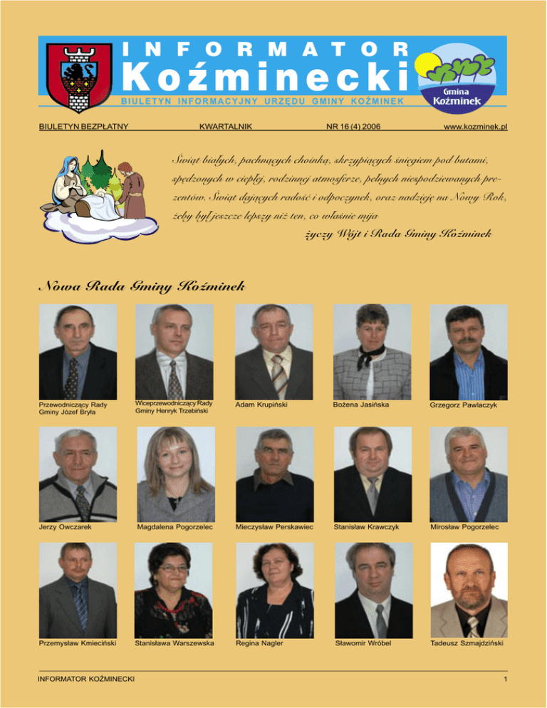 BIULETYN BEZPŁATNY KWARTALNIK NR 16 (4) 2006 www.kozminek.pl Świąt białych, pachnących choinką, skrzypiących śniegiem pod butami, spędzonych w ciepłej, rodzinnej atmosferze, pełnych niespodziewanych prezentów. Świąt dających radość i odpoczynek, oraz nadzieję na Nowy Rok, żeby był jeszcze lepszy niż ten, co właśnie mija życzy Wójt i Rada Gminy Koźminek Nowa Rada Gminy Koźminek Przewodniczący Rady Gminy Józef Bryła Wiceprzewodniczący Rady Gminy Henryk Trzebiński Adam Krupiński Bożena Jasińska Grzegorz Pawlaczyk Jerzy Owczarek Magdalena Pogorzelec Mieczysław Perskawiec Stanisław Krawczyk Mirosław Pogorzelec Regina Nagler Sławomir Wróbel Tadeusz Szmajdziński Przemysław Kmieciński INFORMATOR KOŹMINECKI Stanisława Warszewska 1 INFORMATOR KOŹMINECKI „Rewaloryzacja Zabytkowego Parku w Koźminku” Dzień Niepodległości W dniu 25 października 2006 roku, w Koźminku odbyła się uroczystość związana z zakończeniem I etapu rewaloryzacji zabytkowego parku. Sięgając do historii trzeba nadmienić, że dwór w Koźminku wraz z otaczającym go parkiem został wpisany do rejestru zabytków 12 czerwca 1954 roku. Park i dwór pochodzą z 2 połowy XVIII w. Mając na uwadze wartość artystyczną, kulturalną i historyczną kompleksu dworsko-parkowego, opracowano dokumentację dla inwestycji pn.: „Rewaloryzacja Parku Zabytkowego w Koźminku”. Projekt opracowali: Tadeusz Wiekiera, Zdzisław Walczak i Marcin Włodarczyk. W wyniku przeprowadzonego postępowania o udzielenie zamówienia publicznego w trybie przetargu nieograniczonego o wartości powyżej 60 000 euro dla inwestycji pn.: „Rewaloryzacja Parku Zabytkowego w Koźminku” wybrano ofertę, którą złożyła firma: Przedsiębiorstwo Robót Inżynieryjnych Spółka z o.o. ul. Komunalna 8, 62-700 Turek (cena brutto oferty 709.069,10 zł). W ramach I etapu rewaloryzacji parku zabytkowego wykonano m.in.: alejki żwirowe, owalny podjazd przed front dworu z kamienia polnego, główną bramę wjazdową, ogrodzenie typu lekkiego całego parku oraz rozbudowano oświetlenie. W kolejnych etapach planuje się zrekultywować stawy oraz uzupełnić drzewostan. Projekt został zrealizowany w ramach Programu Operacyjnego: Sektorowy Program Operacyjny „Restrukturyzacja i modernizacja sektora żywnościowego oraz rozwój obszarów wiejskich 2004-2006”, Priorytet: „Zrównoważony rozwój obszarów wiejskich”, Działanie: „Odnowa wsi oraz zachowanie i ochrona dziedzictwa kulturowego”. Dofinansowanie projektu ze środków Unii Europejskiej wyniesie 450.000,00 zł. Na uroczystość przybyli zaproszeni goście: Wicemarszałek Województwa Wielkopolskiego Józef Racki, Starosta Kaliski Leszek Aleksandrzak, Przedstawiciel Departamentu Rozwoju Regionalnego Urzędu Marszałkowskiego pan Jan Wujczak, Przedstawiciel Delegatury w Kaliszu Wojewódzkiego Urzędu Ochrony Zabytków w Poznaniu pan Zdzisław Walczak, Radni Gminy i Sołtysi, Ksiądz Proboszcz z Koźminka Zenon Dereszowski, Przedstawiciele Firmy P. R. I. z Turku pan Prezes Witold Rosiak, Dyrektor Ds. Technicznych pani Ewa Kamińska, autorzy projektu panowie: Tadeusz Wiekiera, Zdzisław Walczak i Marcin Włodarczyk, Inspektorzy Nadzoru panowie: Piotr Kinastowski i Janusz Zakrzewski. Symbolicznego przecięcia wstęgi przy bramie parkowej dokonali wspólnie: gospodarz uroczystości Wójt Gminy Koźminek, Wicemarszałek Województwa Wielkopolskiego Józef Racki, Starosta Kaliski, Ksiądz Proboszcz Zenon Dereszowski oraz Sołtys Koźminka. Goście zwiedzili wspólnie kompleks parkowo – pałacowy. Autor: D. Marszał 11 listopada 2006 roku obchodziliśmy 88 rocznicę odzyskania przez Polskę niepodległości. W minionym ustroju, było to święto zakazane przez władze, jedynie Kościół doceniał ten wielki dzień w należyty sposób, celebrując uroczyste msze za ojczyznę. Po 1989 roku Dzień Niepodległości odzyskał swą rangę i jest świętem państwowym. W bieżącym roku, po raz kolejny, obchodzono Dzień Niepodległości w Koźminku. Ceremonia rozpoczęła się w kościele parafialnym mszą świętą, w której uczestniczyły władze gminy, poczty sztandarowe jednostek straży pożarnej, szkół oraz orkiestra dęta. Po nabożeństwie głos zabrał wójt gminy Andrzej Miklas. W swoim wystąpieniu mówił m.in. o roli Józefa Piłsudskiego w odzyskaniu niepodległości przez Polskę. Wójt przytoczył też słowa niemieckiego filozofa Johanna Fichte: „Być wolnym… to nic, ale odzyskać wolność – to niebo”. W dalszej części uroczystości, dzieci ze Szkoły Podstawowej w Nowym Nakwasinie zaprezentowały montaż słowno-muzyczny. Dzieci przygotowali: Karolina Duleba i Mirosław Bruź, który również prowadził całą uroczystość. Następnie zebrani wysłuchali koncertu utworów patriotycznych w wykonaniu gminnej orkiestry dętej pod batutą Henryka Siudy. Po części artystycznej uformował się korowód, w którym szli: wójt gminy, radni, proboszcz, poczty sztandarowe, delegacje z wieńcami, orkiestra dęta oraz pozostali uczestnicy uroczystości. Wszyscy udali się pod pomnik, gdzie w obecności pełniących wartę harcerzy, oddano hołd poległym za wolność ojczyzny. Na zakończenie wójt gminy podziękował orkiestrze dętej, dzieciom i młodzieży, pocztom sztandarowym, delegacjom z wieńcami oraz wszystkim przybyłym na uroczystość. Autor: N. Sobczak Uroczyste przecięcie wstęgi w bramie wjazdowej do parku. Fot. M. Kaczmarek 2 Dzień Niepodległości w Koźminku. Fot. Urząd Gminy Koźminek Rola hymnu w życiu Narodu Polskiego 26 Października bieżącego roku w Gimnazjum im. Noblistów Polskich w Koźminku miała miejsce niecodzienna uroczystość, poświęcona historii hymnu Polskiego. Jej celem było przybliżenie młodzieży gimnazjalnej bogatej historii polskich pieśni hymnicznych. Widzowie mieli rzadką okazję wysłuchania wszystkie pieśni które na przestrzeni wieków odgrywały rolę hymnu polskiego, były