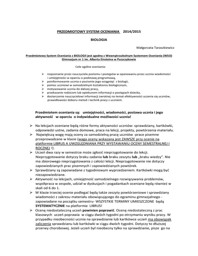 PRZEDMIOTOWY SYSTEM OCENIANIA 2014/2015 BIOLOGIA
