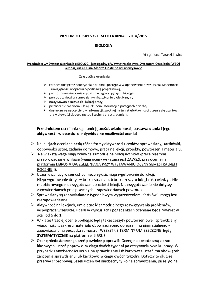 PRZEDMIOTOWY SYSTEM OCENIANIA 2014/2015 BIOLOGIA Małgorzata Taraszkiewicz Przedmiotowy System Oceniania z BIOLOGII jest zgodny z Wewnątrzszkolnym Systemem Oceniania (WSO) Gimnazjum nr 1 im. Alberta Einsteina w Puszczykowie Cele ogólne oceniania: rozpoznanie przez nauczyciela poziomu i postępów w opanowaniu przez ucznia wiadomości i umiejętności w oparciu o podstawę programową, poinformowanie ucznia o poziomie jego osiągnięć z biologii, pomoc uczniowi w samodzielnym kształceniu biologicznym, motywowanie ucznia do dalszej pracy, przekazanie rodzicom lub opiekunom informacji o postępach dziecka, dostarczenie nauczycielowi informacji zwrotnej na temat efektywności uczenia się uczniów, prawidłowości doboru metod i technik pracy z uczniem. Przedmiotem oceniania są: umiejętności, wiadomości, postawa ucznia i jego aktywność w oparciu o indywidualne możliwości ucznia! Na lekcjach oceniane będą różne formy aktywności uczniów: sprawdziany, kartkówki, odpowiedzi ustne, zadania domowe, praca na lekcji, projekty, powtórzenia materiału. Największą wagę mają oceny za samodzielną pracę uczniów -prace pisemne przeprowadzane w klasie (waga oceny wskazana jest ZAWSZE przy ocenie na platformie LIBRUS A UWZGLĘDNIANA PRZY WYSTAWANIU OCENY SEMESTRALNEJ I ROCZNEJ !). Uczeń dwa razy w semestrze może zgłosić nieprzygotowanie do lekcji. Nieprzygotowanie dotyczy braku zadania lub braku zeszytu lub „braku wiedzy”. Nie ma zbiorowego nieprzygotowania z całości lekcji. Nieprzygotowanie nie dotyczy zapowiedzianych prac pisemnych i zapowiedzianych powtórek. Sprawdziany są zapowiadane z tygodniowym wyprzedzeniem. Kartkówki mogą być niezapowiedziane. Aktywność na lekcjach, umiejętność samodzielnego rozwiązywania problemów, współpraca w zespole, udział w dyskusjach i pogadankach oceniane będą również w skali od 6 do 1. W klasie trzeciej ocenie podlegać będą także zeszyty powtórzeniowe i sprawdziany wiadomości z zakresu materiału obowiązującego do egzaminu gimnazjalnego zapowiadane na początku semestru- WSZYSTKIE TERMINY UMIESZCZONE będą SYSTEMATYCZNIE na platformie LIBRUS! Ocenę niedostateczną uczeń powinien poprawić. Ocenę niedostateczną z prac klasowych uczeń poprawia w ciągu dwóch tygodni po otrzymaniu wyniku pracy. W przypadku nieobecności ucznia na sprawdzianie lub kartkówce uczeń ma obowiązek zaliczenia sprawdzianu lub kartkówki w ciągu dwóch tygodni. Dotyczy to dłuższej przerwy chorobowej. Jeżeli uczeń był nieobecny tylko na sprawdzianie, pisze go na najbliższej lekcji lub umówionym terminie! Jeżeli nieobecność ucznia była długa uczeń może umówić się na zaliczenie zaległości w innym terminie. Uczeń nie ma możliwości zaliczania pozostawionych zaległości na koniec semestru lub roku szkolnego. Ocena z poprawy zastępuje ocenę poprawianą bez względu na jej wynik. Ocena śródroczna lub semestralna jest średnią ważoną, którą uczeń może w każdej chwili zobaczyć na platformie LIBRUS, wspólnie z nauczycielem prowadzącym. Uczeń powinien na bieżąco kontrolować swoje postępy w nauce i omawiać ich wynik z nauczycielem. Ważne jest zaangażowanie ucznia w ciągu roku i dlatego na koniec roku ocena jest średnią ważoną pracy całego roku. Oceny i postępy każdego ucznia przekazane na bieżąco są przez platformę LIBRUS, dodatkowe spotkania z rodzicami lub prawnymi opiekunami oraz przez maila podanego uczniom w pierwszym dniu nauki: [email protected] Wymagania ogólne: Ocenę celującą otrzymuje uczeń, który: opanował wiadomości i umiejętności będące efektem jego samodzielnej pracy, prezentuje swoje wiadomości posługując się terminologią biologiczną, potrafi stosować zdobyte wiadomości w sytuacjach nietypowych, formułuje problemy i rozwiązuje je w sposób twórczy, dokonuje analizy lub syntezy zjawisk i procesów biologicznych, wykorzystuje wiedzę zdobytą na innych przedmiotach, potrafi samodzielnie korzystać z różnych źródeł informacji, bardzo aktywnie uczestniczy w procesie lekcyjnym, wykonuje dodatkowe zadania i polecenia, wykonuje twórcze prace, pomoce naukowe i potrafi je prezentować na terenie szkoły i poza nią, bierze udział w konkursach biologicznych na terenie szkoły i poza nią. Ocenę bardzo dobrą otrzymuje uczeń, który: opanował w pełnym zakresie wiadomości i umiejętności określone podstawą programową, wykazuje szczególne zainteresowania biologią, potrafi stosować zdobytą wiedzę do samodzielnego rozwiązywania problemów w nowych sytuacjach, bez pomocy nauczyciela korzysta z różnych źródeł informacji, wykonuje prace i zadania dodatkowe, prezentuje swoją wiedzę posługując się poprawną terminologią biologiczną, aktywnie uczestniczy w procesie lekcyjnym, Ocenę dobrą otrzymuje uczeń, który: opanował wiadomości i umiejętności bardziej złożone, przydatne i użyteczne w szkolnej i pozaszkolnej działalności, potrafi stosować zdobytą wiedzę do samodzielnego rozwiązywania problemów typowych, w przypadku trudniejszych korzysta z pomocy nauczyciela, udziela poprawnych odpowiedzi na typowe pytania, jest aktywny na lekcji, Ocenę dostateczną otrzymuje uczeń, który: opanował wiadomości i umiejętności niezbyt złożone, najważniejsze w nauczaniu biologii, oraz takie które można wykorzystać w sytuacjach szkolnych i pozaszkolnych, z pomocą nauczyciela rozwiązuje typowe problemy o małym stopniu trudności, z pomocą nauczyciela korzysta z takich źródeł wiedzy jak: słowniki, encyklopedie, tablice, wykresy, itp., wykazuje się aktywnością na lekcji w stopniu zadowalającym, Ocenę dopuszczającą otrzymuje uczeń, który: ma braki w opanowaniu wiadomości i umiejętności określonych podstawą programową ale nie przekreślają one możliwości dalszego kształcenia, wykonuje proste zadania i polecenia o bardzo małym stopniu trudności, pod kierunkiem nauczyciela, wiadomości przekazuje w spo