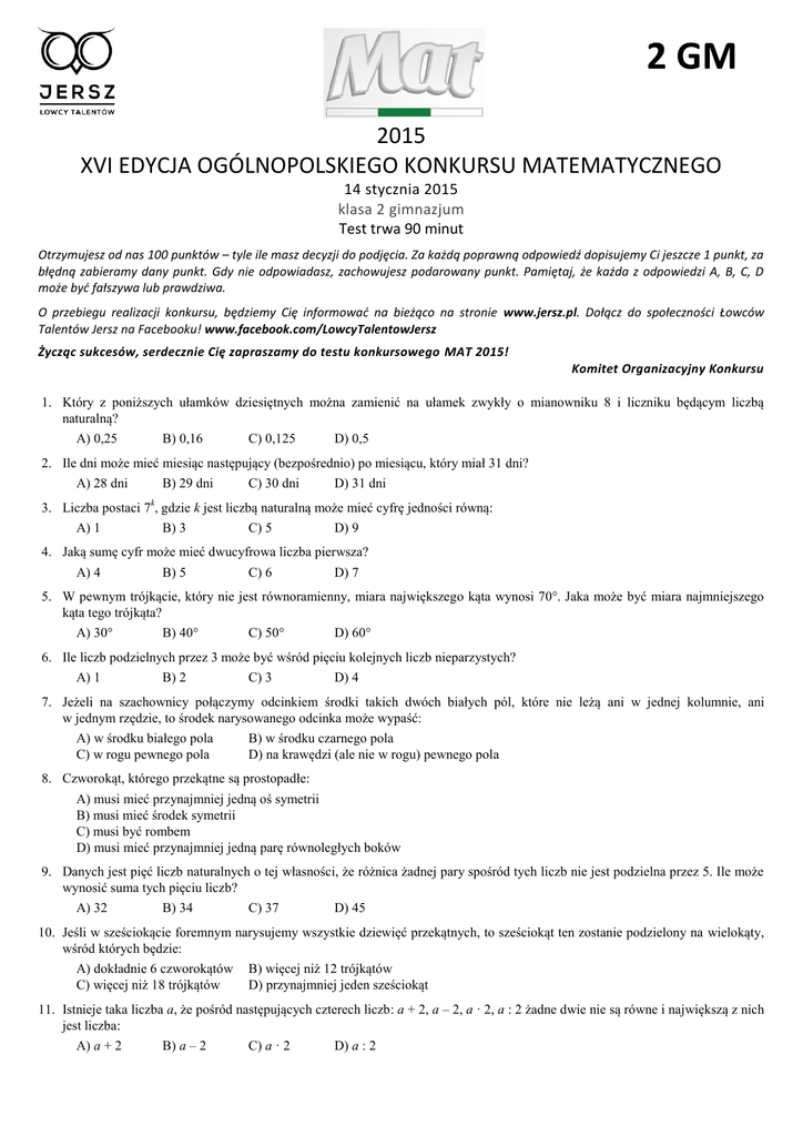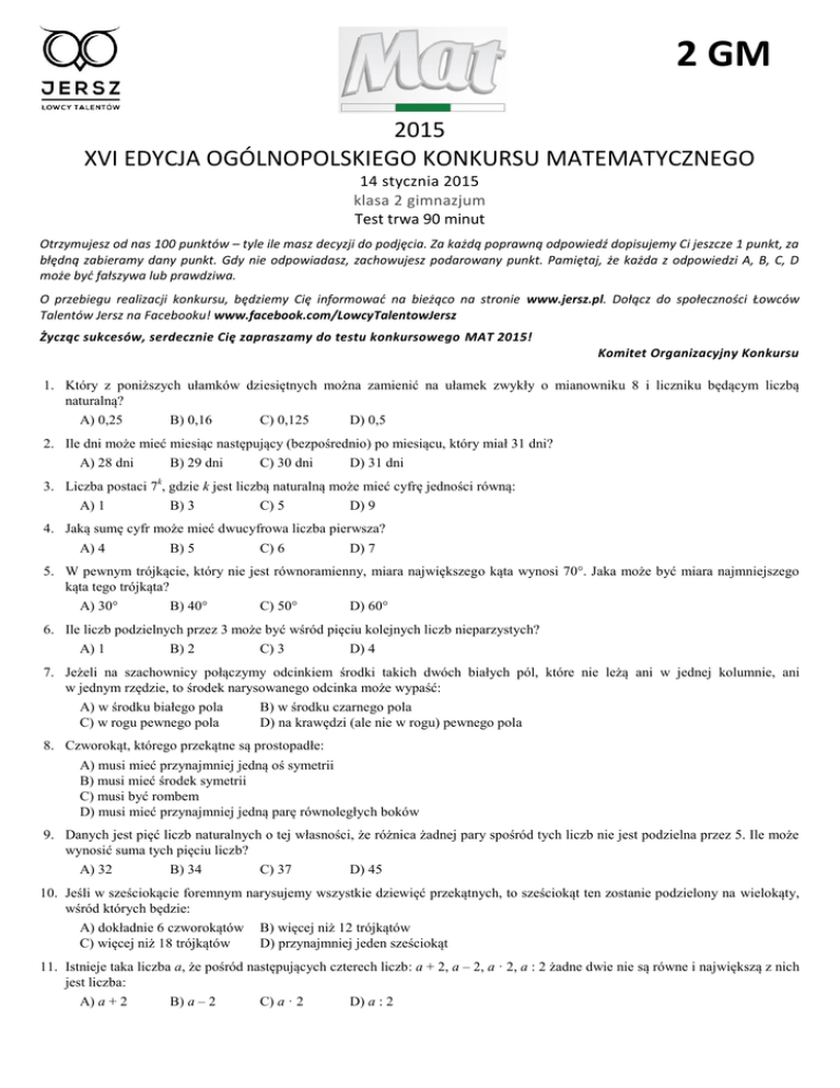 2 GM 2015 XVI EDYCJA OGÓLNOPOLSKIEGO KONKURSU MATEMATYCZNEGO 14 stycznia 2015 klasa 2 gimnazjum Test trwa 90 minut Otrzymujesz od nas 100 punktów – tyle ile masz decyzji do podjęcia. Za każdą poprawną odpowiedź dopisujemy Ci jeszcze 1 punkt, za błędną zabieramy dany punkt. Gdy nie odpowiadasz, zachowujesz podarowany punkt. Pamiętaj, że każda z odpowiedzi A, B, C, D może być fałszywa lub prawdziwa. O przebiegu realizacji konkursu, będziemy Cię informować na bieżąco na stronie www.jersz.pl. Dołącz do społeczności Łowców Talentów Jersz na Facebooku! www.facebook.com/LowcyTalentowJersz Życząc sukcesów, serdecznie Cię zapraszamy do testu konkursowego MAT 2015! Komitet Organizacyjny Konkursu 1. Który z poniższych ułamków dziesiętnych można zamienić na ułamek zwykły o mianowniku 8 i liczniku będącym liczbą naturalną? A) 0,25 B) 0,16 C) 0,125 D) 0,5 2. Ile dni może mieć miesiąc następujący (bezpośrednio) po miesiącu, który miał 31 dni? A) 28 dni B) 29 dni C) 30 dni D) 31 dni k 3. Liczba postaci 7 , gdzie k jest liczbą naturalną może mieć cyfrę jedności równą: A) 1 B) 3 C) 5 D) 9 4. Jaką sumę cyfr może mieć dwucyfrowa liczba pierwsza? A) 4 B) 5 C) 6 D) 7 5. W pewnym trójkącie, który nie jest równoramienny, miara największego kąta wynosi 70°. Jaka może być miara najmniejszego kąta tego trójkąta? A) 30° B) 40° C) 50° D) 60° 6. Ile liczb podzielnych przez 3 może być wśród pięciu kolejnych liczb nieparzystych? A) 1 B) 2 C) 3 D) 4 7. Jeżeli na szachownicy połączymy odcinkiem środki takich dwóch białych pól, które nie leżą ani w jednej kolumnie, ani w jednym rzędzie, to środek narysowanego odcinka może wypaść: A) w środku białego pola C) w rogu pewnego pola B) w środku czarnego pola D) na krawędzi (ale nie w rogu) pewnego pola 8. Czworokąt, którego przekątne są prostopadłe: A) musi mieć przynajmniej jedną oś symetrii B) musi mieć środek symetrii C) musi być rombem D) musi mieć przynajmniej jedną parę równoległych boków 9. Danych jest pięć liczb naturalnych o tej własności, że różnica żadnej pary spośród tych liczb nie jest podzielna przez 5. Ile może wynosić suma tych pięciu liczb? A) 32 B) 34 C) 37 D) 45 10. Jeśli w sześciokącie foremnym narysujemy wszystkie dziewięć przekątnych, to sześciokąt ten zostanie podzielony na wielokąty, wśród których będzie: A) dokładnie 6 czworokątów C) więcej niż 18 trójkątów B) więcej niż 12 trójkątów D) przynajmniej jeden sześciokąt 11. Istnieje taka liczba a, że pośród następujących czterech liczb: a + 2, a – 2, a · 2, a : 2 żadne dwie nie są równe i największą z nich jest liczba: A) a + 2 B) a – 2 C) a · 2 D) a : 2 12. Wybory w USA odbywają się zawsze w pierwszy wtorek po pierwszym poniedziałku listopada. Który z wymienionych poniżej dni może być dniem wyborów? A) 2 listopada C) 8 listopada B) 4 listopada D) 10 listopada 13. Z pewnej szkoły na wycieczkę pojechało 16 uczniów. Najstarszy z tych uczniów był o 5 lat starszy od najmłodszego, a łączny wiek wszystkich uczniów wynosił 240 lat. Ilu spośród tych uczniów mogło być pełnoletnich? A) 6 B) 7 C) 8 D) 9 14. Suma odwrotności trzech (niekoniecznie różnych) liczb naturalnych wynosi 1. Wśród tych trzech liczb może być liczba: A) 2 B) 3 C) 4 D) 5 15. Jaka może być cyfra dziesiątek dwucyfrowej liczby o tej własności, że jej 9-krotność powstaje przez wstawienie pomiędzy obie jej cyfry jednej dodatkowej cyfry? A) 1 B) 2 C) 3 D) 4 16. Aby zostać członkiem „Stowarzyszenia urodzonych 29 lutego” trzeba być urodzonym w tym właśnie dniu. Ilu członków może liczyć to stowarzyszenie, jeśli wiemy, że każdy jego członek ma w stowarzyszeniu dokładnie trzech rówieśników? A) 15 B) 18 C) 20 D) 24 17. Każda z obu przekątnych pewnego czworokąta dzieli go na dwa przystające trójkąty. W takim razie: A) czworokąt ten musi mieć przynajmniej jedną parę boków równoległych B) czworokąt ten musi mieć dwie pary boków równoległych C) czworokąt ten musi mieć prostopadłe przekątne D) punkt przecięcia przekątnych musi dzielić każdą z przekątnych tego czworokąta na dwie równe części 18. Każdy wierzchołek sześcianu malujemy na biało lub na czarno. Następnie każdą krawędź sześcianu malujemy na biało, jeśli jej końce są tego samego koloru, a na czarno, jeśli jej końce są różnych kolorów. Wśród krawędzi sześcianu mogą być: A) 3 białe i 9 czarnych C) 4 białe i 8 czarnych B) 9 białych i 3 czarne D) 8 białych i 4 czarne 19. Pewna trzycyfrowa liczba jest równa sześcianowi sumy swoich cyfr. Jaka może być cyfra setek tej liczby? A) 3 B) 4 C) 5 D) 6 20. Trójkąt równoboczny można rozciąć na: A) 3 trójkąty równoramienne C) 5 trójkątów równoramiennych B) 4 trójkąty równoramienne D) 6 trójkątów równoramiennych 21. Spotkania kółka szachowego odbywają się w co drugą niedzielę. Jeśli w pewnym roku nieprzestępnym pierwsze spotkanie odbyło się w drugą niedzielę stycznia, to ostatnie spotkanie mogło się odbyć: A) w ostatnią niedzielę grudnia C) przed 24 grudnia B) w przedostatnią niedzielę grudnia D) po 24 grudnia 22. Liczba 21 · 35 · 55 · 33 jest podzielna przez: A) 25 B) 49 C) 81 D) 121 23. Pewne dwie liczby mają tę własność, że ich iloczyn jest równy ich sumie. Jedną z tych liczb może być liczba: A) 1 B) 2 C) 3 D) 4 24. Pani Jadwiga rok temu skończyła tyle lat ile wynosi iloczyn cyfr roku jej urodzenia. Ile lat może mieć pani Jadwiga? A) pięćdziesiąt kilka lat C) siedemdziesiąt kilka lat B) sześćdziesiąt kilka lat D) więcej niż 80 lat 25. Pewien prostokąt rozcięto dwoma prostopadłymi odcinkami na cztery prostokąty. Pola trzech z tych prostokątów to 6, 8 i 12. Jakie może być pole wyjściowego prostokąta? A) 30 B) 35 C) 40 D) 42 PATRONI I PARTNERZY © COPYRIGHT BY ŁOWCY TALENTÓW – JERSZ. WILCZYN