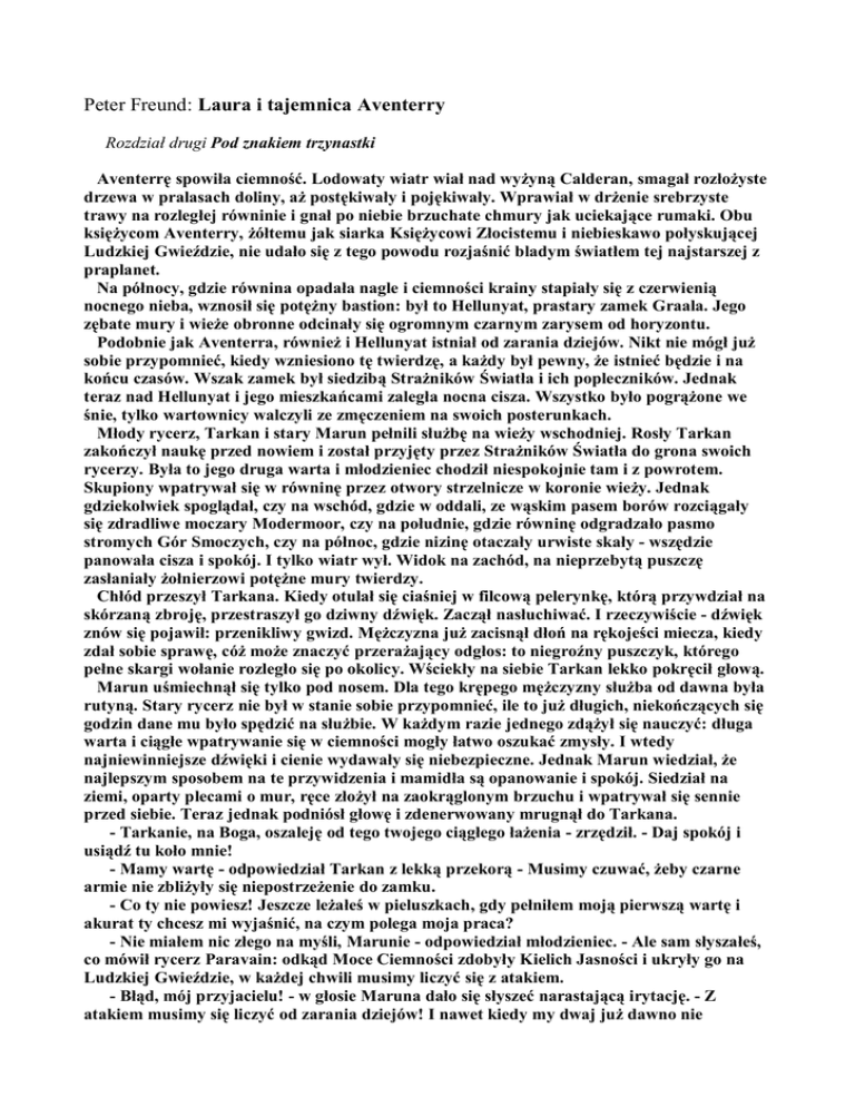 Peter Freund: Laura i tajemnica Aventerry Rozdział drugi Pod znakiem trzynastki Aventerrę spowiła ciemność. Lodowaty wiatr wiał nad wyżyną Calderan, smagał rozłożyste drzewa w pralasach doliny, aż postękiwały i pojękiwały. Wprawiał w drżenie srebrzyste trawy na rozległej równinie i gnał po niebie brzuchate chmury jak uciekające rumaki. Obu księżycom Aventerry, żółtemu jak siarka Księżycowi Złocistemu i niebieskawo połyskującej Ludzkiej Gwieździe, nie udało się z tego powodu rozjaśnić bladym światłem tej najstarszej z praplanet. Na północy, gdzie równina opadała nagle i ciemności krainy stapiały się z czerwienią nocnego nieba, wznosił się potężny bastion: był to Hellunyat, prastary zamek Graala. Jego zębate mury i wieże obronne odcinały się ogromnym czarnym zarysem od horyzontu. Podobnie jak Aventerra, również i Hellunyat istniał od zarania dziejów. Nikt nie mógł już sobie przypomnieć, kiedy wzniesiono tę twierdzę, a każdy był pewny, że istnieć będzie i na końcu czasów. Wszak zamek był siedzibą Strażników Światła i ich popleczników. Jednak teraz nad Hellunyat i jego mieszkańcami zaległa nocna cisza. Wszystko było pogrążone we śnie, tylko wartownicy walczyli ze zmęczeniem na swoich posterunkach. Młody rycerz, Tarkan i stary Marun pełnili służbę na wieży wschodniej. Rosły Tarkan zakończył naukę przed nowiem i został przyjęty przez Strażników Światła do grona swoich rycerzy. Była to jego druga warta i młodzieniec chodził niespokojnie tam i z powrotem. Skupiony wpatrywał się w równinę przez otwory strzelnicze w koronie wieży. Jednak gdziekolwiek spoglądał, czy na wschód, gdzie w oddali, ze wąskim pasem borów rozciągały się zdradliwe moczary Modermoor, czy na południe, gdzie równinę odgradzało pasmo stromych Gór Smoczych, czy na północ, gdzie nizinę otaczały urwiste skały - wszędzie panowała cisza i spokój. I tylko wiatr wył. Widok na zachód, na nieprzebytą puszczę zasłaniały żołnierzowi potężne mury twierdzy. Chłód przeszył Tarkana. Kiedy otulał się ciaśniej w filcową pelerynkę, którą przywdział na skórzaną zbroję, przestraszył go dziwny dźwięk. Zaczął nasłuchiwać. I rzeczywiście - dźwięk znów się pojawił: przenikliwy gwizd. Mężczyzna już zacisnął dłoń na rękojeści miecza, kiedy zdał sobie sprawę, cóż może znaczyć przerażający odgłos: to niegroźny puszczyk, którego pełne skargi wołanie rozległo się po okolicy. Wściekły na siebie Tarkan lekko pokręcił głową. Marun uśmiechnął się tylko pod nosem. Dla tego krępego mężczyzny służba od dawna była rutyną. Stary rycerz nie był w stanie sobie przypomnieć, ile to już długich, niekończących się godzin dane mu było spędzić na służbie. W każdym razie jednego zdążył się nauczyć: długa warta i ciągłe wpatrywanie się w ciemności mogły łatwo oszukać zmysły. I wtedy najniewinniejsze dźwięki i cienie wydawały się niebezpieczne. Jednak Marun wiedział, że najlepszym sposobem na te przywidzenia i mamidła są opanowanie i spokój. Siedział na ziemi, oparty plecami o mur, ręce złożył na zaokrąglonym brzuchu i wpatrywał się sennie przed siebie. Teraz jednak podniósł głowę i zdenerwowany mrugnął do Tarkana. - Tarkanie, na Boga, oszaleję od tego twojego ciągłego łażenia - zrzędził. - Daj spokój i usiądź tu koło mnie! - Mamy wartę - odpowiedział Tarkan z lekką przekorą - Musimy czuwać, żeby czarne armie nie zbliżyły się niepostrzeżenie do zamku. - Co ty nie powiesz! Jeszcze leżałeś w pieluszkach, gdy pełniłem moją pierwszą wartę i akurat ty chcesz mi wyjaśnić, na czym polega moja praca? - Nie miałem nic złego na myśli, Marunie - odpowiedział młodzieniec. - Ale sam słyszałeś, co mówił rycerz Paravain: odkąd Moce Ciemności zdobyły Kielich Jasności i ukryły go na Ludzkiej Gwieździe, w każdej chwili musimy liczyć się z atakiem. - Błąd, mój przyjacielu! - w głosie Maruna dało się słyszeć narastającą irytację. - Z atakiem musimy się liczyć od zarania dziejów! I nawet kiedy my dwaj już dawno nie będziemy istnieć, i również nasze dzieci, i dzieci naszych dzieci od dawna nie będą żyć, to się nie zmieni! Ale dlaczego, jak sądzisz, przydzielono cię do służby akurat na wschodniej wieży? Tarkan spojrzał na niego zdezorientowany. - No to ci zdradzę, młody Tarkanie - ciągnął Marun. - Jak każdemu początkującemu rycerzowi, Paravain wyznaczył ci wartę na wschodniej wieży, ponieważ Czarny Książę i jego wojska jeszcze nigdy nie przypuścili ataku od wschodu. Słyszysz? Czarna Armia nigdy nie zaatakowała Hellunyat od wschodu! Tarkan wyglądał, jakby go ktoś uderzył w głowę. - A wiesz dlaczego? - spytał Marun. - Ponieważ od tej strony nie znajdują żadnej osłony, bo widać ich stąd już z daleka, dlatego! - Chcesz przez to powiedzieć, że służba tutaj jest w istocie dziecinną igraszką? Że mogłoby ją pełnić nawet takie pacholę, jak Alaryk, giermek Paravaina? - Nie - Marun potrząsnął głową. - Służba na tej wieży ma stopniowo przyzwyczaić ciebie i innych młodych rycerzy do pełnienia warty. Chcę przez to powiedzieć, że nie powinieneś przesadzać. Nie ma potrzeby, żebyś wpatrywał się w ciemności jak nocny sokół. Usiądź lepiej na chwilę i daj trochę odpoczynku oczom. Tarkan zawahał się. Nie wiedział dokładnie, co powinien uczynić. Strażnik Światła zawierzył swoje życie rycerzom - a rycerz Paravain, pierwszy spośród trzynastu Białych Rycerzy i tym samym dowódca straży przybocznej, dopiero niedawno, podczas pasowania na rycerzy zbierał od młodzieńców obietnicę nieustannej czujności wobec Mocy Ciemności. Ponieważ od początku czasów toczyły one walkę z mocami Światła i niestrudzenie podejmowały próby pokonania dobra i przekazania panowania Wiecznej Nicości. Tarkan w zamyślen