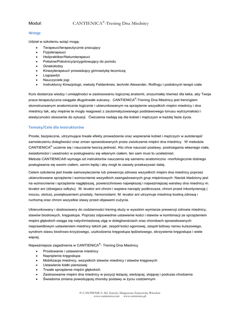 CANTIENICA®-Trening Dna Miednicy Moduł: Wstęp Udział w szkoleniu wziąć mogą: Terapeuci/terapeutycznie pracujący Fizjoterapeuci Heilpraktiker/Naturoterapeuci Położne/Położnicy/przygotowujący do porodu Ginekolodzy Kinezyterapeuci/ prowadzący gimnastykę leczniczą Logopedzi Nauczyciele jogi Instruktorzy Kinezjologii, metody Feldenkreis, techniki Alexander, Rolfingu i podobnych terapii ciała Kurs dostarcza wiedzy i umiejętności w zastosowaniu logicznej anatomii, zrozumiałej również dla laika, aby Twoja ® praca terapeutyczna osiągała długotrwałe sukcesy. CANTIENICA -Trening Dna Miednicy jest treningiem skonstruowanym anatomicznie logicznie i ukierunkowanym na sprzężenie wszystkich mięśni miednicy i dna miednicy tak, aby mięśnie te mogły reagować z zautomatyzowanego podstawowego tonusu wytrzymałości i elastyczności stosownie do sytuacji. Ćwiczenia nadają się dla kobiet i mężczyzn w każdej fazie życia. Tematy/Cele dla Instruktorów Proste, bezpieczne, utrzymujące trwałe efekty prowadzenie oraz wspieranie kobiet i mężczyzn w autoterapii/ samoleczeniu dolegliwości oraz zmian spowodowanych przez zwiotczenie mięśni dna miednicy. W metodzie ® CANTIENICA uczenie się i nauczanie tworzą jedność. Kto chce nauczać postawy, postrzegania własnego ciała, świadomości i uważności w posługiwaniu się własnym ciałem, ten sam musi to ucieleśniać. Metoda CANTIENICA® wymaga od instruktorów nauczenia się samemu anatomiczno -morfologicznie dobrego posługiwania się swoim ciałem, zanim będą i aby mogli te zasady przekazywać dalej. Celem szkolenia jest trwałe samowyleczenie lub prewencja zdrowia wszystkich mięśni dna miednicy poprzez ukierunkowane sprzężenie i wzmocnienie wszystkich zaangażowanych grup mięśniowych. Nacisk kładziony jest na wzmocnienie i sprzężenie najgłębszej, powierzchniowo największej i najważniejszej warstwy dna miednicy m. levator ani (dźwigacz odbytu). M. levator ani chroni i wspiera narządy podbrzusza, chroni przed inkontynencją ( moczu, stolca), powiększeniem prostaty, hemoroidami. M. levator ani utrzymuje miednicę kostną zdrową i ruchomą oraz chroni wszystkie stawy przed objawami zużycia. Ukierunkowany i dostosowany do codzienności trening służy w wysokim wymiarze prewencji zdrowia miednicy, stawów biodrowych, kręgosłupa. Poprzez odpowiednie ustawienie kości i stawów w kombinacji ze sprzężeniem mięśni głębokich osiąga się natychmiastową ulgę w dolegliwościach oraz chorobach spowodowanych nieprawidłowym ustawieniem miednicy takich jak: zespół kości ogonowej, zespół bólowy nerwu kulszowego, syndrom stawu biodrowo-krzyżowego, uszkodzenia kręgosłupa lędźwiowego, skrzywienie kręgosłupa i wiele więcej. ® Najważniejsze zagadnienia w CANTIENICA - Trening Dna Miednicy Prostowanie i ustawienie miednicy Naprężenie kręgosłupa Mobilizacja miednicy, wszystkich stawów miednicy i stawów kręgowych Ustawienie klatki piersiowej Trwałe sprzężenie mięśni głębokich Zastosowanie mięśni dna miednicy w pozycji leżącej, siedzącej, stojącej i podczas chodzenia Świadoma zmiana powodującej choroby postawy w życiu codziennym © CANTIENICA AG Zurych, Małgorzata Żarnowska Wrocław www.cantienica.com www.cantienica.pl Struktura Samokształcenie kierowane z obszernym podręcznikiem, przez co najmniej 6 tygodni Intensywne trzydniowe seminarium w małej grupie ( 6-8 osób). Małe grupy gwarantują, że każdy uczestnik może być poprowadzony i sprawdzony podczas każdego ćwiczenia Własna praktyka, co najmniej 60 udokumentowanych godzin (zajęcia grupowe i indywidualne) Follow-up - dalsza praca, ocena i wręczenie dyplomu Zapoznaj się z przebiegiem szkolenia na www.cantienica-instruktor.com Zakres Wprowadzenie: ewolucja miednicy, dna miednicy i mięśni miednicznych. Fizjologia i anatomia dna miednicy i mięśni miednicznych (ewidentna anatomia wg Benity Cantieni) Poszczególne warstwy mięśni dna miednicy i ich różne zadania Znaczenie aktywnych i aktywnie sprzężonych mięśni dna miednicy dla zdrowia kręgosłupa i wszystkich stawów ciała. Negatywne skutki zwiotczenia dna miednicy i mięśni miednicznych na aparat ruchu, postawę i narządy. Wskazania. Dla kogo przeznaczony jest CANTIENICA -Trening Dna Miednicy. Perspektywy sukcesu treningu w różnych dolegliwościach i chorobach. Anamneza. Wywiad, ocena kwestionariusza, ostrożność i taktowność psychologiczna. Praca praktyczna: 100 ćwiczeń zawierających warianty modyfikacji i intensyfikacji dla osób we ® wszystkich grupach wiekowych i kondycjach fizycznych – poznać, wypróbować, poprowadzić wykonanie. Koncepcja trzytygodniowego intensywnego treningu dna miednicy i mięśni miednicznych; precyzyjnie i szczegółowo opracowana struktura pięciu warsztatów po 90 minut każdy. Coaching mową, głosem, oczami, uszami, rękoma. Dyplomowanie. Dyplom CANTIENICA -Trening Dna Miednicy uprawnia do prowadzenia zajęć grupowych oraz indywidualnej pracy z pacjentami, na własny rachunek. ® Materiały Podręcznik szkoleniowy dla pracujących terapeutycznie zawierający: Wszelkie materiały niezbędne do pomyślnego prowadzenia kursów dla pacjentów Wprowadzenie do metody z wieloma ilustracjami istotnych warstw mięśniowych Anatomiczne i terapeutyczne zasady treningu dna miednicy Dokładne i zilustrowane opisy instrukcji do ponad 100 ćwiczeń Szczegółową koncepcję 3 tygodniowego intensywnego treningu mięśni dna miednicy dla kobiet i mężczyzn Formularz ankiety/wywiadu podmiotowo-przedmiotowego Formularz na pytania do Follow-up Wzór na udokumentowanie części szkolenia obejmującej własną praktykę © CANTIENICA AG Zurych, Małgorzata Żarnowska Wrocław www.cantienica.com www.cantienica.pl Zgłoszenia Zgłoszenie na szkolenie odbywa się za pośrednictwem formularza online znajdującego się na stronie www.cantienica-instruktor.com oraz www.cantienica.pl Jak szybko zwraca się inwestycja w szk