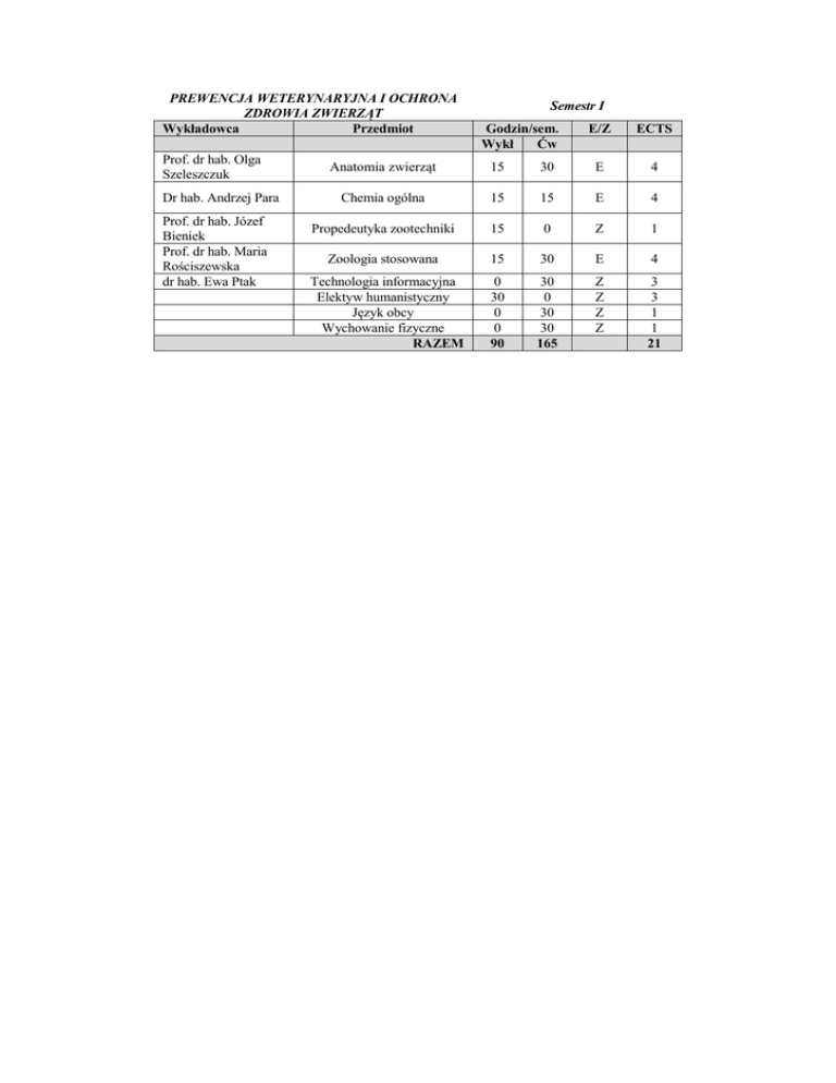 PREWENCJA WETERYNARYJNA I OCHRONA ZDROWIA ZWIERZĄT Wykładowca Przedmiot Prof. dr hab. Olga Szeleszczuk Dr hab. Andrzej Para Prof. dr hab. Józef Bieniek Prof. dr hab. Maria Rościszewska dr hab. Ewa Ptak Semestr I Godzin/sem. Wykł Ćw E/Z ECTS Anatomia zwierząt 15 30 E 4 Chemia ogólna 15 15 E 4 Propedeutyka zootechniki 15 0 Z 1 Zoologia stosowana 15 30 E 4 Technologia informacyjna Elektyw humanistyczny Język obcy Wychowanie fizyczne RAZEM 0 30 0 0 90 30 0 30 30 165 Z Z Z Z 3 3 1 1 21 PREWENCJA WETERYNARYJNA I OCHRONA ZDROWIA ZWIERZĄT Wykładowca Przedmiot Mgr Jacek Wróblewski Dr inż. Krzysztof Tokarz Dr inż. Maria Mika Prof. dr hab. Józef Bieniek Prof. dr hab. Barbara Filipek-Mazur Dr hab. Zbigniew Bonczar, prof. UR Dr inż. Zbigniew Daniel Dr hab. Jacek Kozdrój, prof. UR Semestr II Godzin/sem. Wykł Ćw E/Z ECTS Podstawy prawa i ochrona własności intelektualnych 30 0 E 3 Botanika i fizjologia roślin 15 30 Z 5 Biochemia zwierząt z elementami biofizyki Genetyka zwierząt i metody hodowli Chemia rolna z elementami gleboznawstwa 30 30 E 6 30 30 E 7 15 0 Z 1 Ekologia zwierząt 15 15 E 3 Mechanizacja produkcji zwierzęcej 15 0 Z 1 Mikrobiologia 15 30 E 5 45 40 Z/E 8 0 0 210 30 30 245 Z Z 1 1 41 Przedmioty do wyboru i elektywy Język obcy Wychowanie fizyczne RAZEM PREWENCJA WETERYNARYJNA I OCHRONA ZDROWIA ZWIERZĄT Wykładowca Przedmiot Prof. dr hab. Krystyna Koziec Prof. dr hab Mirosław Kasperczyk dr hab. Bogdan Kulig, prof. nadzw. UR Dr inż. Łukasz Popławski Prof. dr hab. Czesław Klocek Prof. zw. dr hab. Janusz Żmija Semestr III Godzin/sem. Wykł Ćw E/Z ECTS Fizjologia zwierząt 30 30 E 5 Uprawa roślin, łąk i pastwisk 15 30 Z 3 Ekonomia 15 15 Z 4 Ustawodawstwo zootechniczne 15 0 Z 1 Zarządzanie i marketing 15 15 Z 4 45 60 Z/E 10 0 135 30 180 1 1 28 Przedmioty do wyboru i elektywy Język obcy PREWENCJA WETERYNARYJNA I OCHRONA ZDROWIA ZWIERZĄT Wykładowca Przedmiot Prof. dr hab. Krystyna Koziec Prof. dr hab. lek wet Jerzy Niedziółka Dr hab. Micek Piotr Prof. dr hab. Zygmunt Gil Dr Z. Podstawski Dr hab. Ewa Kapkowska, prof. UR Prof. dr hab. Czesław Klocek Semestr IV Godzin/sem. Wykł Ćw E/Z ECTS Endokrynologia ogólna 15 0 Z 2 Prewencja zootechniczna 15 15 E 4 Żywienie zwierząt i paszoznawstwo 15 30 E 4 Hodowla bydła 15 15 E 3 Hodowla psów i kotów 15 15 Z 3 Hodowla drobiu 15 15 Z 3 Rozród zwierząt 15 30 Z 3 Etologia 15 0 Z 1 Praktyka zawodowa Przedmioty do wyboru i elektywy Język obcy RAZEM 4 tyg. Zal. 45 45 Z/E 6 0 165 30 210 E 2 31 PREWENCJA WETERYNARYJNA I OCHRONA ZDROWIA ZWIERZĄT Wykładowca Przedmiot Prof. dr hab. Maria Kulisa Dr inż. Maciej Murawski Prof. dr hab. Cz. Klocek Prof. dr hab. Piotr Zapletal. Dr hab. Piotr Micek Dr inż. Marta Skalska Prof. dr hab. Krystyna Koziec dr hab. Barbara Tombarkiewicz Semestr V Godzin/sem. Wykł Ćw E/Z ECTS Hodowla koni 15 15 E 3 Hodowla owiec i kóz 15 15 E 3 Hodowla trzody chlewnej 15 15 E 3 Higiena mleka 15 15 E 3 Higiena pasz 15 0 Z 2 Parazytologia 15 15 E 3 Patofizjologia 15 0 Z 2 Ochrona środowiska 15 0 Z 1 Przedmioty do wyboru i elektywy 60 90 Z/E 10 180 165 30 PREWENCJA WETERYNARYJNA I OCHRONA ZDROWIA ZWIERZĄT Wykładowca Przedmiot Dr inż. Stanisław Łapiński Dr inż. Piotr Niedbała Dr Krzysztof Andres, Dr hab. Hanna Lutnicka Prof. dr hab. Zygmunt M. Kowalski Prof. dr hab. Zygmunt M. Kowalski Prof. dr hab. J. Niedziółka Prof. dr hab. lek wet Jerzy Niedziółka Dr Władysław Rutkowski W Katedrach Dr hab. H. Lutnicka Hodowla zwierząt futerkowych Semestr VI Godzin/sem. Wykł Ćw E/Z ECST 15 15 E 3 Podstawy immuno i cytogenetyki Profilaktyka w chowie i hodowli ryb Prewencja żywieniowych zaburzeń metabolicznych 15 15 E 3 15 15 E 3 15 0 Z 1 Dietetyka 15 0 Z 1 15 0 Z 1 15 15 Ustawodawstwo weterynaryjne Wybrane aspekty ochrony zdrowia zwierząt w krajach Unii Europejskiej Seminarium dyplomowe Przedmioty do wyboru i elektywy Praktyka zawodowa RAZEM 30 15 Z 1 60 Z/E 8 E 5 34 4 tygodnie 125 135 Praktyka zawodowa - 4 tygodnie w okresie wakacji (po 6 semestrze) 3 5 PREWENCJA WETERYNARYJNA I OCHRONA ZDROWIA ZWIERZĄT Wykładowca Przedmiot Prof. dr hab. lek wet Jerzy Niedziółka Przedmiot startuje 14/15 w zamian za dobrostan i ochronę zwierząt Dr hab. Hanna Lutnicka Dr inż. Urszula Kaczor prof. dr hab. Adam Okólski Prof. dr hab. J. Niedziółka Dr n. wet. W. Rutkowski Prof. dr hab. Piotr Zapletal. dr hab. H. Lutnicka Dr hab. Ewa Kapkowska, prof. UR Semestr VII Godzin/sem. Wykł Ćw E/Z ECTS E 3 Dobrostan i ochrona zwierząt 15 15 Higiena i dobrostan zwierzat (od roku Akad. 14/15 wymiar 15/30 15 30 Toksykologia 20 10 Z 2 Analityka i diagnostyka molekularna w hodowli zwierząt 15 30 E 5 Profilaktyka zootechniczna 15 30 Z 3 Ochrona zdrowia publicznego 15 0 Z 2 Towaroznawstwo surowców i produktów pochodzenia zwierzęcego 15 15 Z 3 Seminarium dyplomowe 0 15 Z 2 30 Z 45 60 Z/E 140 220 Seminarium Zootechniczne Przedmioty do wyboru i elektywy RAZEM 10 30